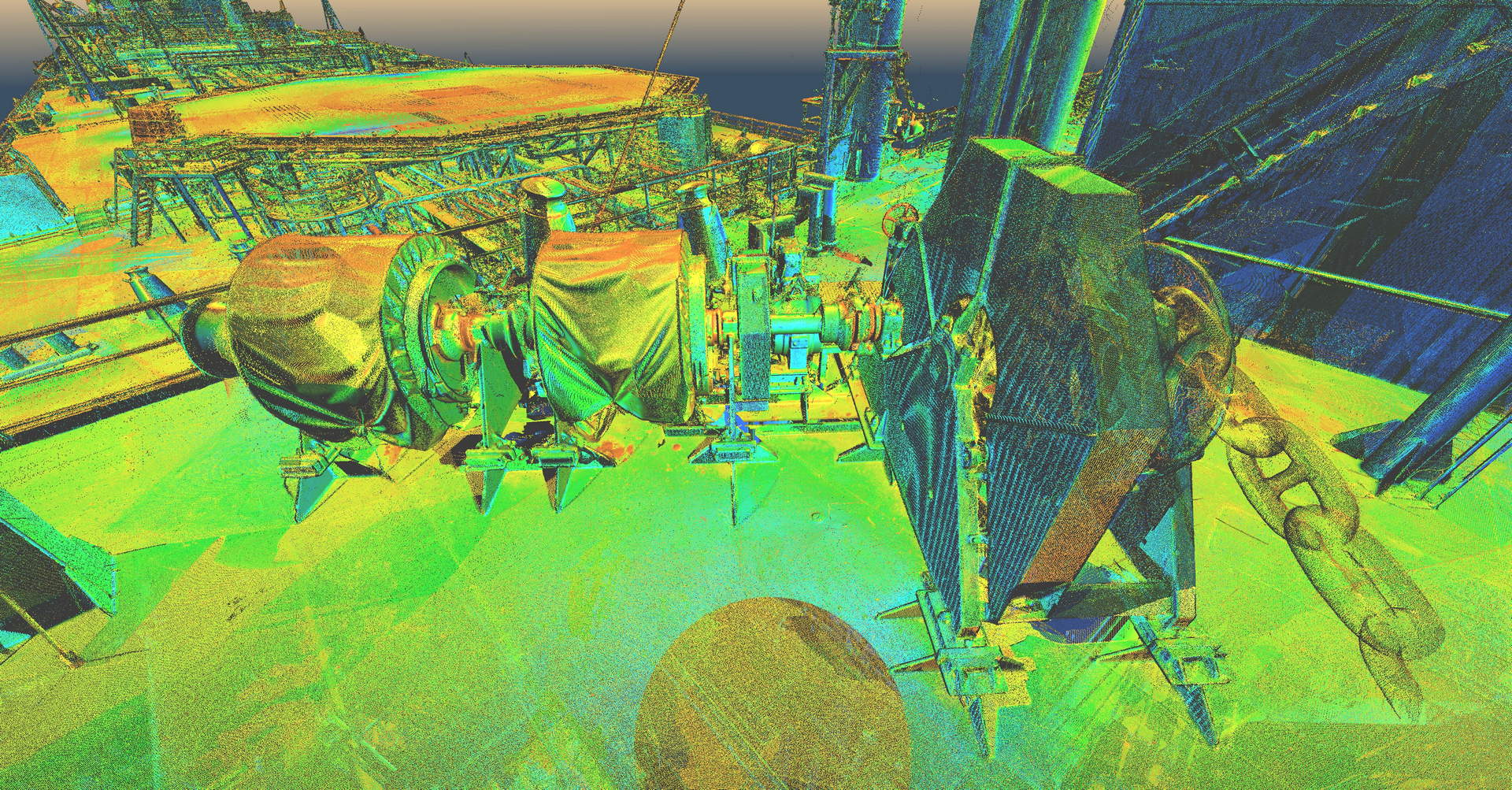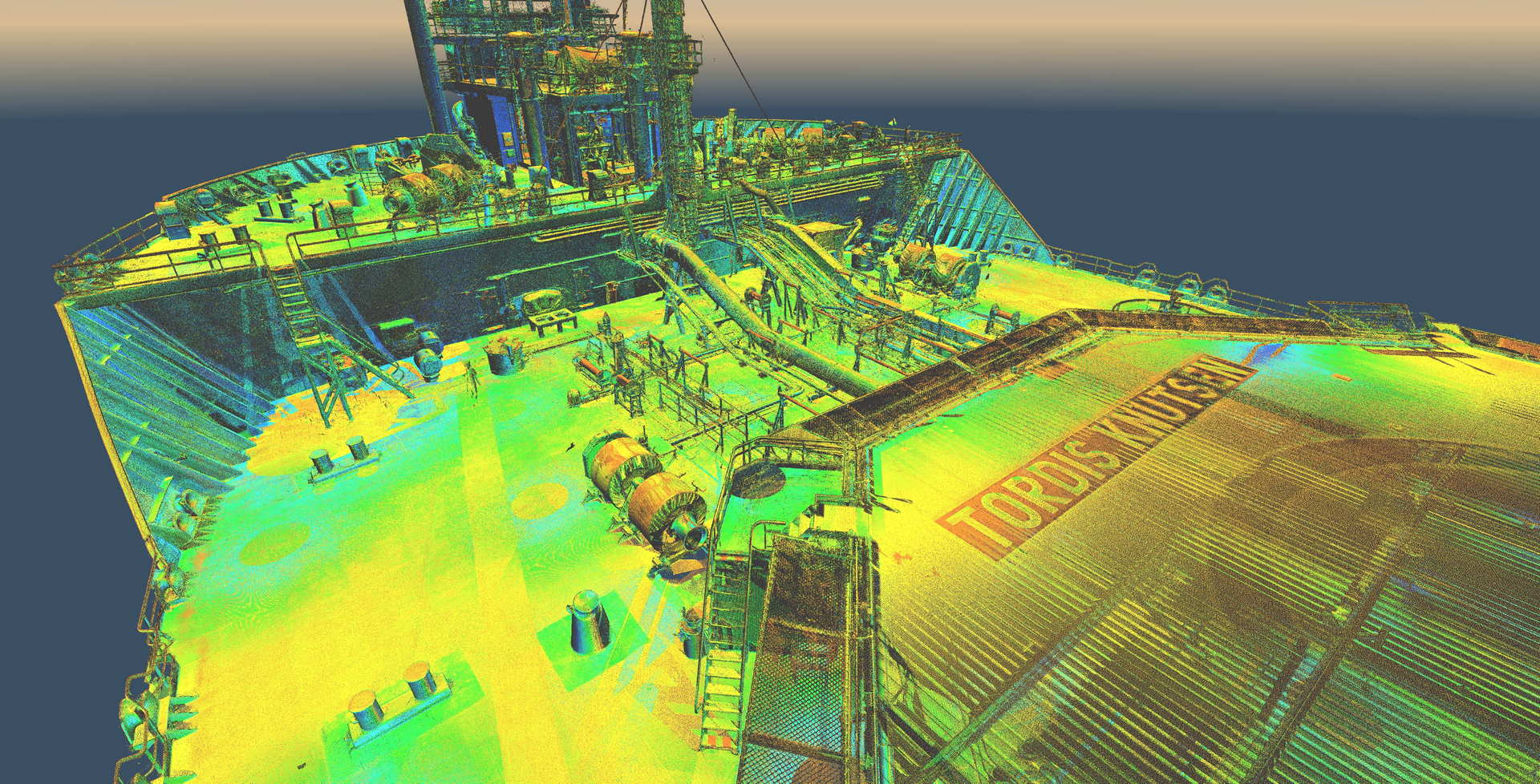 Die Fertigstellung der Kontrolle war besonders herausfordernd, da das Schiff immer noch schwimmend war und Bewegungen auftraten. Bei 3Deling haben wir unseren eigenen maßgeschneiderten Prozess für die Durchführung von Kontrollmessungen in genau solchen Situationen entwickelt. Das endgültige Produkt war eine registrierte, teilweise farbige Punktwolke. Die gelieferten Daten wurden nicht nur zur Unterstützung von Designarbeiten für die Modernisierung verwendet, sondern auch zur Berechnung der Menge an Schrottmetall, die entfernt werden musste.
