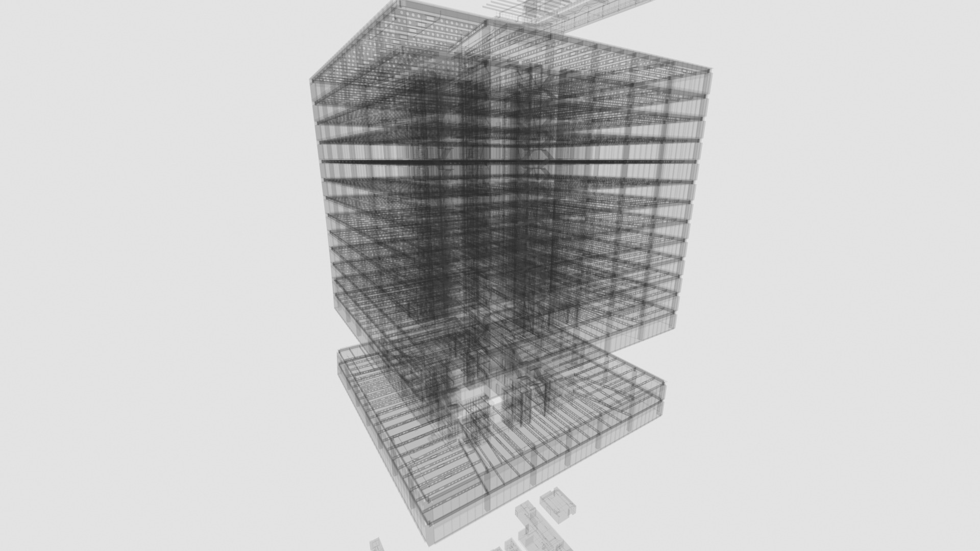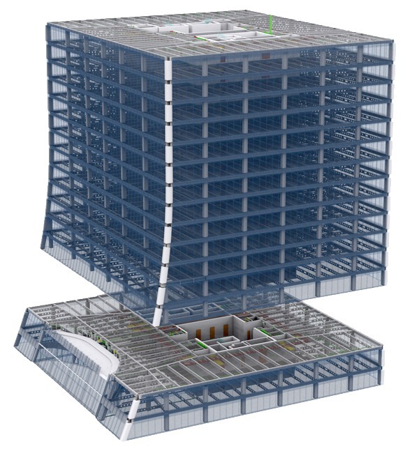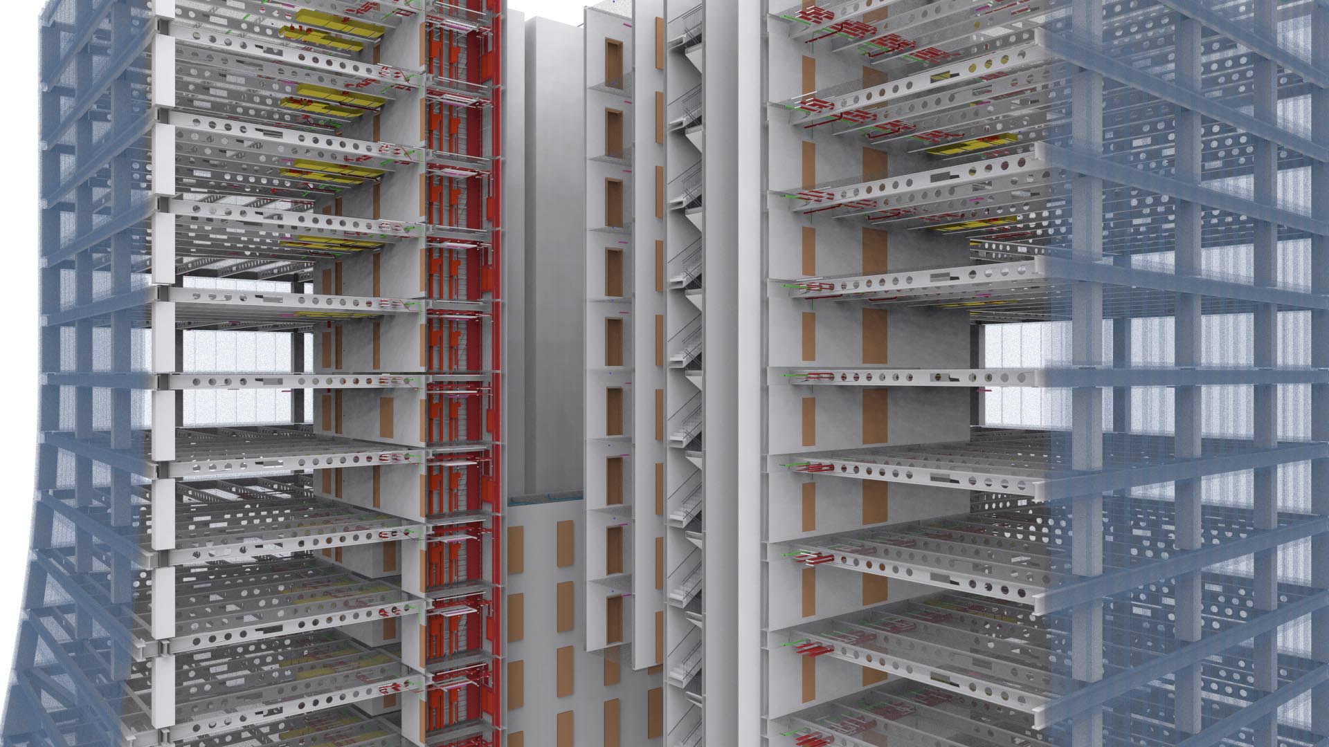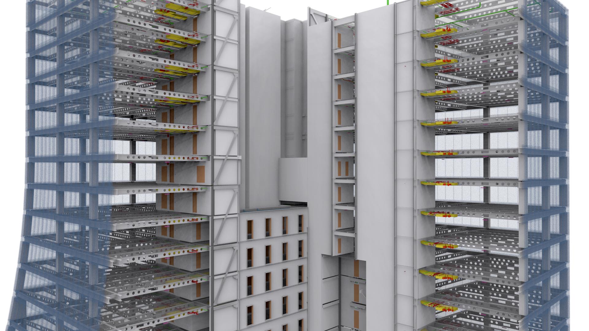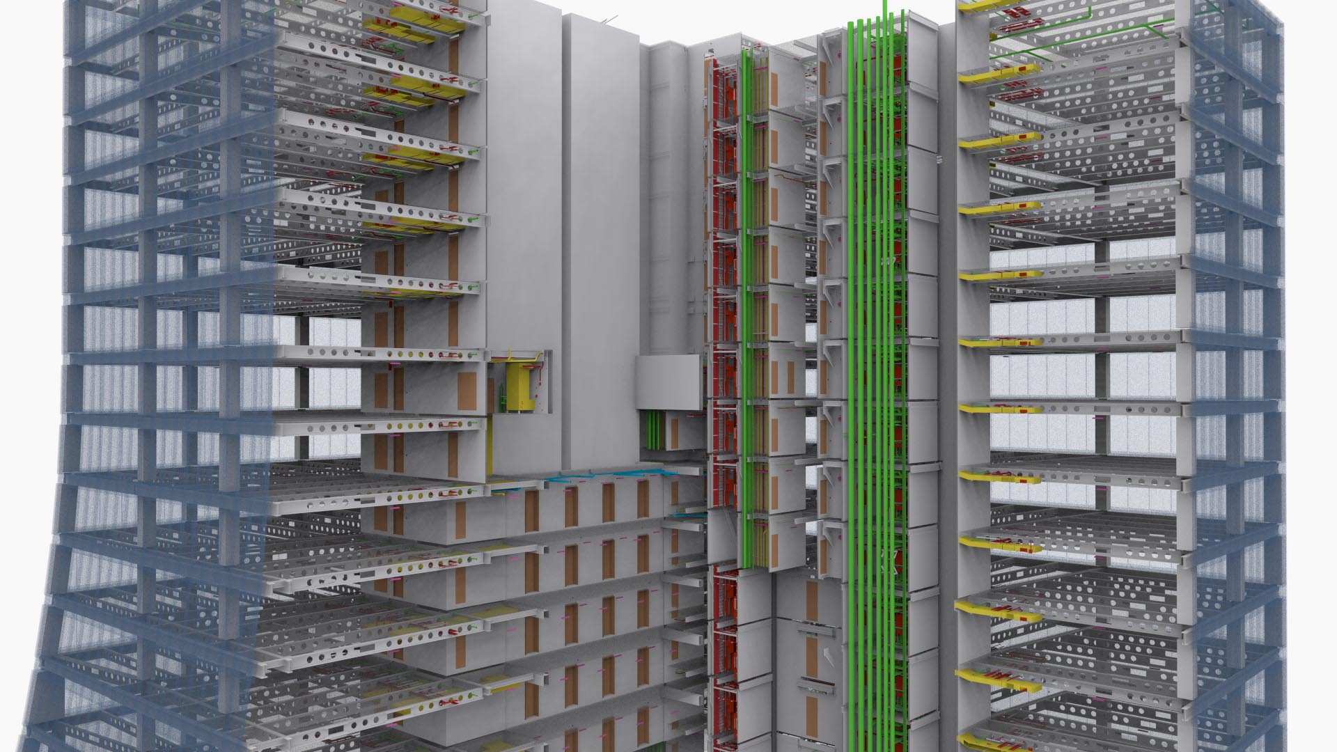 Der Umfang des Projekts umfasste 3D-Laserscanning und 3D-BIM-Modellierung eines neu errichteten Bürogebäudes. Ein Kunde beschloss, nur die letzten 15 Stockwerke des Gebäudes, das Dach- und Kellergeschoss, alle Treppenhäuser und den Außenbereich as-built zu modellieren. Trotz dieser Einschränkung erwies sich das Projekt als ziemlich groß: Wir haben etwa 1500 einzelne Scans positioniert, die mit Hilfe unabhängiger Kontrollpunkte registriert wurden. Die gesamte Aufgabe war hauptsächlich aufgrund der Höhe des Gebäudes herausfordernd.