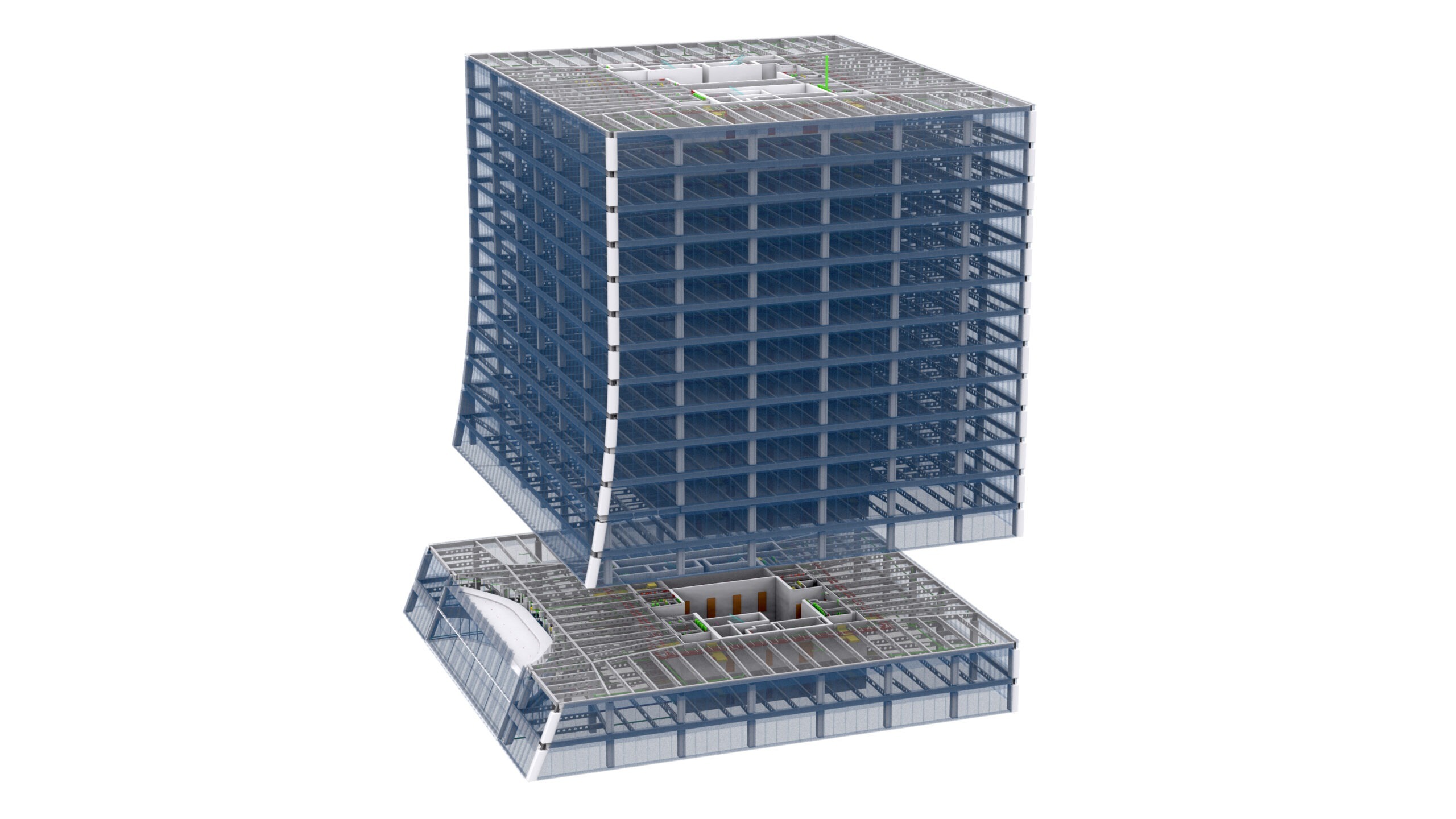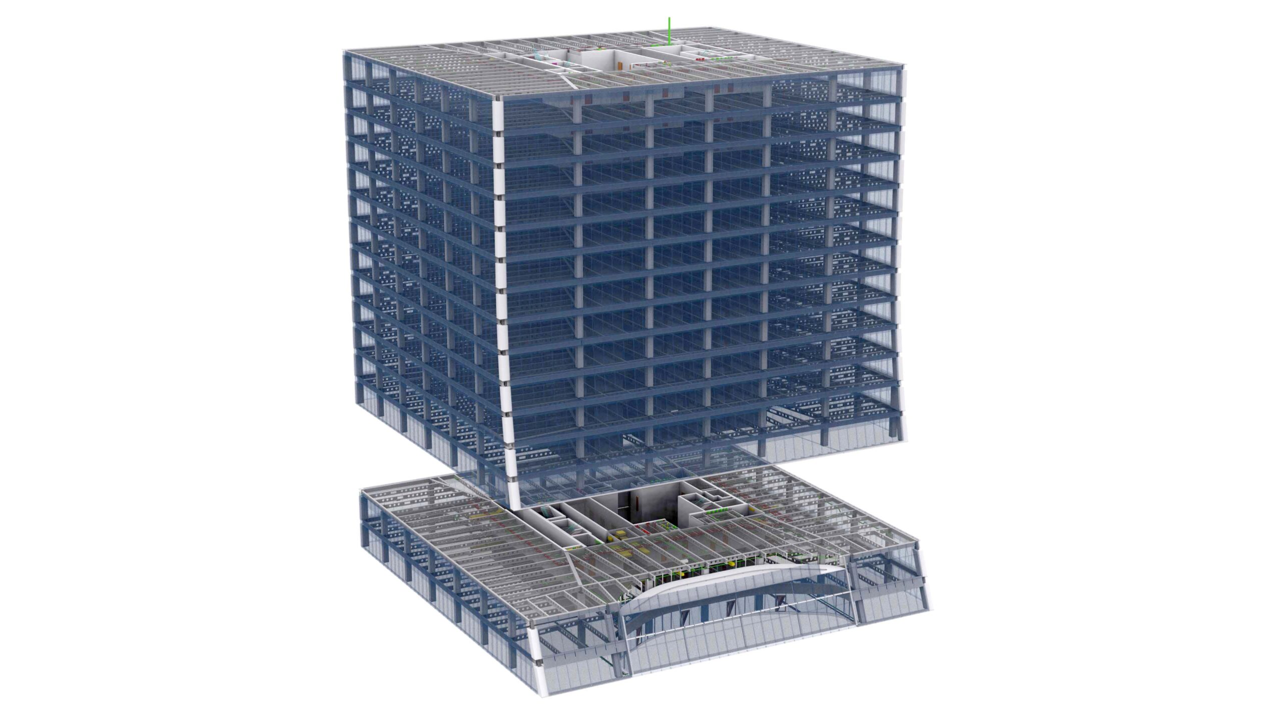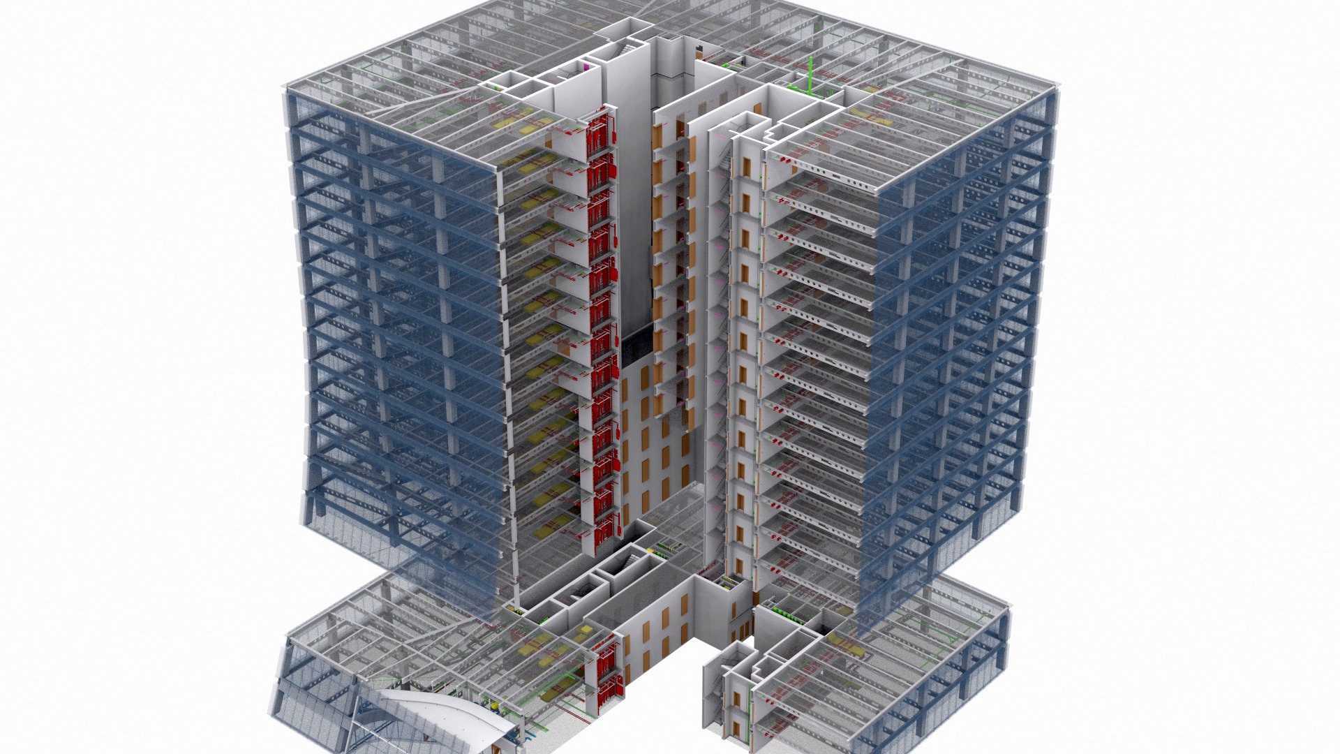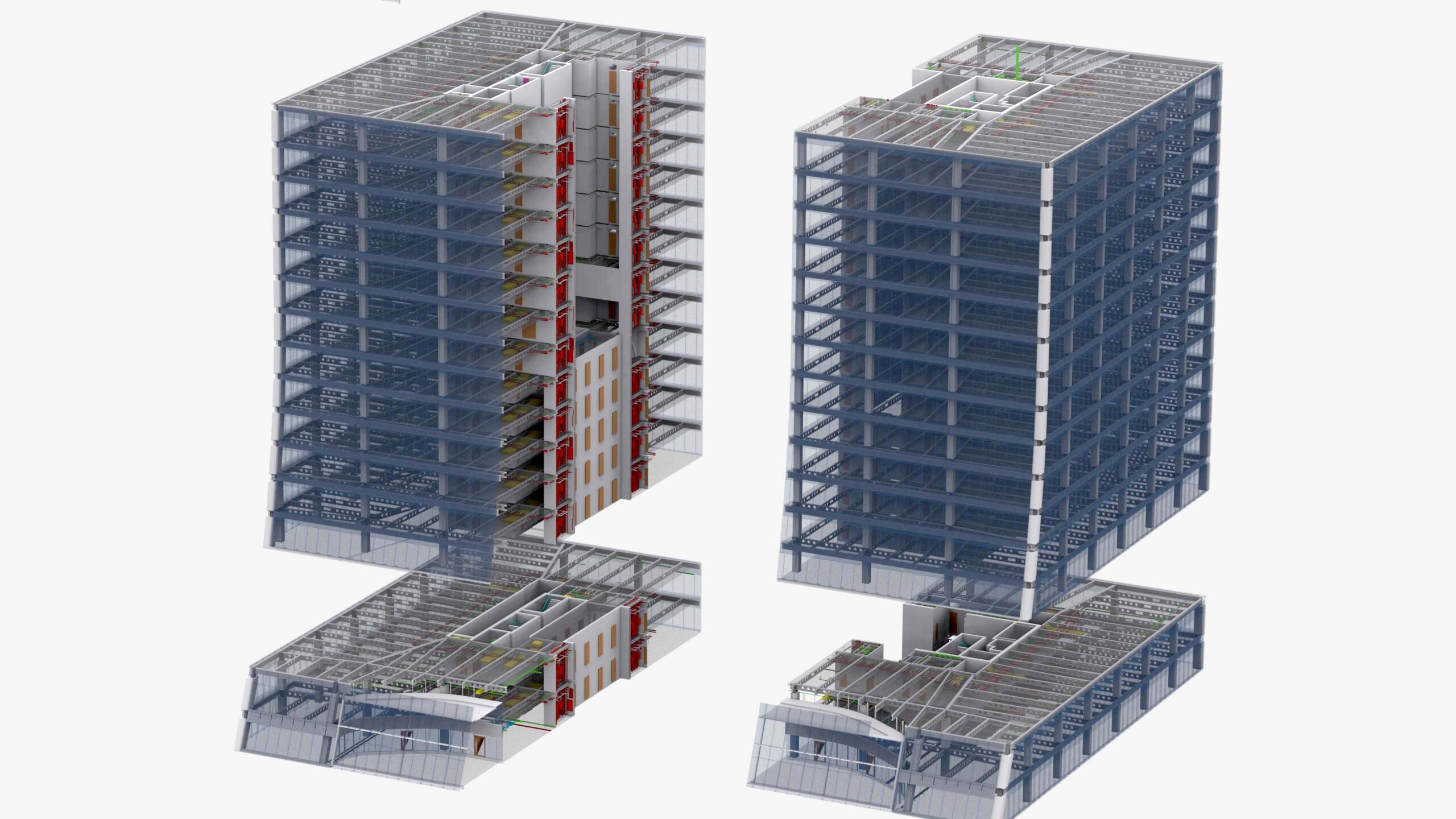 Punktwolke in Graustufen und OS, BIM-Modell Strukturell + MEP als LOD4-Modell, geliefert in Autodesk Revit für 15 Stockwerke intern, 2D-Dokumentation generiert basierend auf dem 3D-Modell.