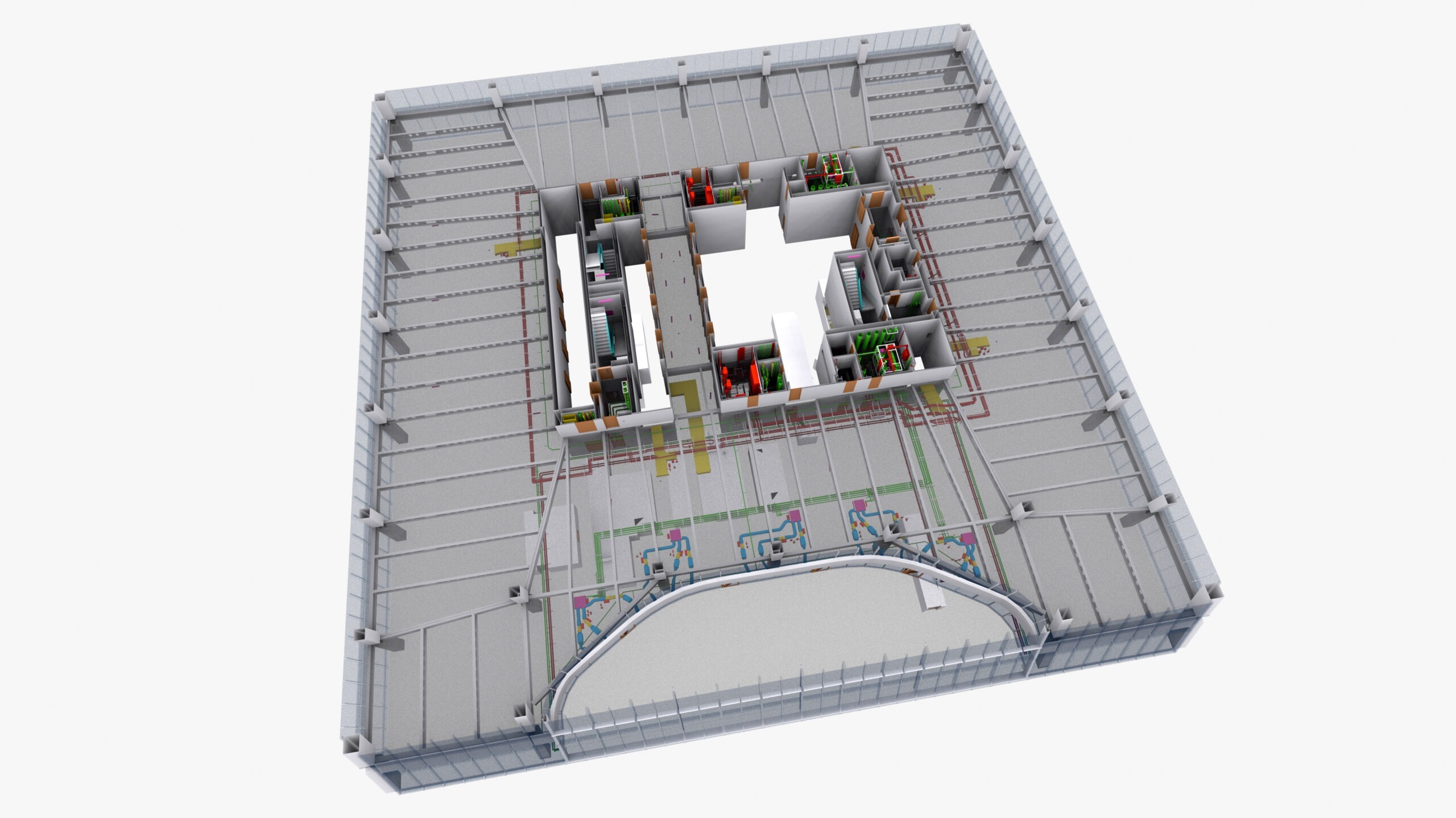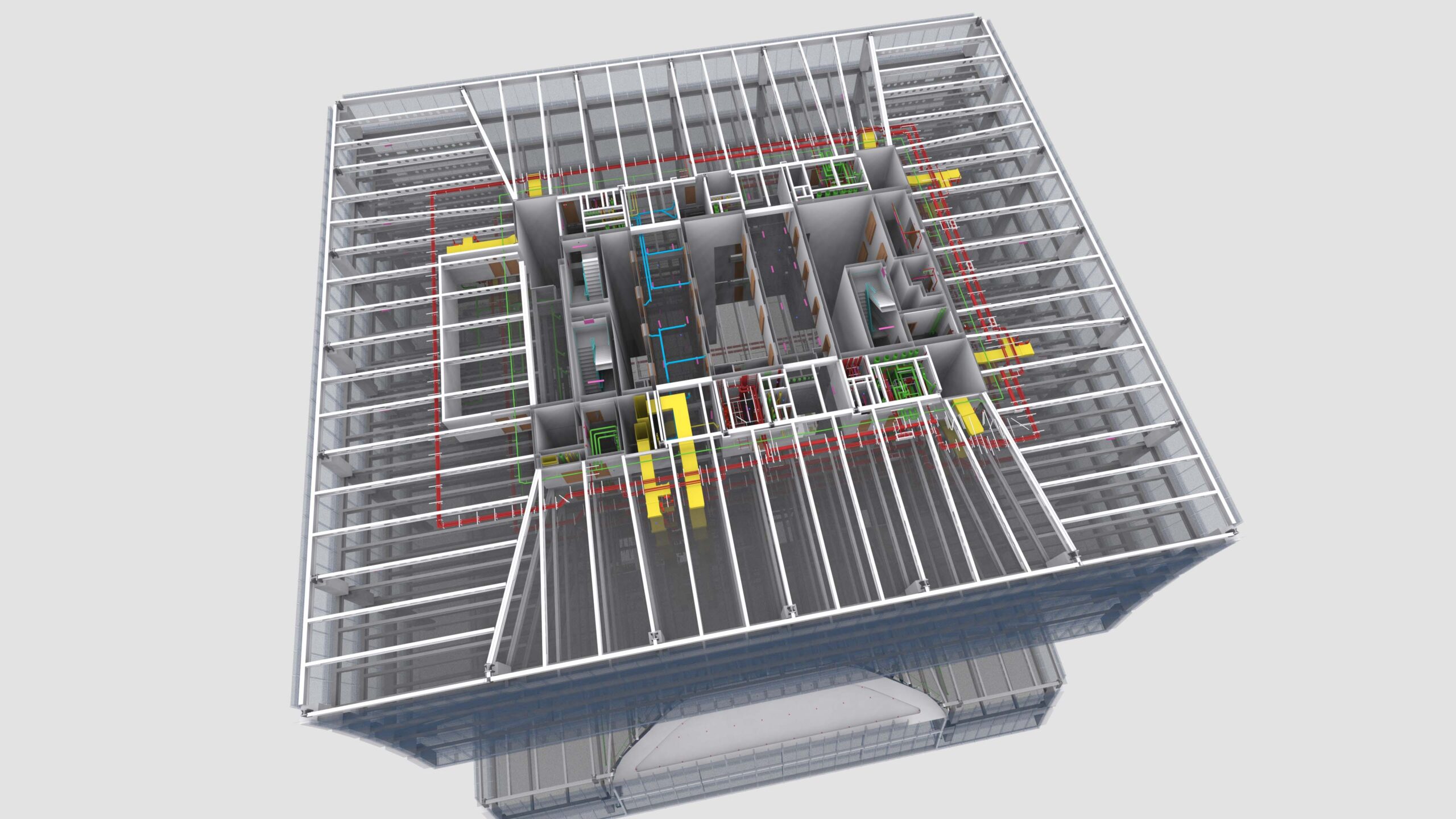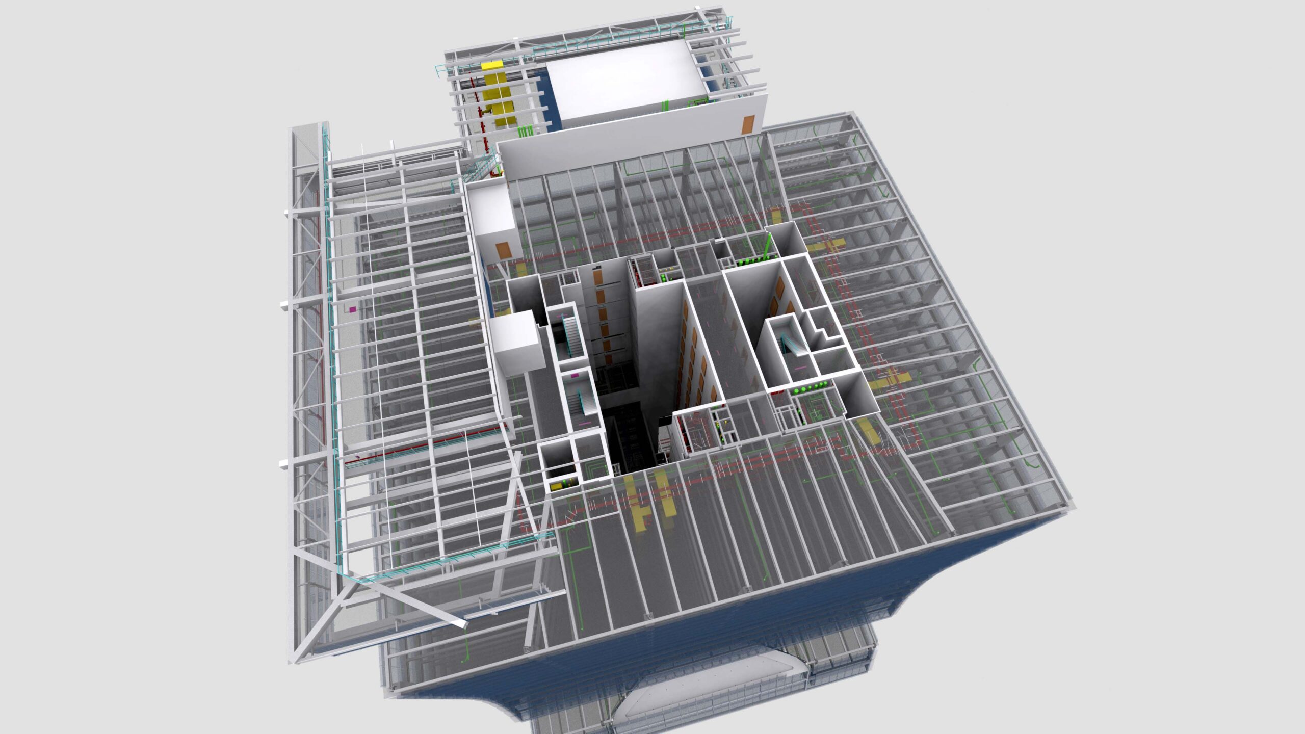Wir haben das BIM-Modell mit LoD 4 (Detailstufe) so erstellt, dass die Grundrisse und Abschnitte von jedem Stockwerk mit allen Anmerkungen generiert werden können. Das BIM-Modell umfasste alle MEP-Dienstleistungen.