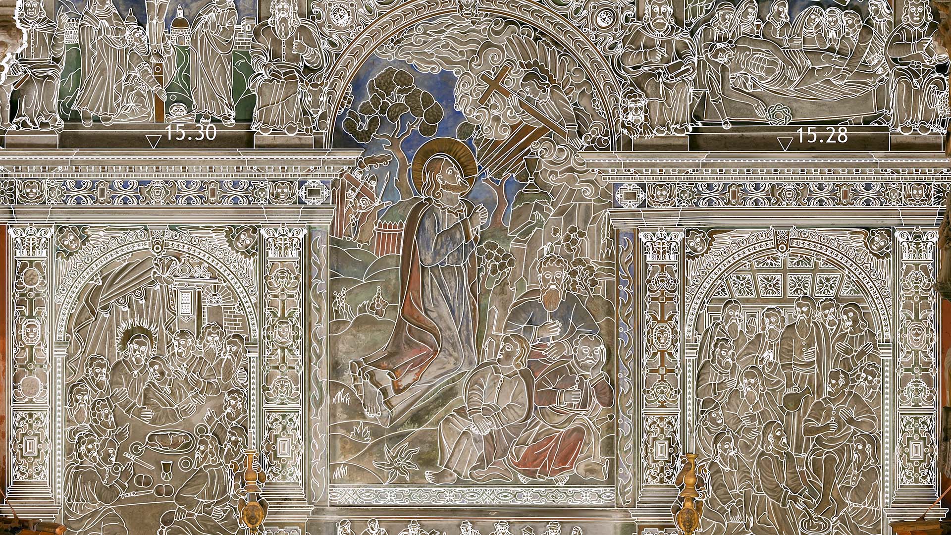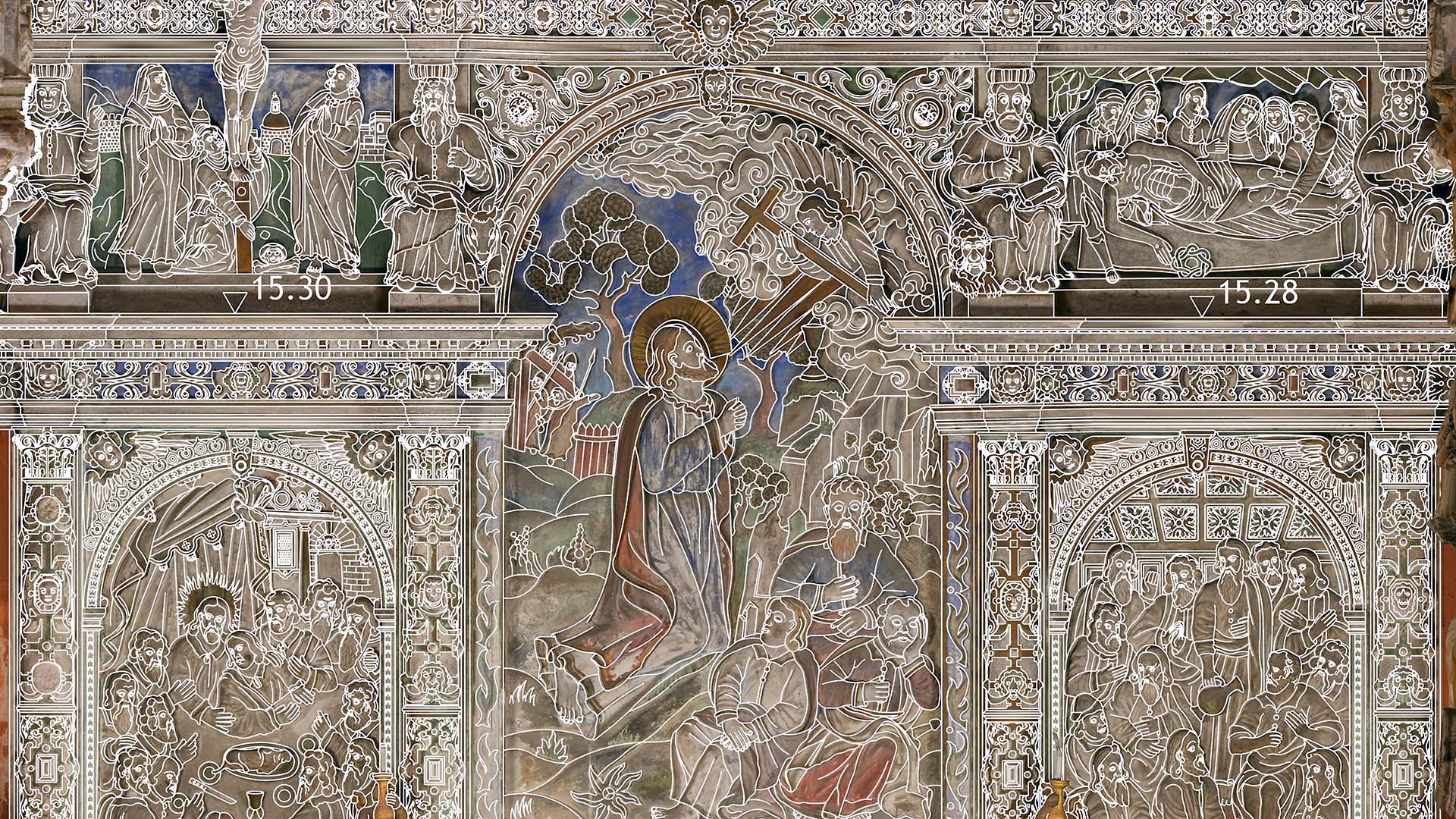 Während der Vermessung nutzten wir neben der regulären Laserscanning-Technologie auch eine Drohne und eine Kamera, die an einem Mast befestigt war. Zusätzlich montierten wir ein spezielles Gerüst innerhalb der Kapelle, um alle Details des Innenraums zu erfassen. Auf diese Weise gelang es uns, präzise Laserscan- und fotografische Daten zu erhalten. Später verarbeiteten wir diese Eingangsdaten, um eine photogrammetrische Dokumentation der Kapelle sowie eine detaillierte 2D-CAD-Dokumentation und ein High-Poly-3D-Mesh-Modell zu erstellten.