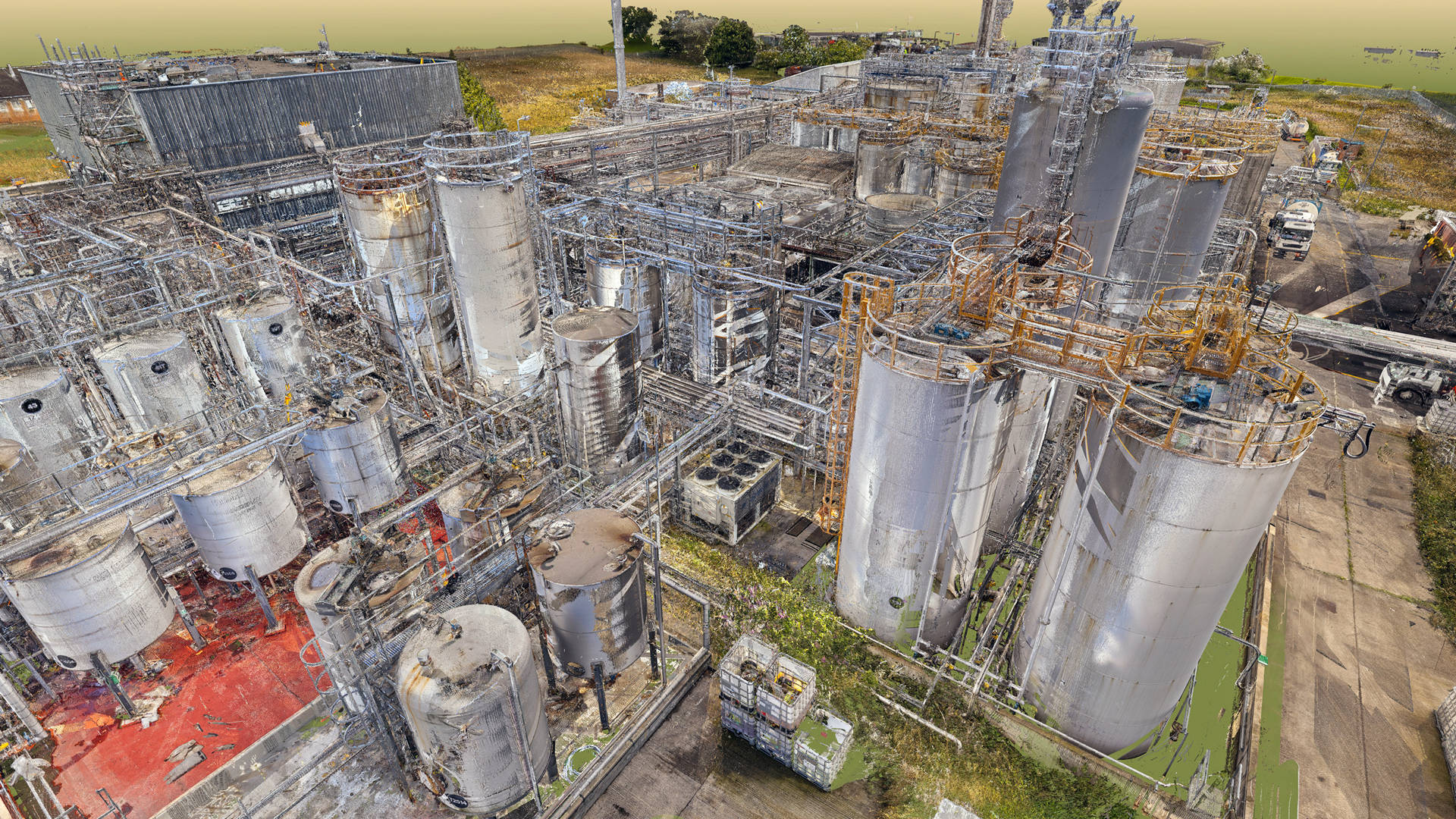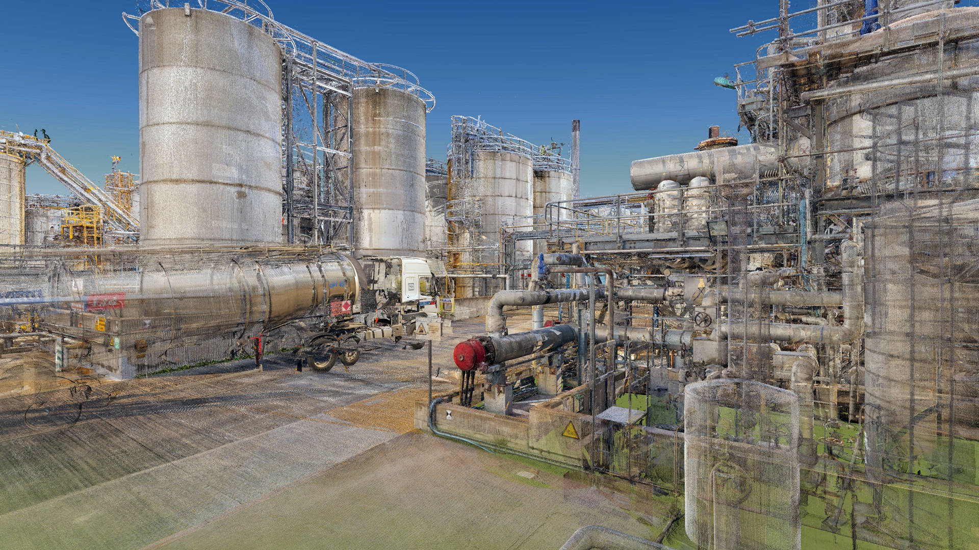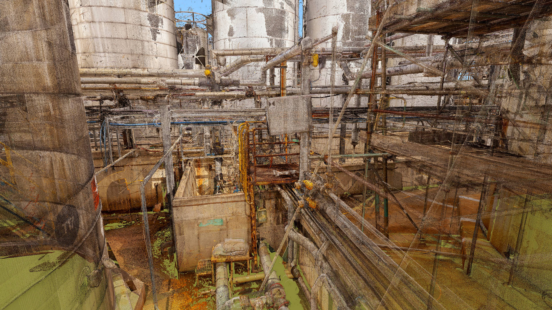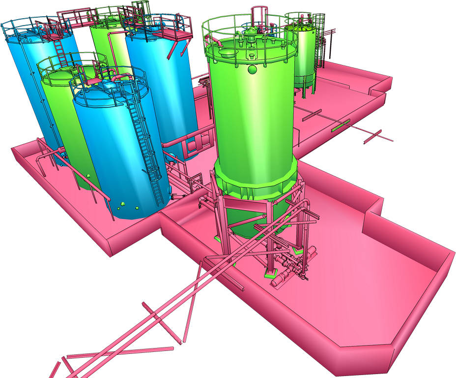 Neben Vermessungs- und Modellierungsarbeiten an dieser Stelle haben wir weitere digitale Analysearbeiten durchgeführt, einschließlich Kollisionserkennung für neue Installationen, Tankleckageanalyse und Empfehlungen für die Installation von Barrieren und Auffangwannen zur Begrenzung des Ausmaßes von Flüssigkeitsleckagen.