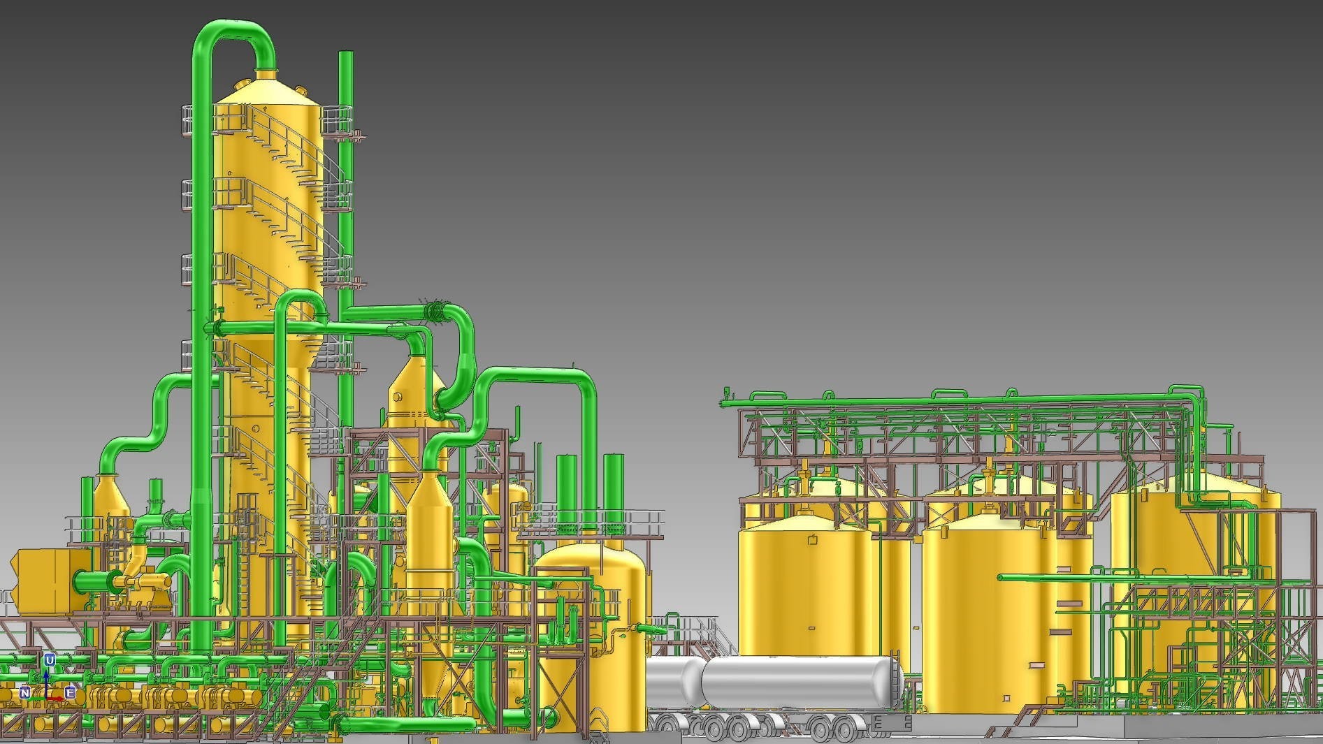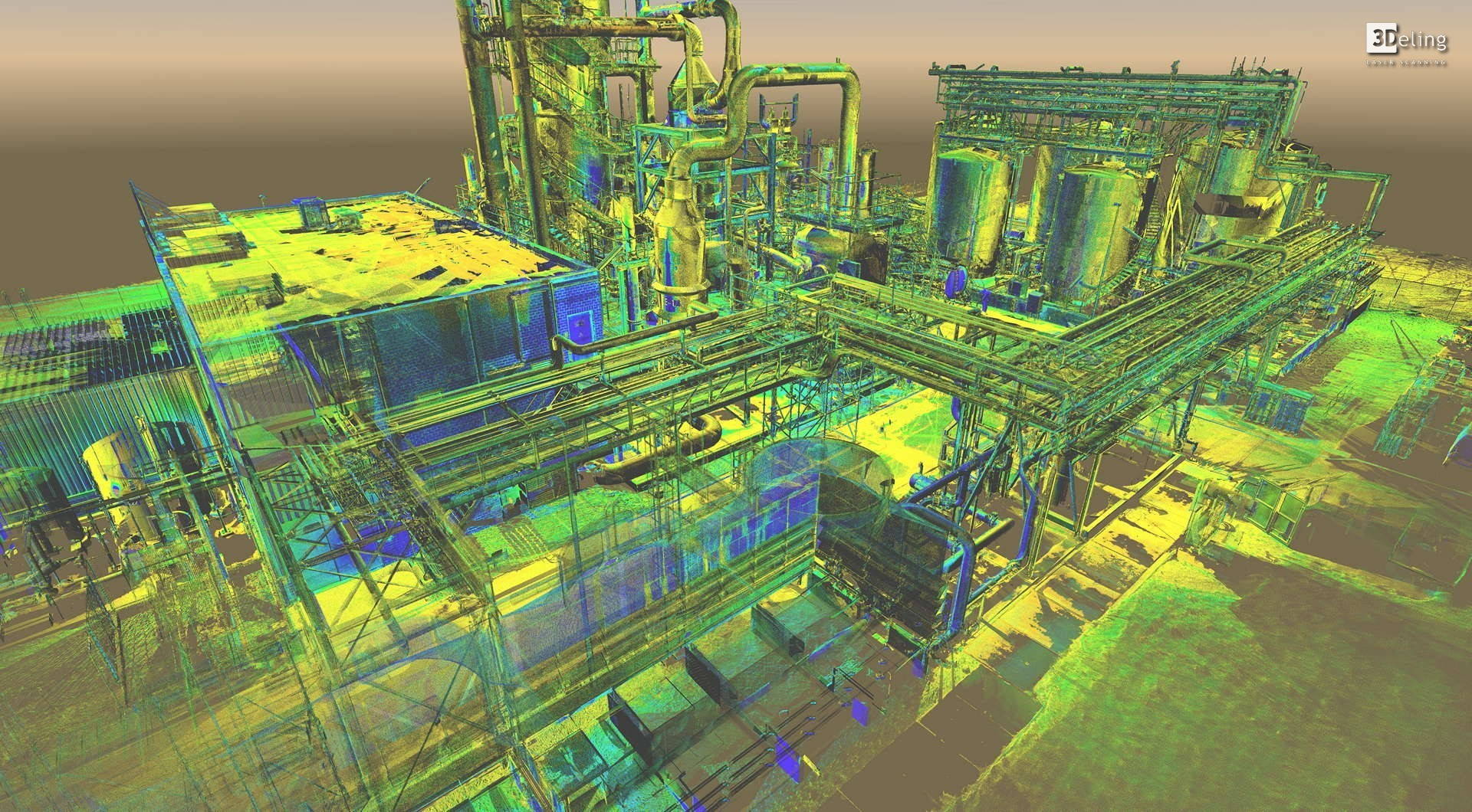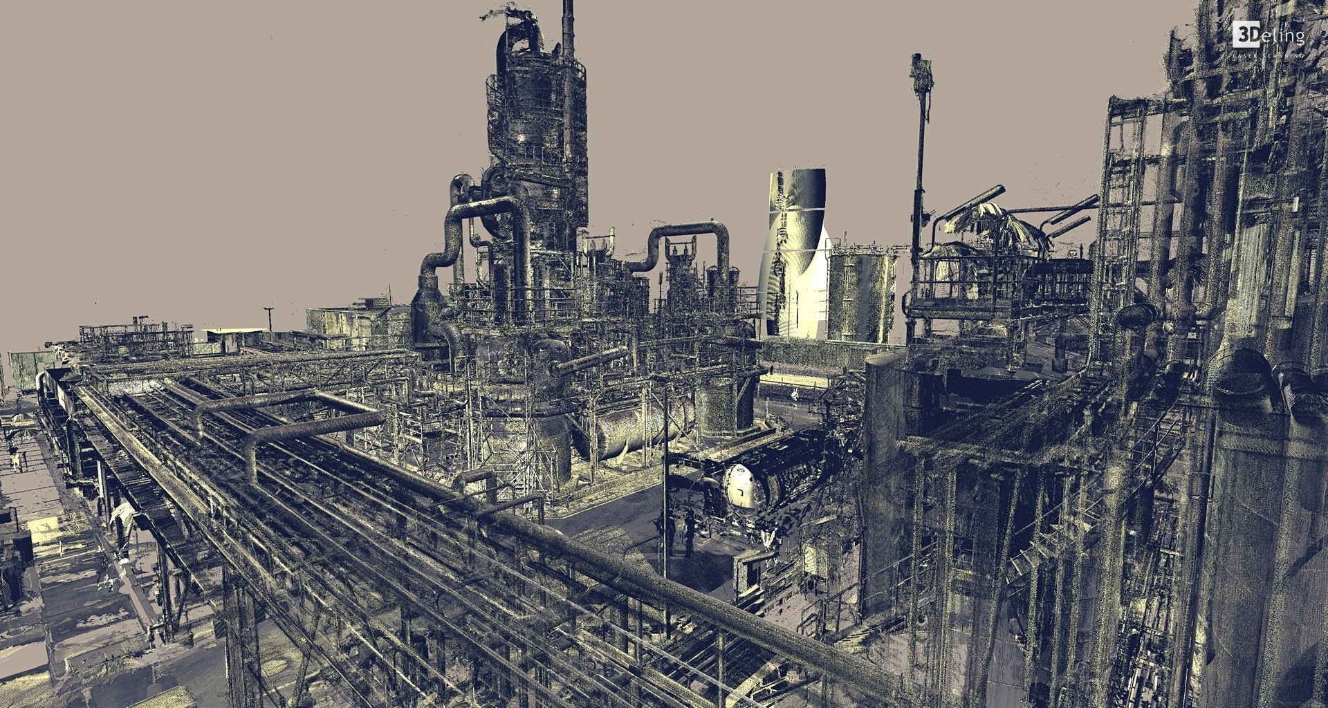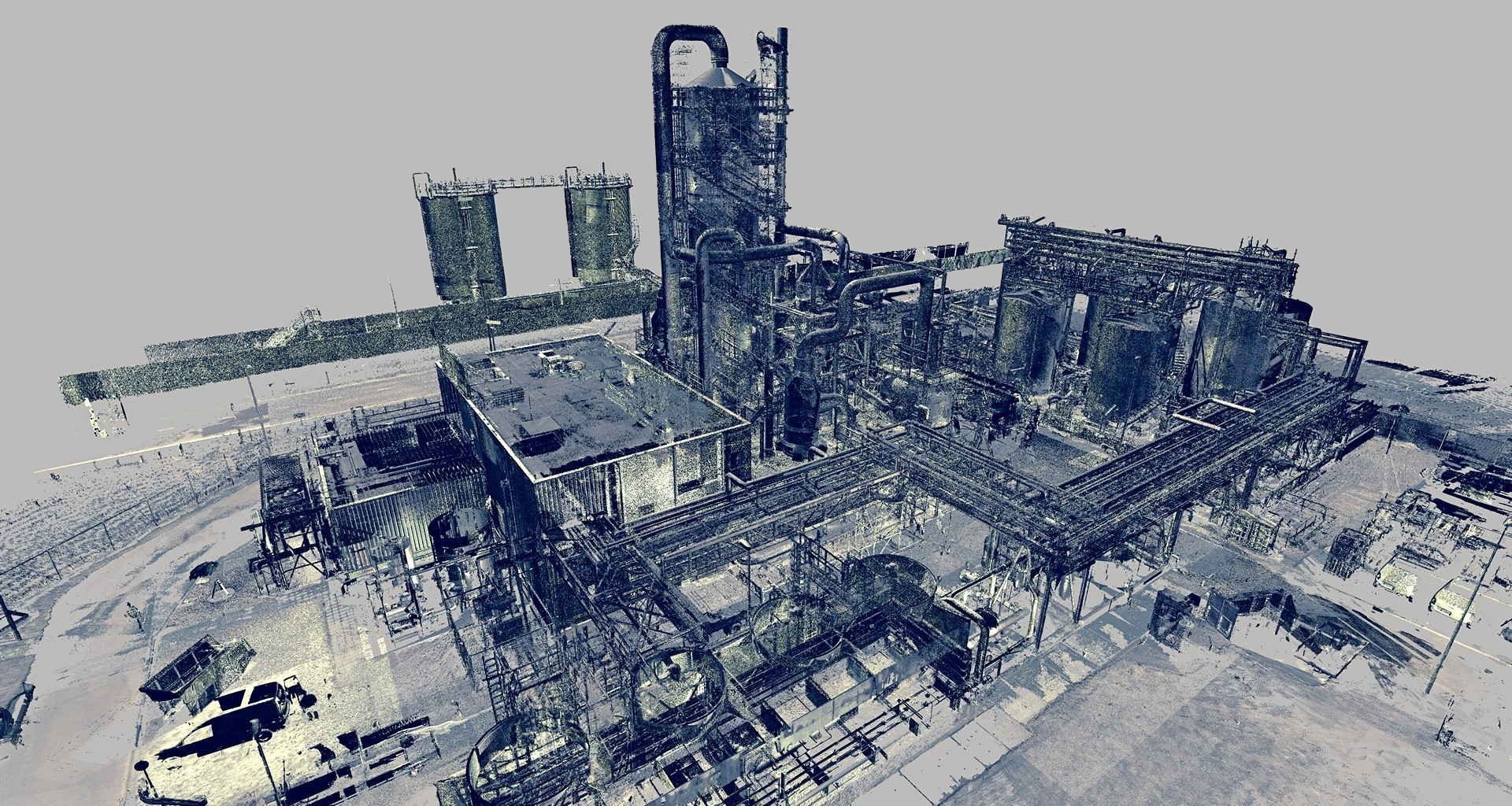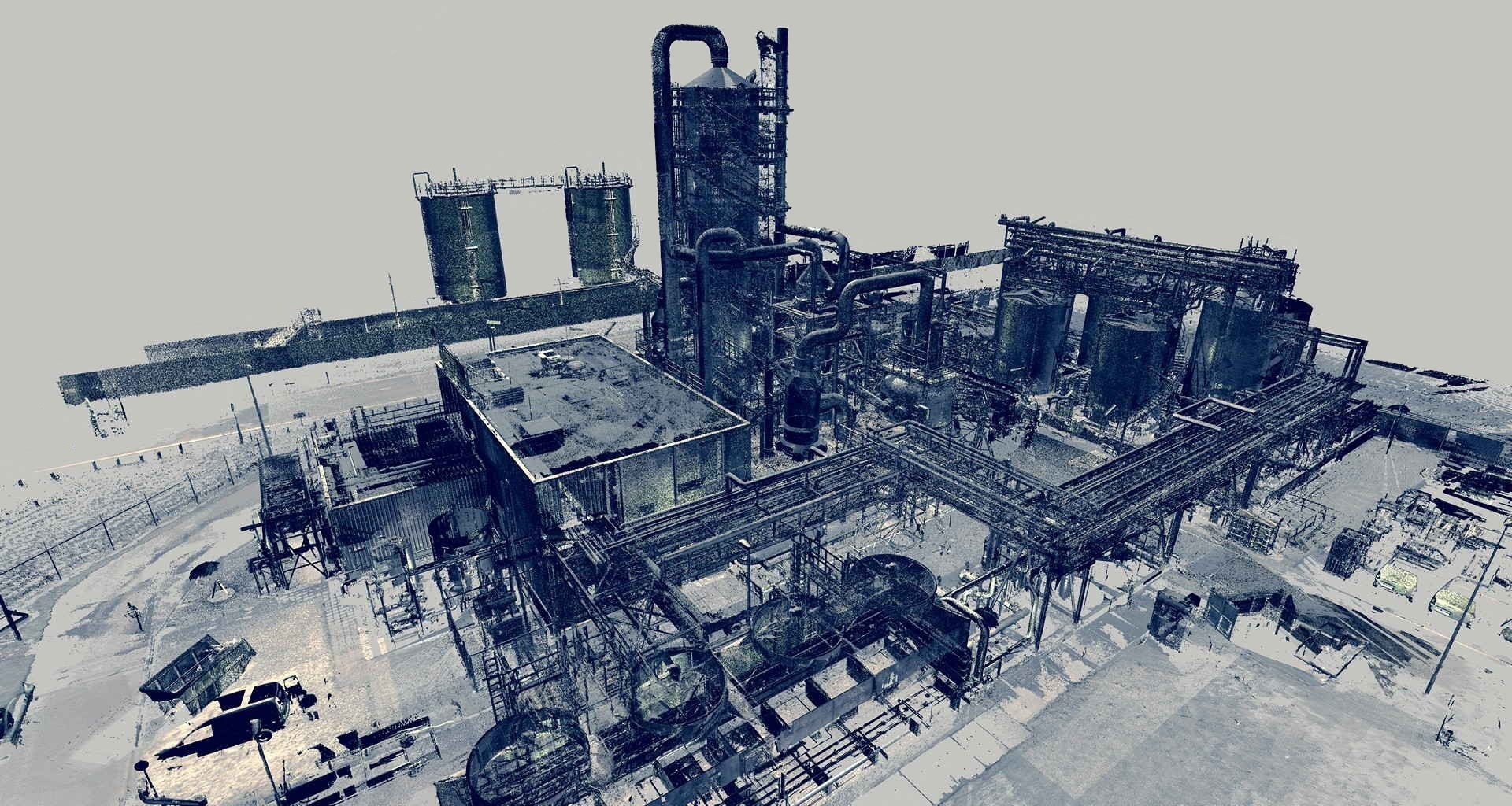 Da die Anlage während des Vermessungsprozesses in Betrieb blieb, musste man auf günstige Windbedingungen warten, um einzelne Scans abzuschließen. Nach dem Erfassen des Punktwolken wurde 3Deling beauftragt, ein AVEVA PDMS-Modell mit vollständigem Katalog zu erstellen.