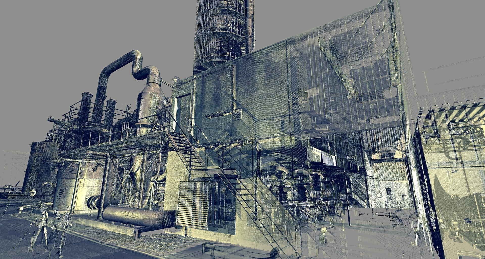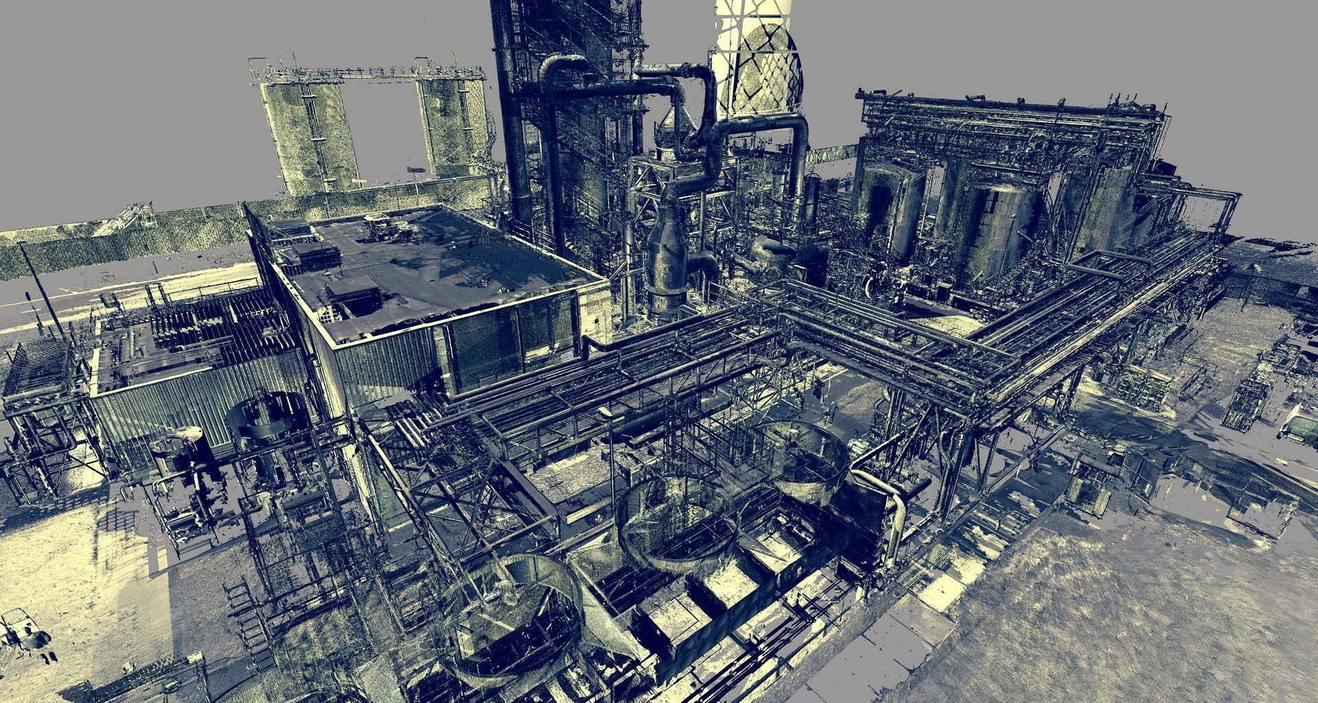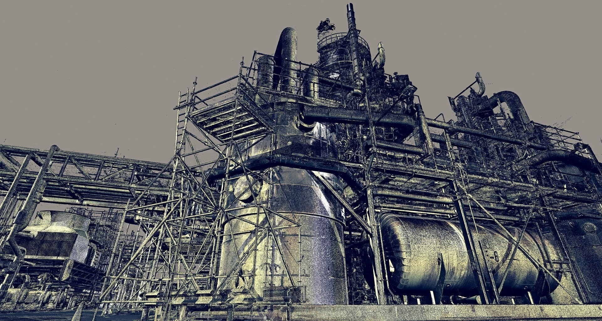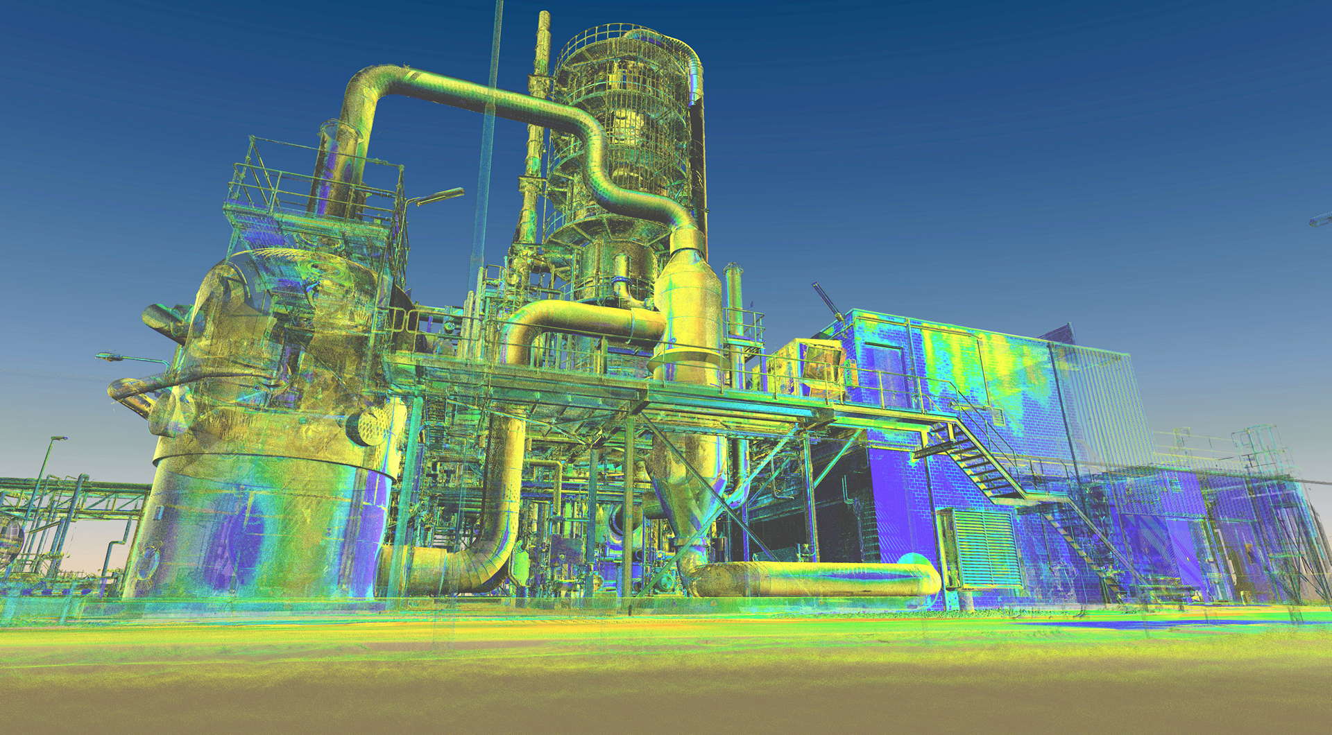 Diese mittelgroße chemische Anlage in den Niederlanden wurde vollständig mit TruView laser gescannt, wobei Intensitätsfarben generiert wurden. Diese Seite war besonders herausfordernd zu bearbeiten aufgrund der Anwesenheit von dichten Dampfwolken an vielen Orten.