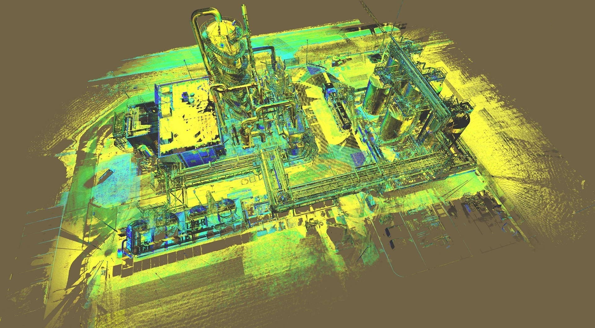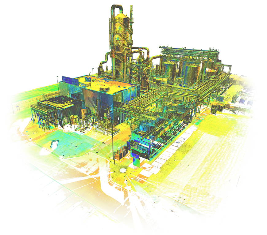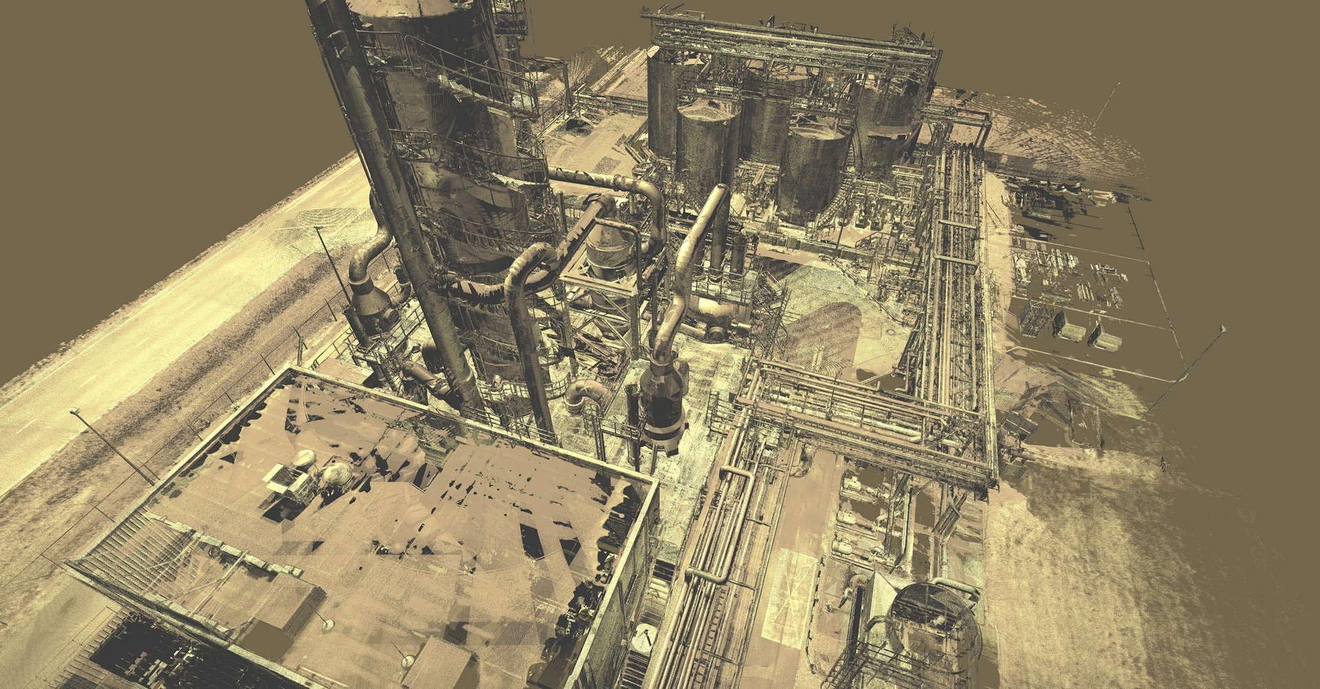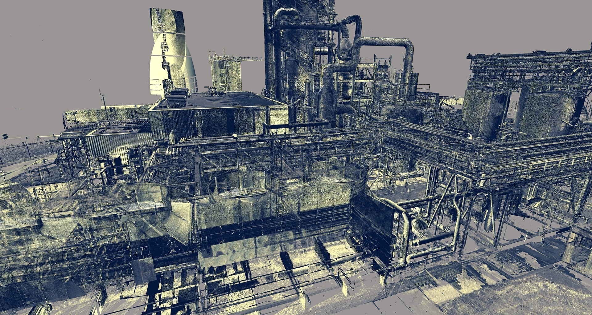 Diese mittelgroße chemische Anlage in den Niederlanden wurde vollständig mit TruView laser gescannt, wobei Intensitätsfarben generiert wurden. Diese Seite war besonders herausfordernd zu bearbeiten aufgrund der Anwesenheit von dichten Dampfwolken an vielen Orten.