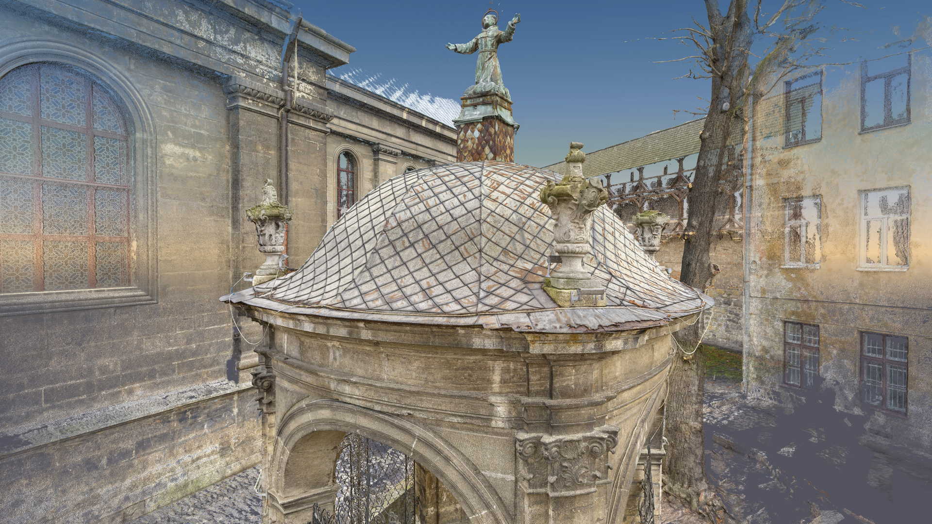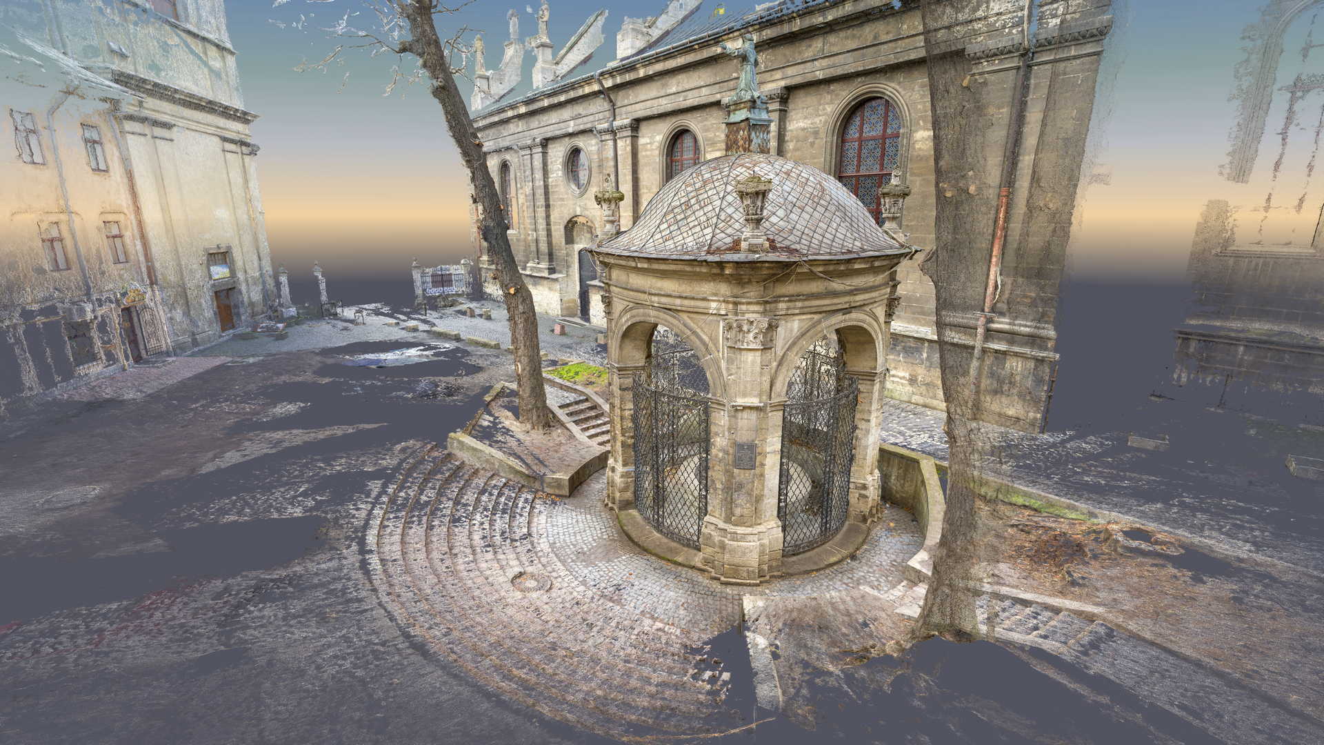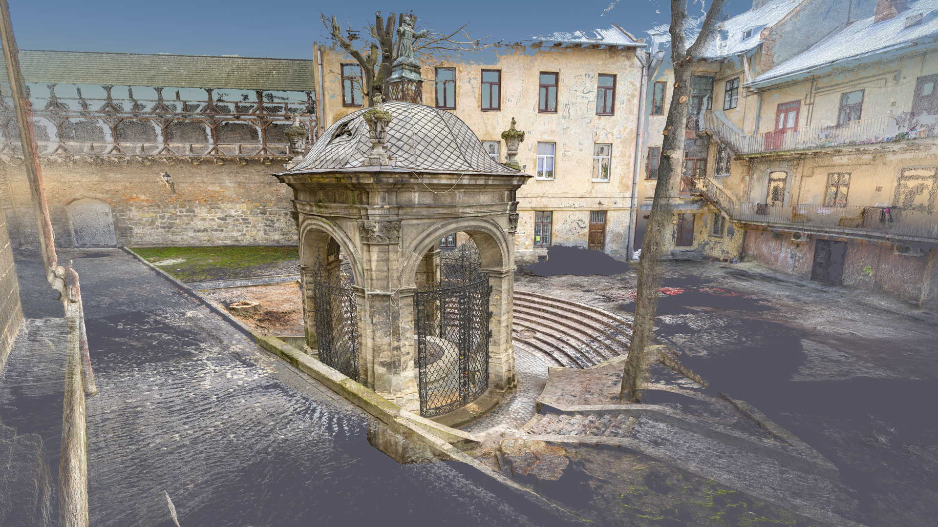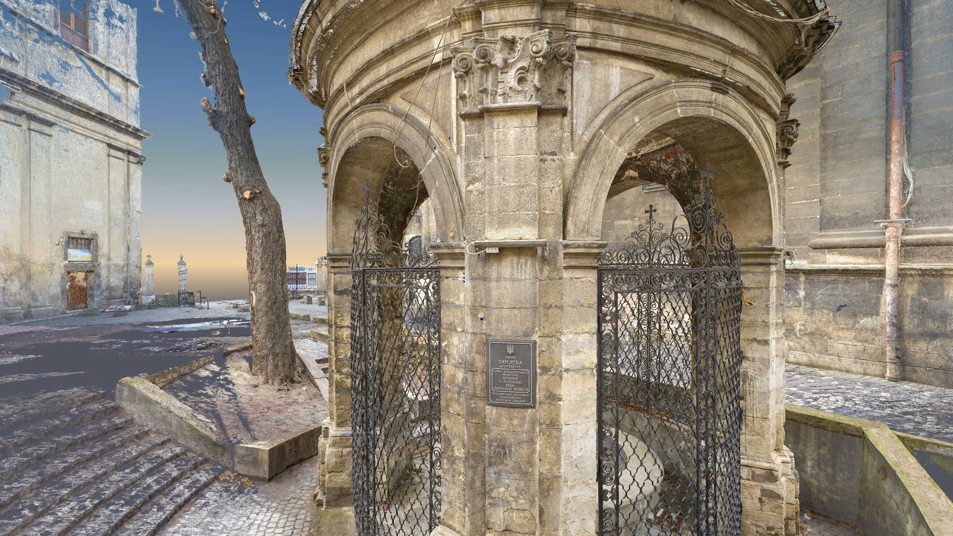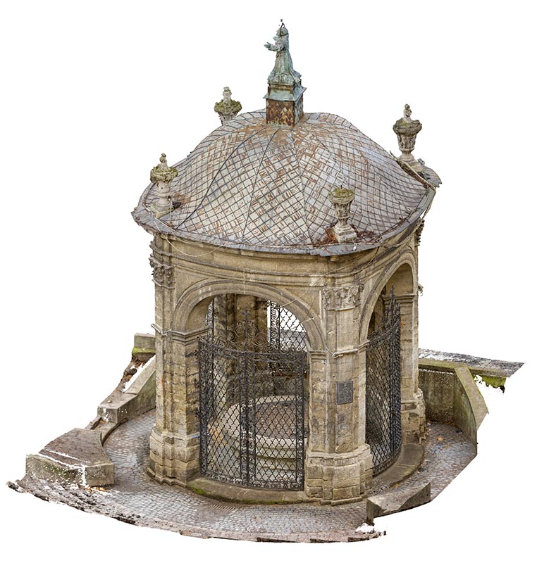 Beauftragt vom Polonika Institut zur Digitalen Vermessung des Brunnens von St. Johannes aus Dukla in Lviv. Das Objekt dieses Projekts befindet sich außerhalb der Bernhardinerkirche in Lviv. Aufgrund seiner Größe und Geometrie haben wir uns entschieden, nur photogrammetrische Werkzeuge zu verwenden – eine besonders hochauflösende Digitalkamera und eine geodätische Totalstation. Das zweite Gerät diente zur Messung von Kontrollpunkten, die zur Festlegung der Geolokalisierung und Skalierung des Objekts erforderlich sind.