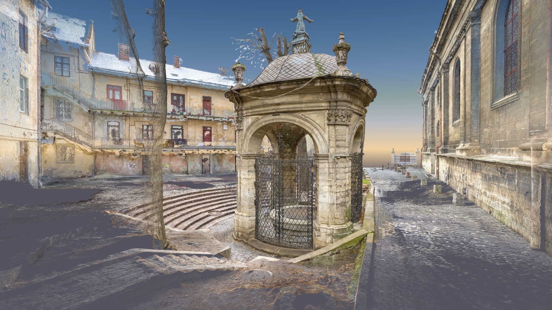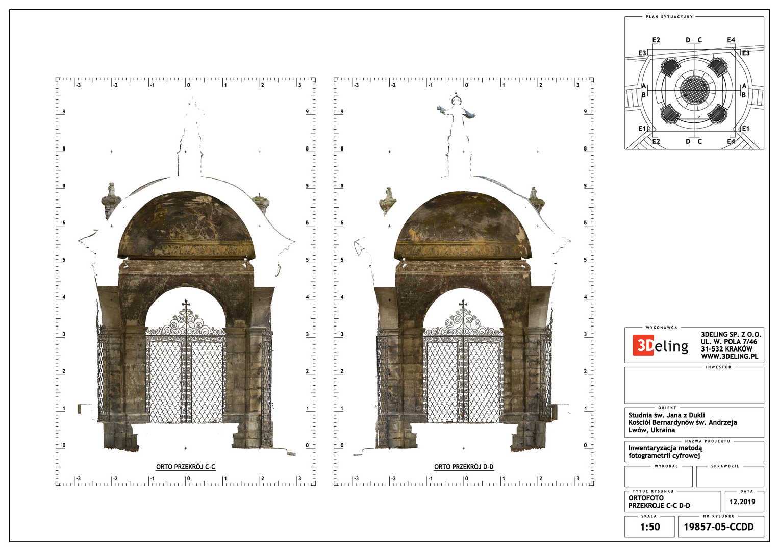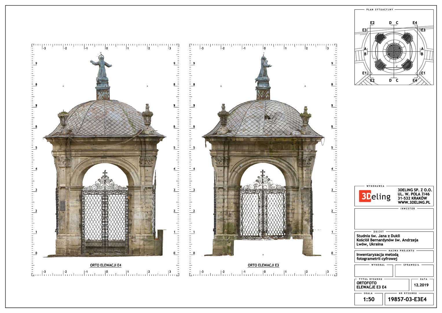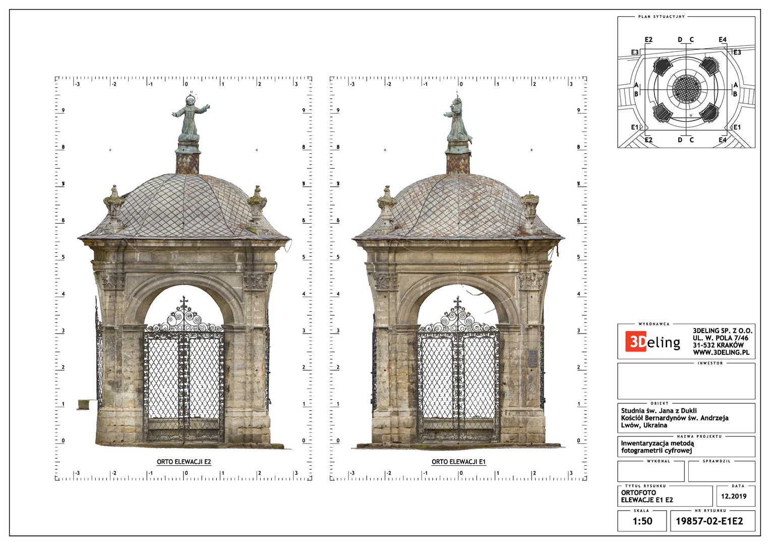 Beauftragt vom Polonika Institut zur Digitalen Vermessung des Brunnens von St. Johannes aus Dukla in Lviv. Das Objekt dieses Projekts befindet sich außerhalb der Bernhardinerkirche in Lviv. Aufgrund seiner Größe und Geometrie haben wir uns entschieden, nur photogrammetrische Werkzeuge zu verwenden – eine besonders hochauflösende Digitalkamera und eine geodätische Totalstation. Das zweite Gerät diente zur Messung von Kontrollpunkten, die zur Festlegung der Geolokalisierung und Skalierung des Objekts erforderlich sind.
