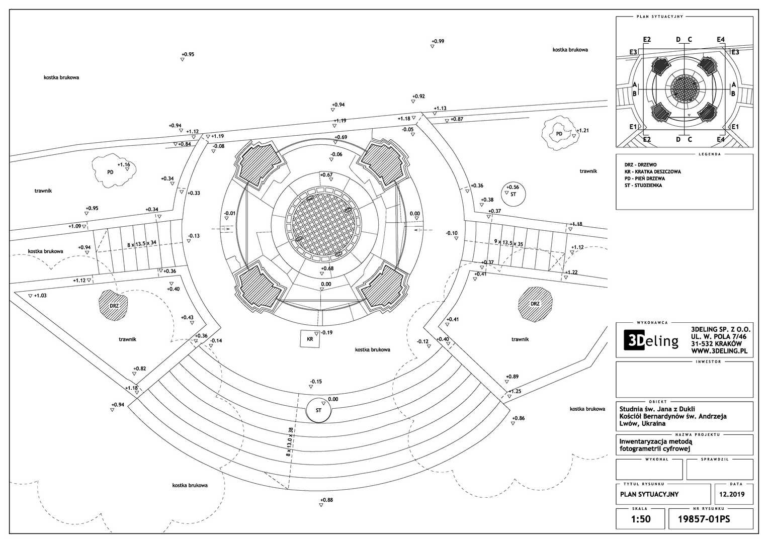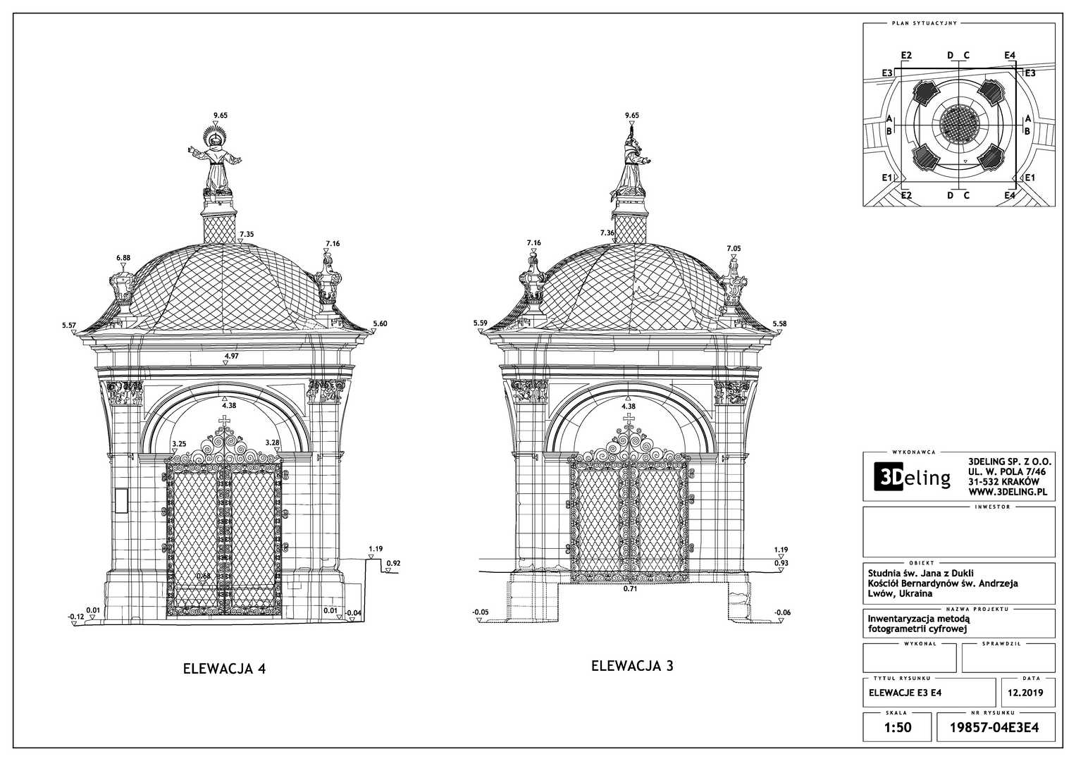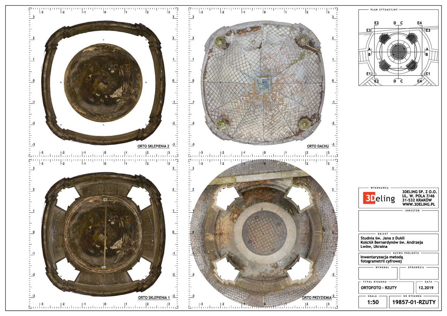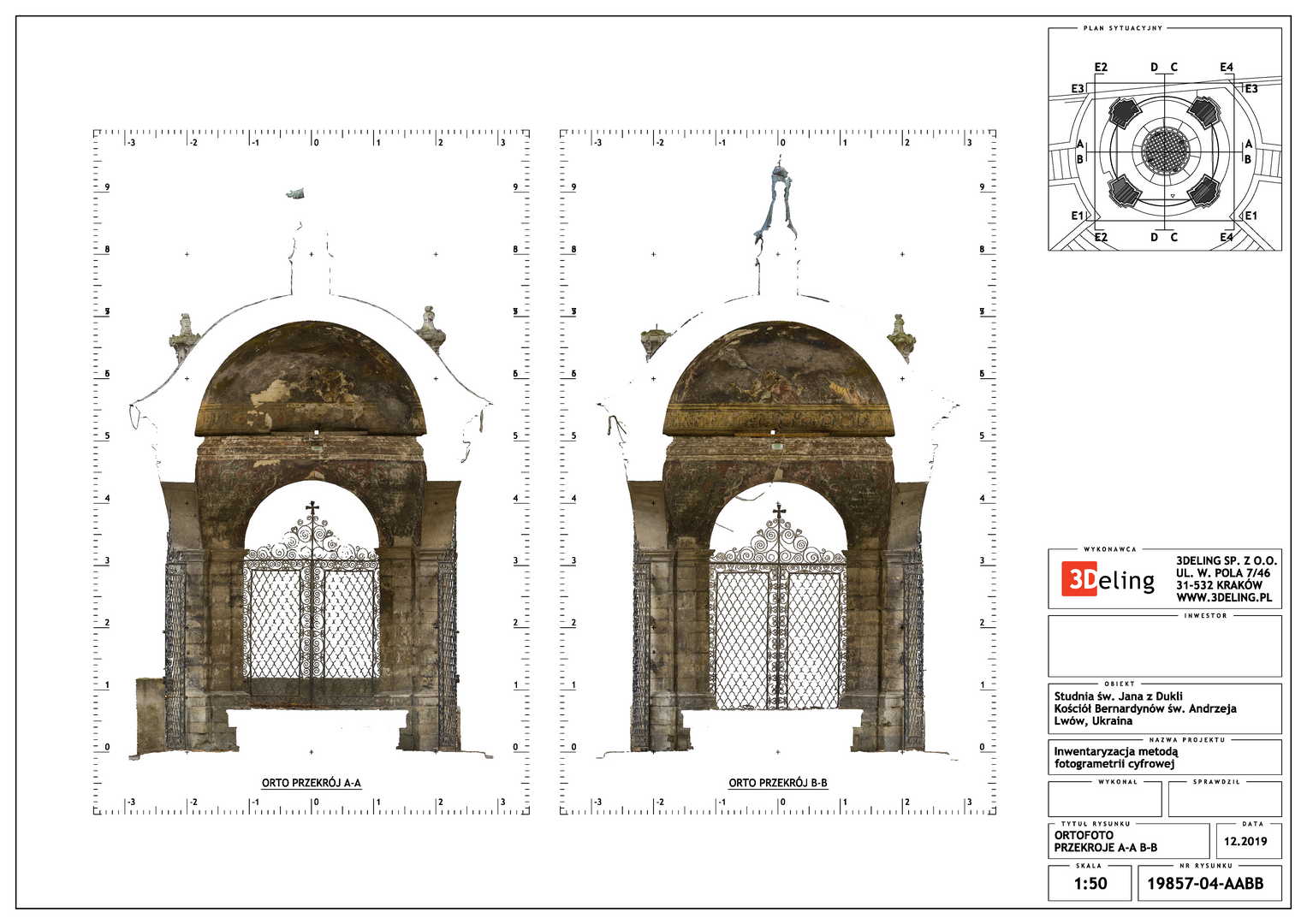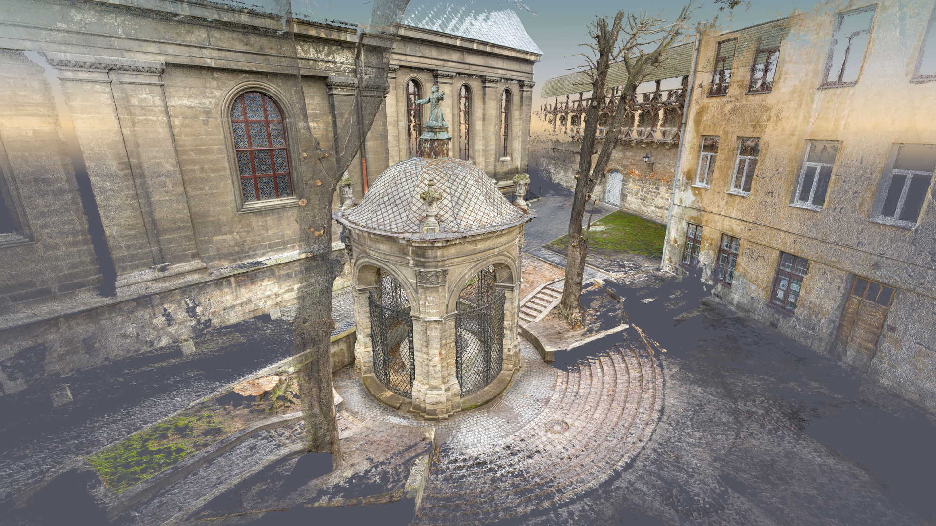 Beauftragt vom Polonika Institut zur Digitalen Vermessung des Brunnens von St. Johannes aus Dukla in Lviv. Das Objekt dieses Projekts befindet sich außerhalb der Bernhardinerkirche in Lviv. Aufgrund seiner Größe und Geometrie haben wir uns entschieden, nur photogrammetrische Werkzeuge zu verwenden – eine besonders hochauflösende Digitalkamera und eine geodätische Totalstation. Das zweite Gerät diente zur Messung von Kontrollpunkten, die zur Festlegung der Geolokalisierung und Skalierung des Objekts erforderlich sind.