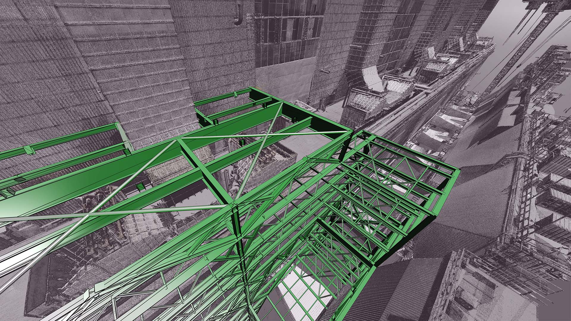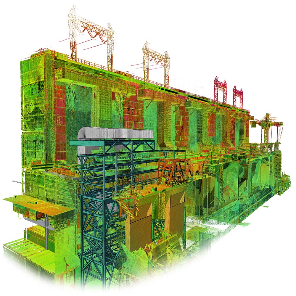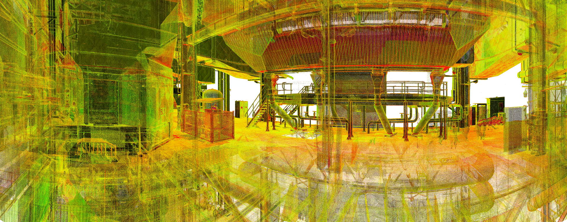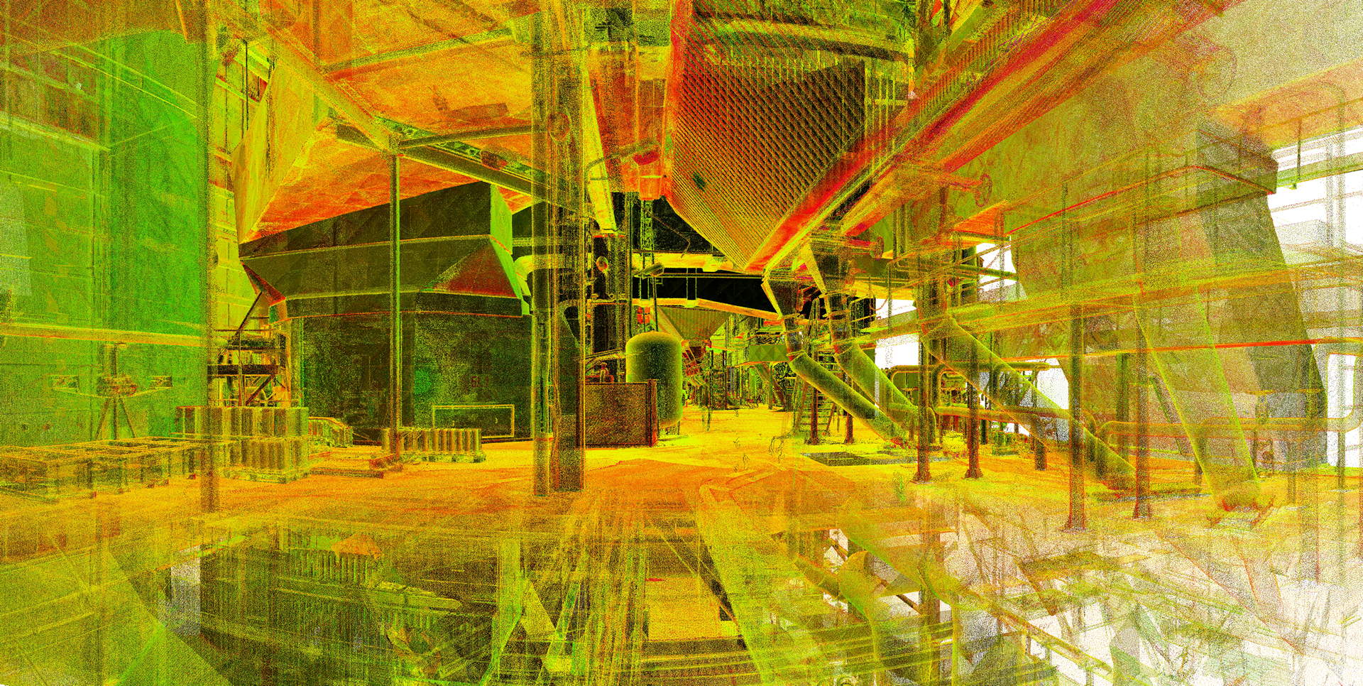 Der Kunde beauftragte das Laserscanning des gesamten Kesselhauses und der angrenzenden Filterstruktur. Der Anlagenbau verfügt über 60 m Höhe mit vier Ebenen (ohne Dach) sowie ohne jegliche Sichtweite zwischen ihnen. Während der geplanten Betriebszeit wurde die Vermessung durchgeführt. Der Innenraum des Kraftwerks war sehr rau, mit Staub, Vibrationen, Lärm und Temperaturen bis zu 60 °C. Die Maßnahmendatenbank bestand aus über 800 einzelnen Scanpositionen.