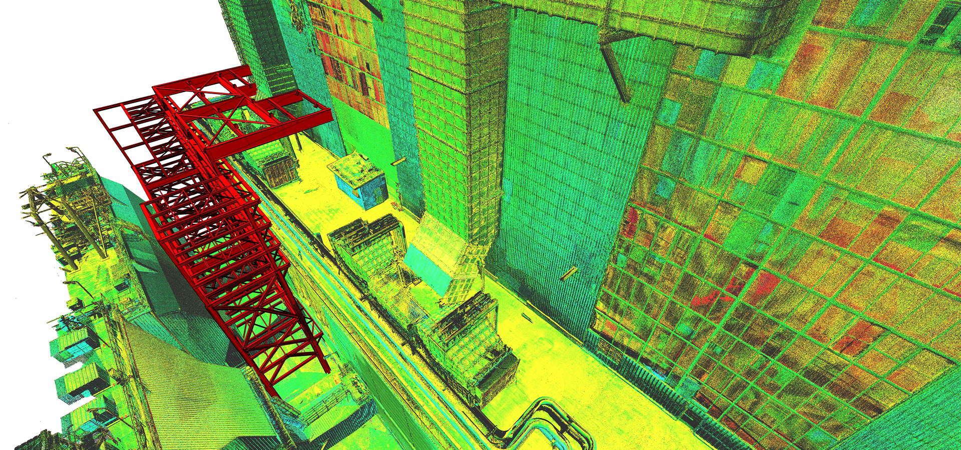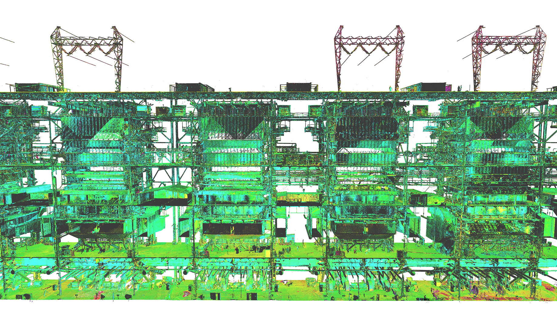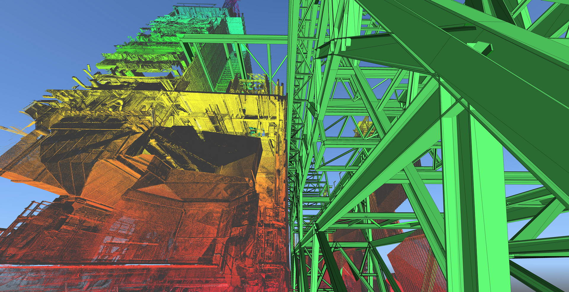 Der Kunde beauftragte das Laserscanning des gesamten Kesselhauses und der angrenzenden Filterstruktur. Der Anlagenbau verfügt über 60 m Höhe mit vier Ebenen (ohne Dach) sowie ohne jegliche Sichtweite zwischen ihnen. Während der geplanten Betriebszeit wurde die Vermessung durchgeführt. Der Innenraum des Kraftwerks war sehr rau, mit Staub, Vibrationen, Lärm und Temperaturen bis zu 60 °C. Die Maßnahmendatenbank bestand aus über 800 einzelnen Scanpositionen.