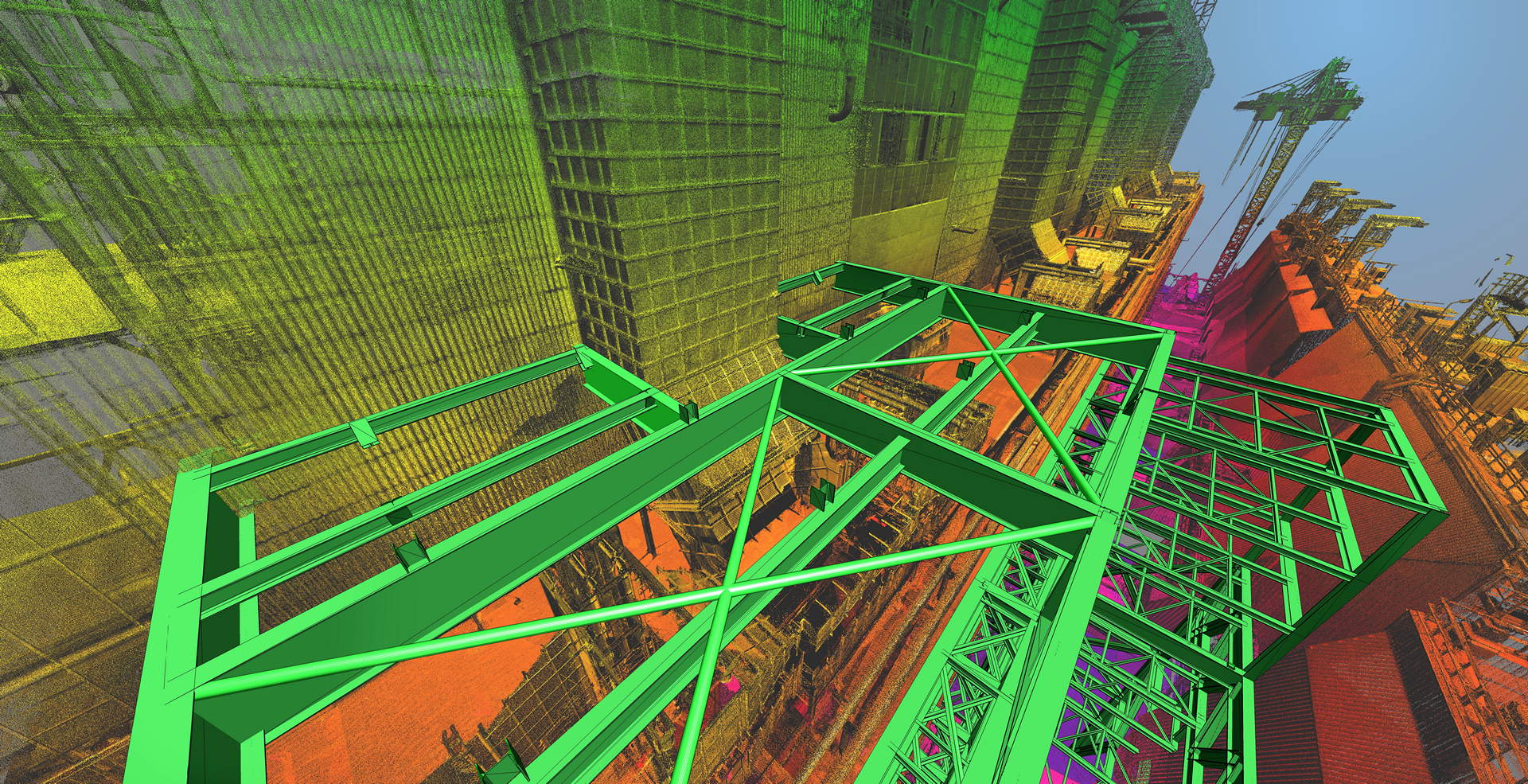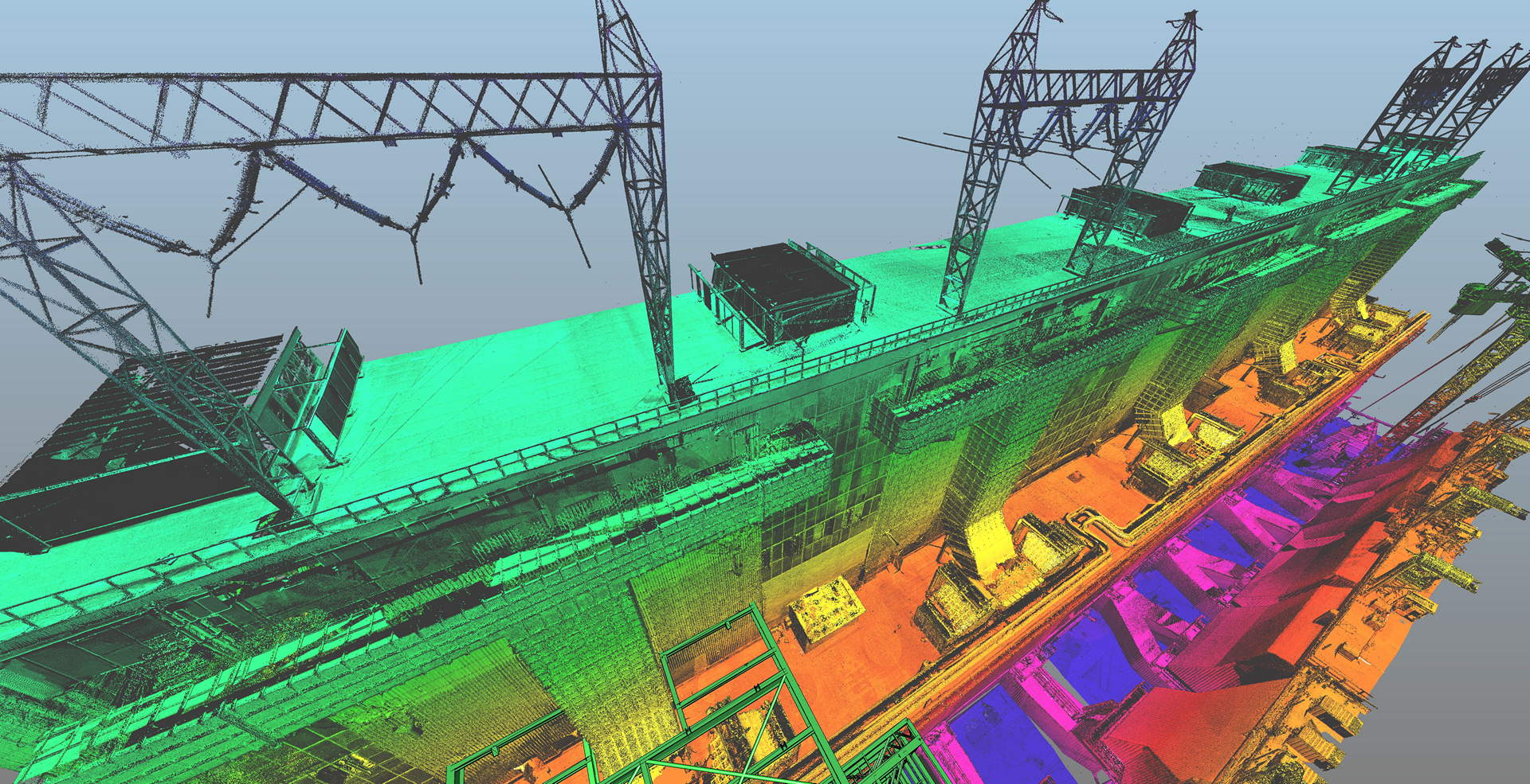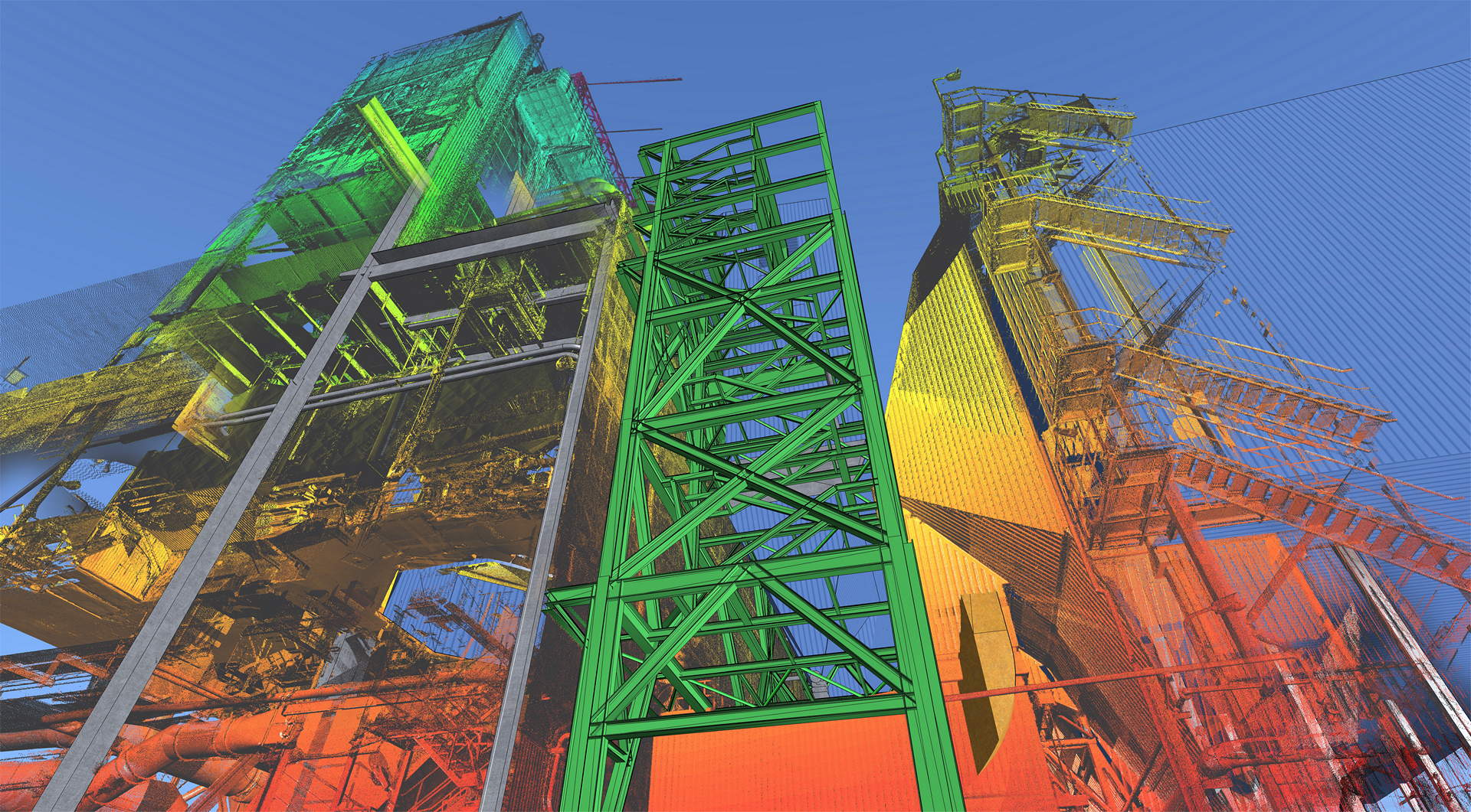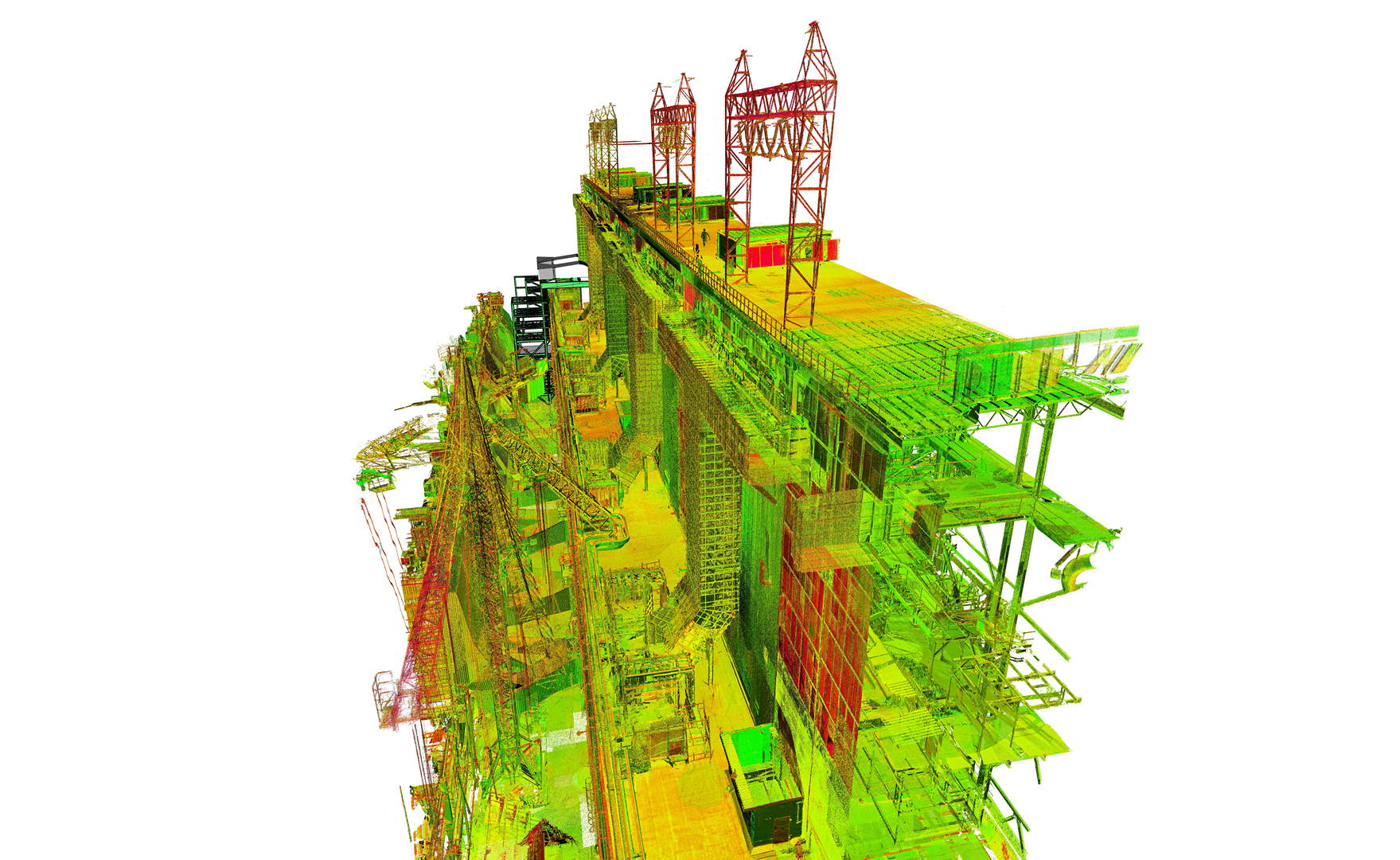 Der Kunde beauftragte das Laserscanning des gesamten Kesselhauses und der angrenzenden Filterstruktur. Der Anlagenbau verfügt über 60 m Höhe mit vier Ebenen (ohne Dach) sowie ohne jegliche Sichtweite zwischen ihnen. Während der geplanten Betriebszeit wurde die Vermessung durchgeführt. Der Innenraum des Kraftwerks war sehr rau, mit Staub, Vibrationen, Lärm und Temperaturen bis zu 60 °C. Die Maßnahmendatenbank bestand aus über 800 einzelnen Scanpositionen.