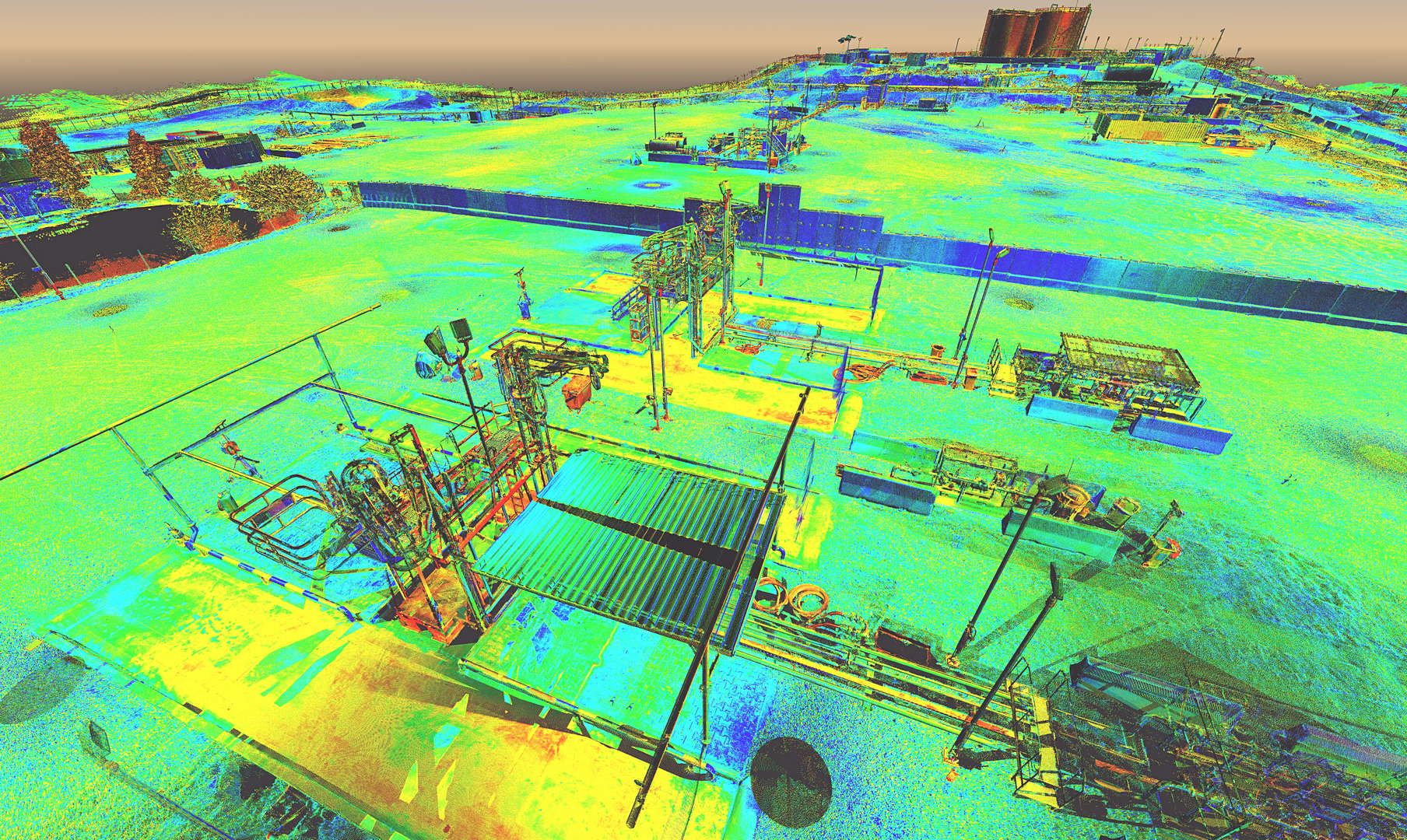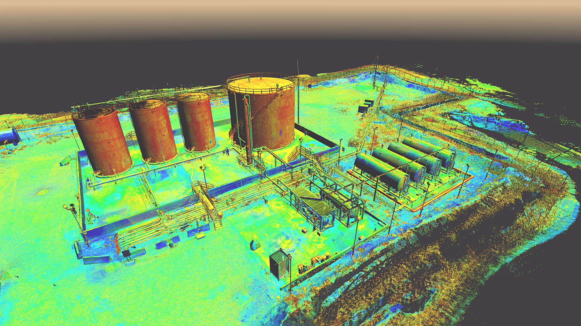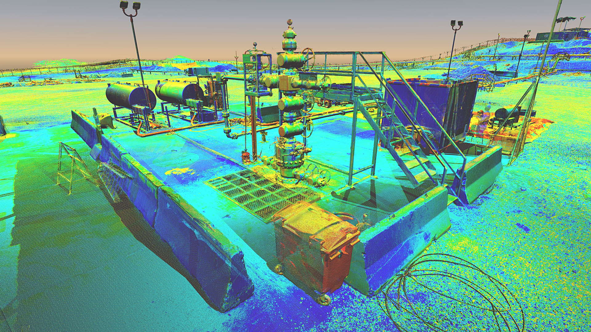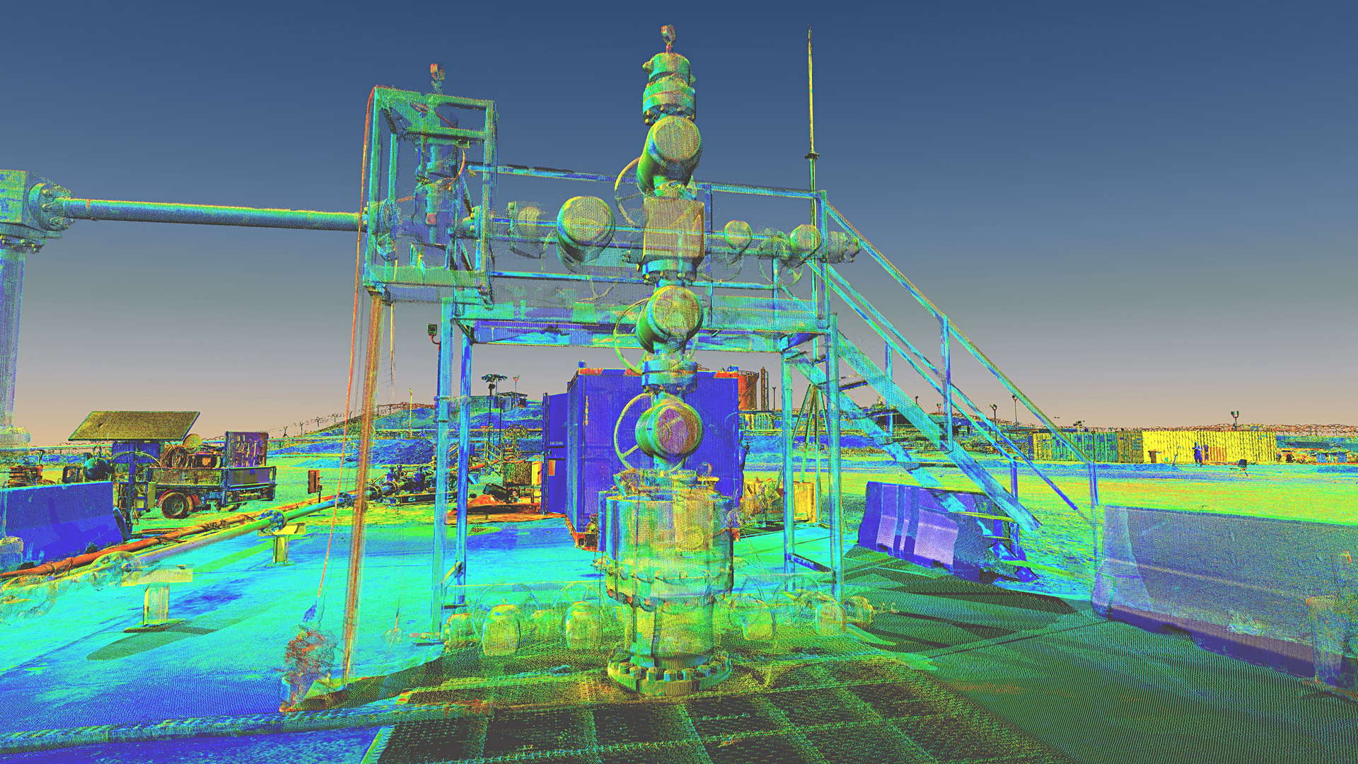 Der Arbeitsumfang umfasste die Durchführung von Scans einer kompletten Anlage, die sich auf einem Ölfeld in Kurdistan im Norden des Iraks befindet. Neben dem Bohrlochkopf haben wir auch die Vorfiltrations-, Speicher- und Transportsysteme gescannt. Die Anlage enthält auch eine Fackel, die ständig das aus dem Öl gefilterte Erdgas verbrennt.