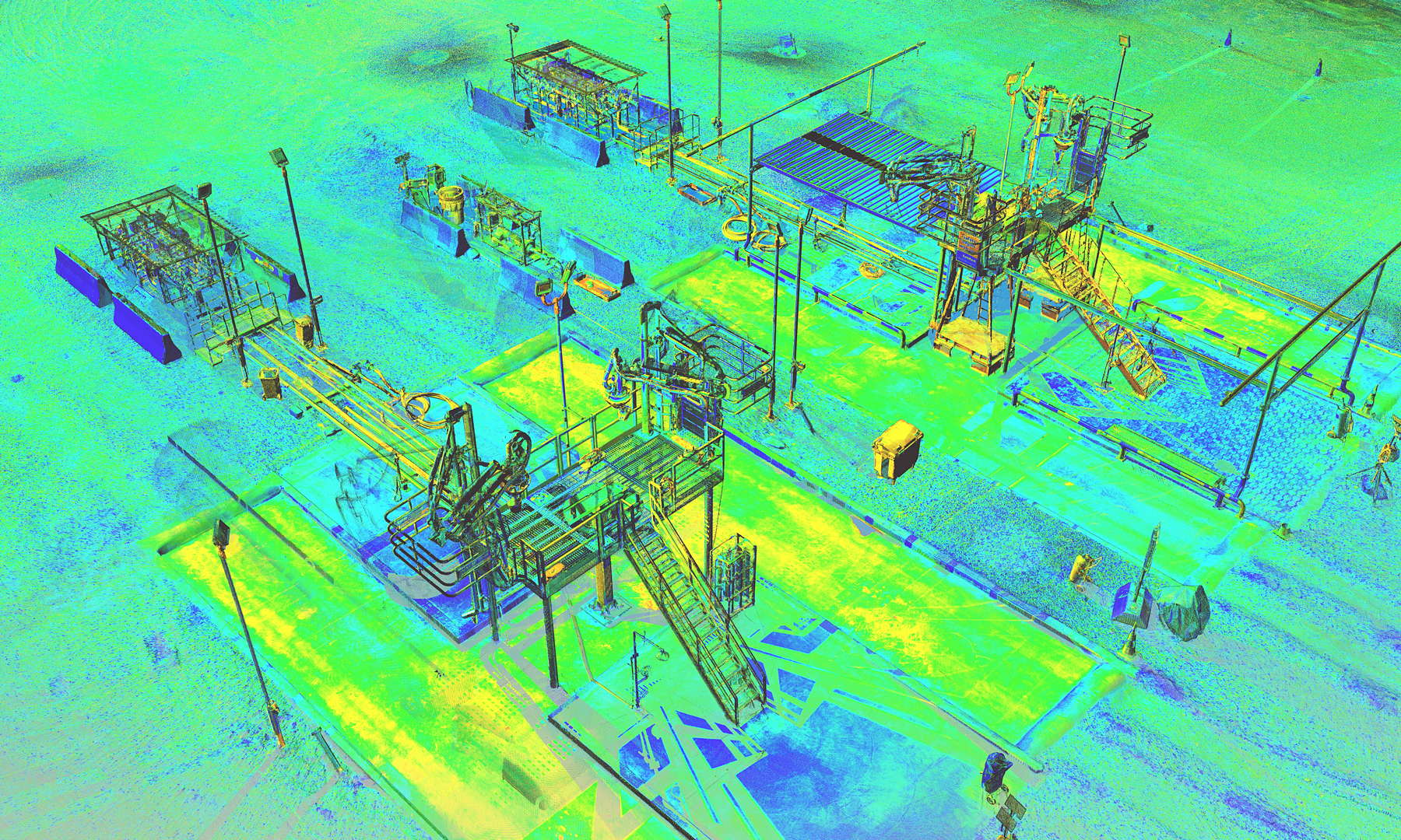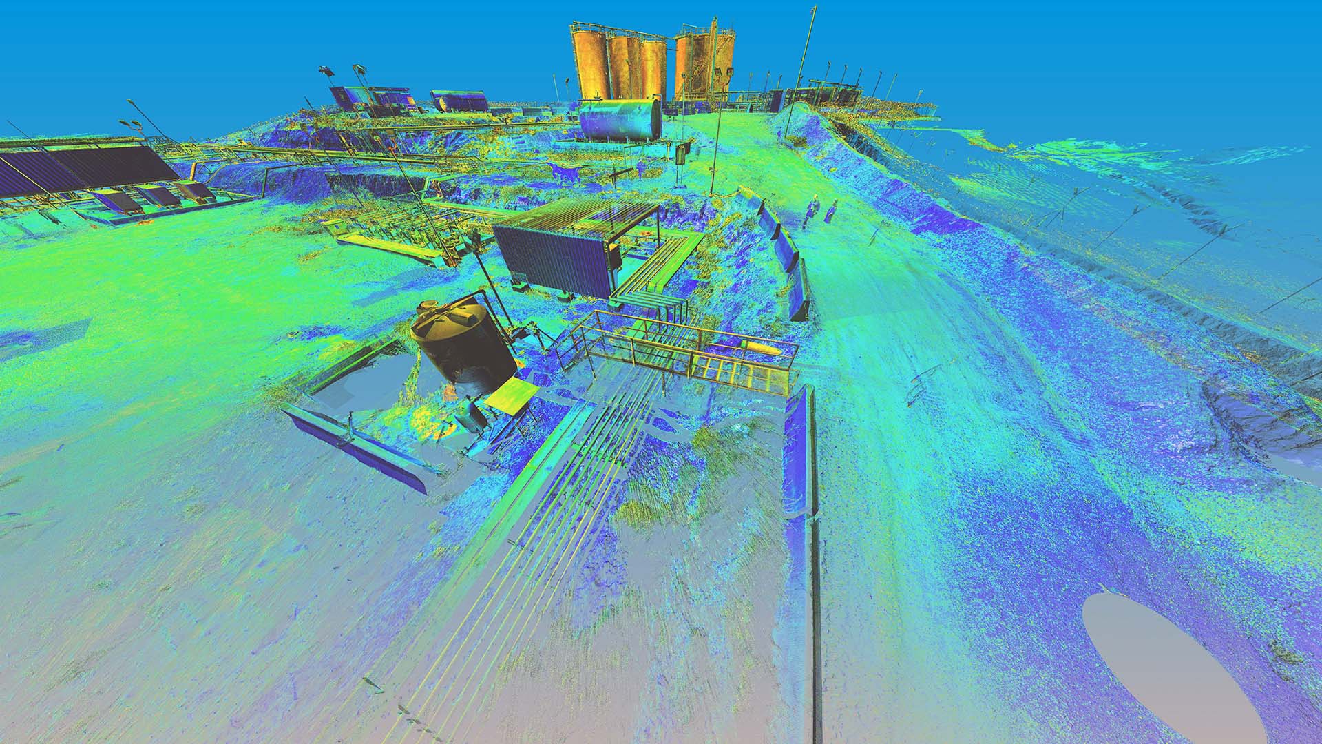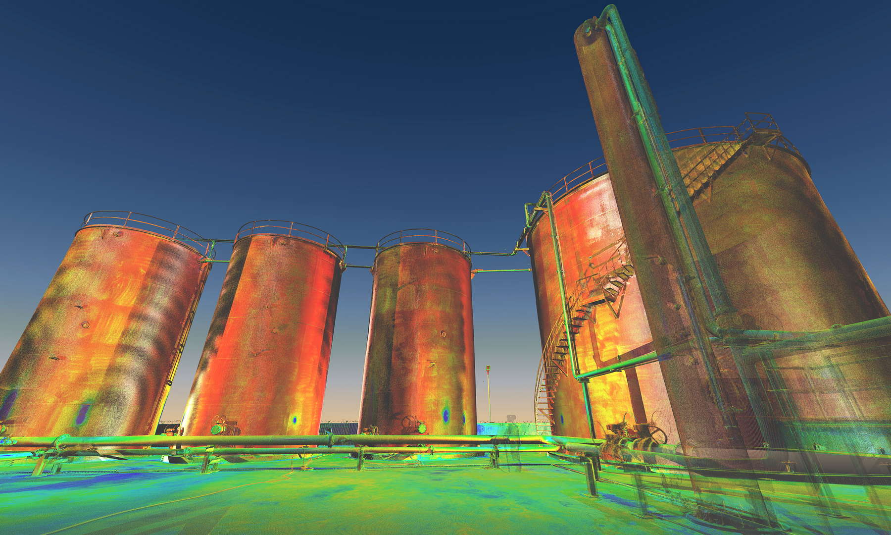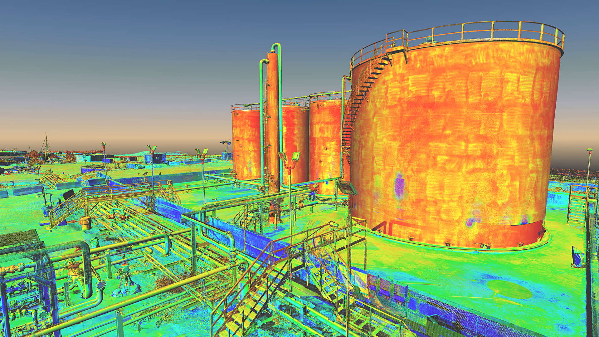 Der Arbeitsumfang umfasste die Durchführung von Scans einer kompletten Anlage, die sich auf einem Ölfeld in Kurdistan im Norden des Iraks befindet. Neben dem Bohrlochkopf haben wir auch die Vorfiltrations-, Speicher- und Transportsysteme gescannt. Die Anlage enthält auch eine Fackel, die ständig das aus dem Öl gefilterte Erdgas verbrennt.
