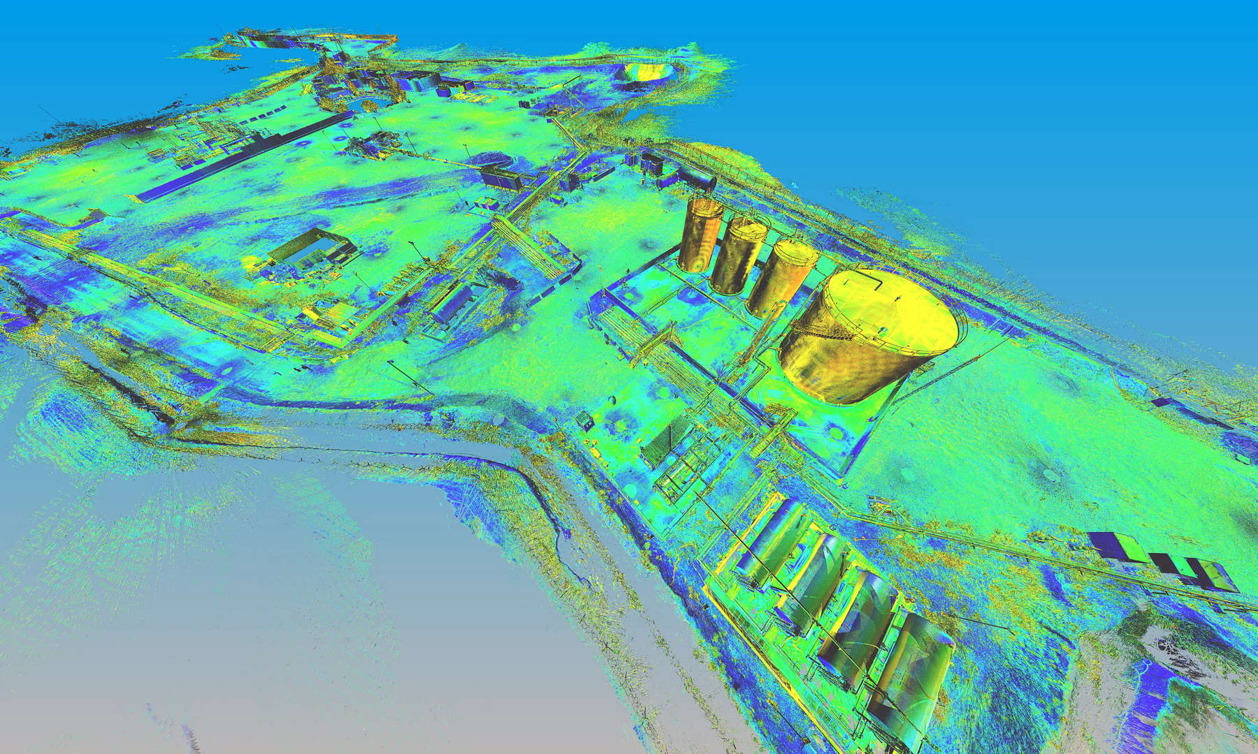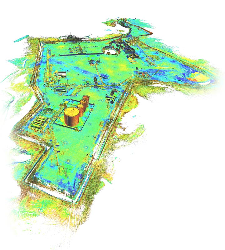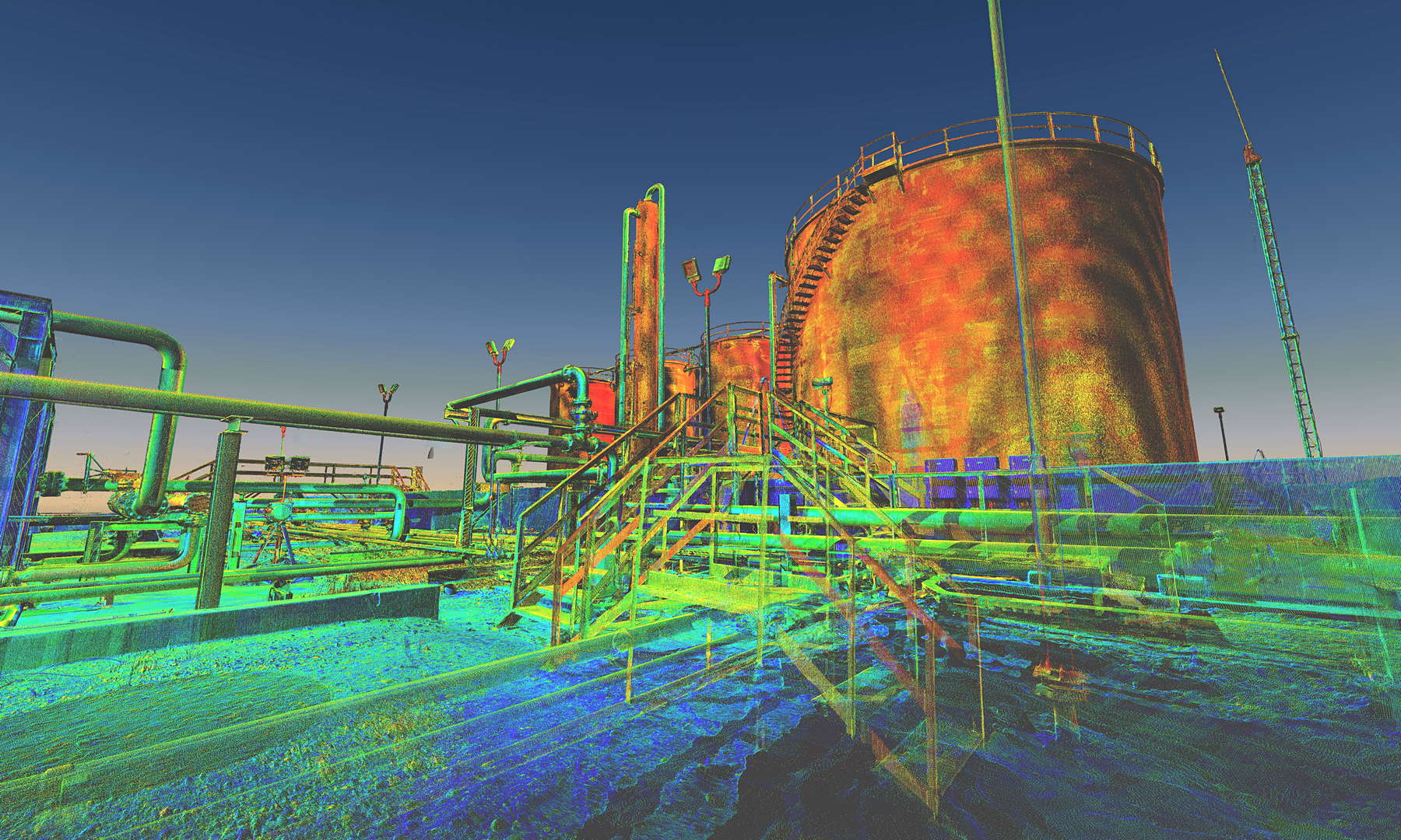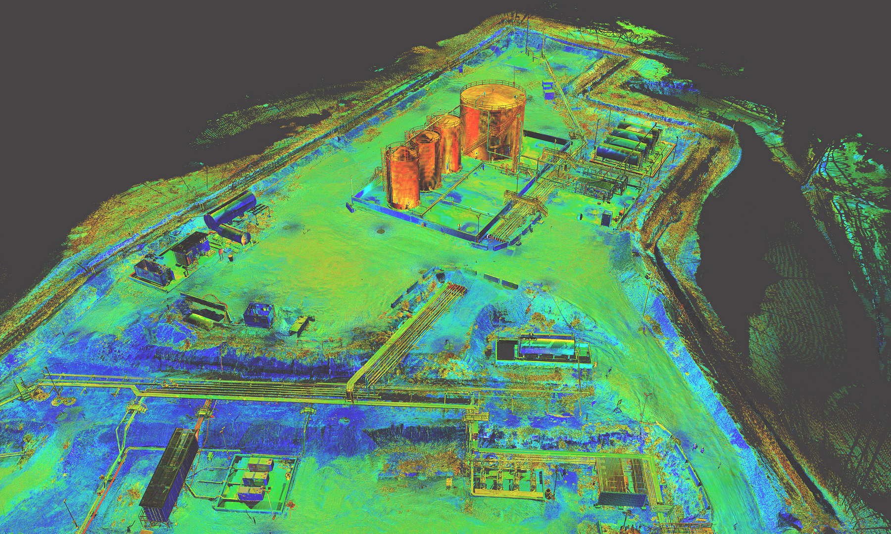 Der Arbeitsumfang umfasste die Durchführung von Scans einer kompletten Anlage, die sich auf einem Ölfeld in Kurdistan im Norden des Iraks befindet. Neben dem Bohrlochkopf haben wir auch die Vorfiltrations-, Speicher- und Transportsysteme gescannt. Die Anlage enthält auch eine Fackel, die ständig das aus dem Öl gefilterte Erdgas verbrennt.