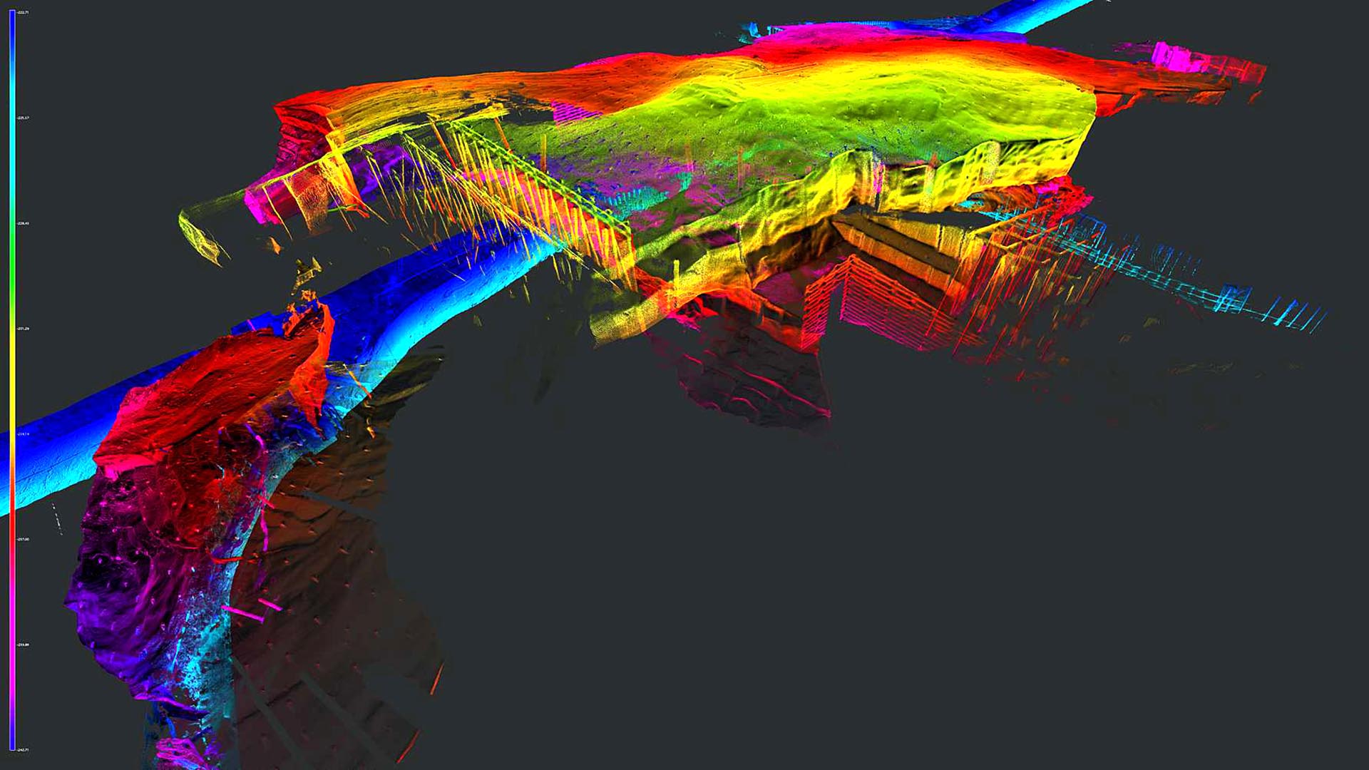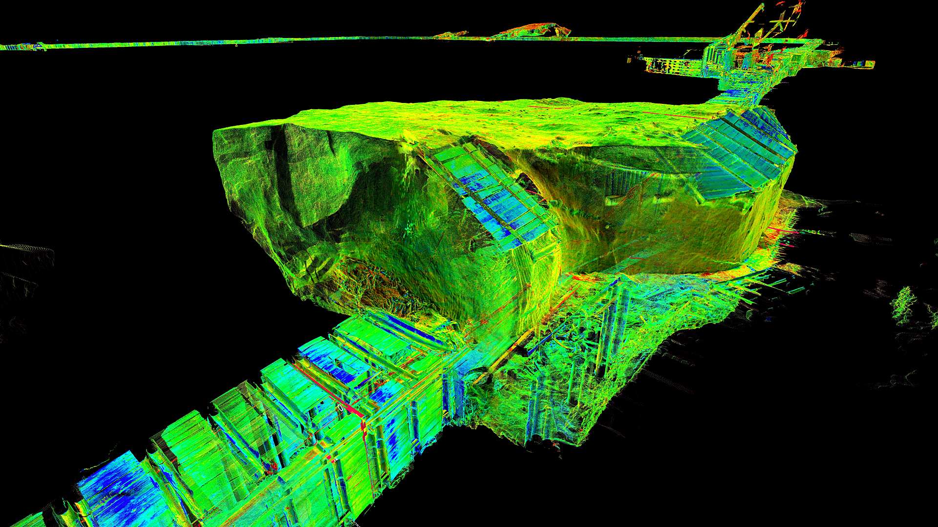 Der Kunde suchte auch nach den erfassten Punktwolkeninformationen, um eine Basisdatensatz für die Deformationsüberwachung bereitzustellen, bei der das Scannen im Laufe der Zeit wiederholt werden kann. Cloud-to-Cloud-Analysen können dann durchgeführt werden, um Bewegungen zu bestimmen.