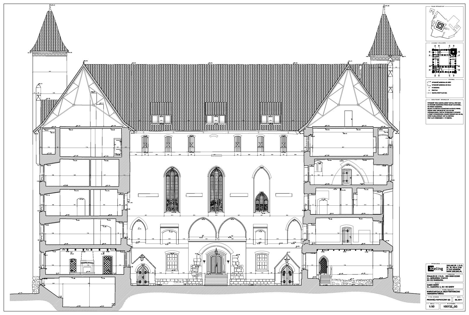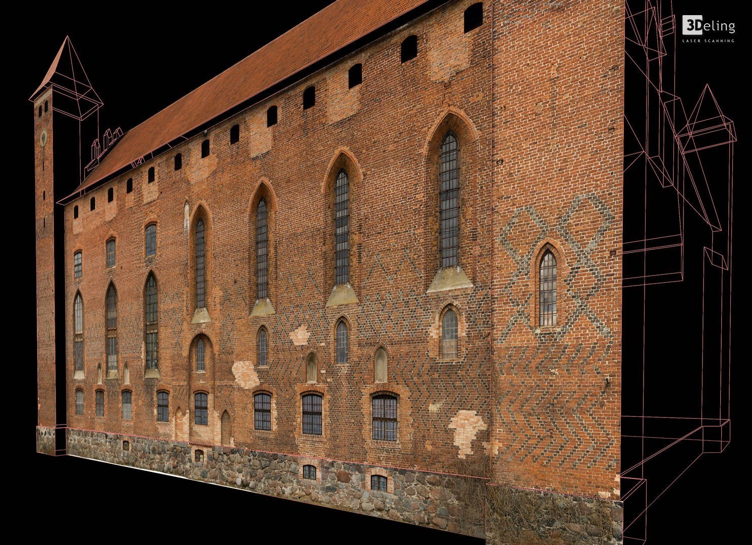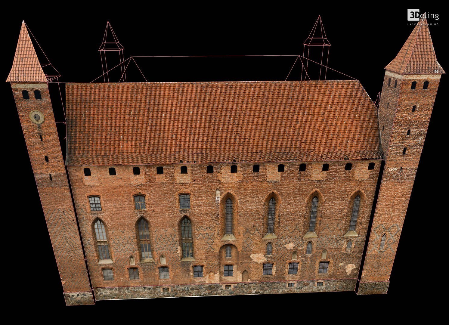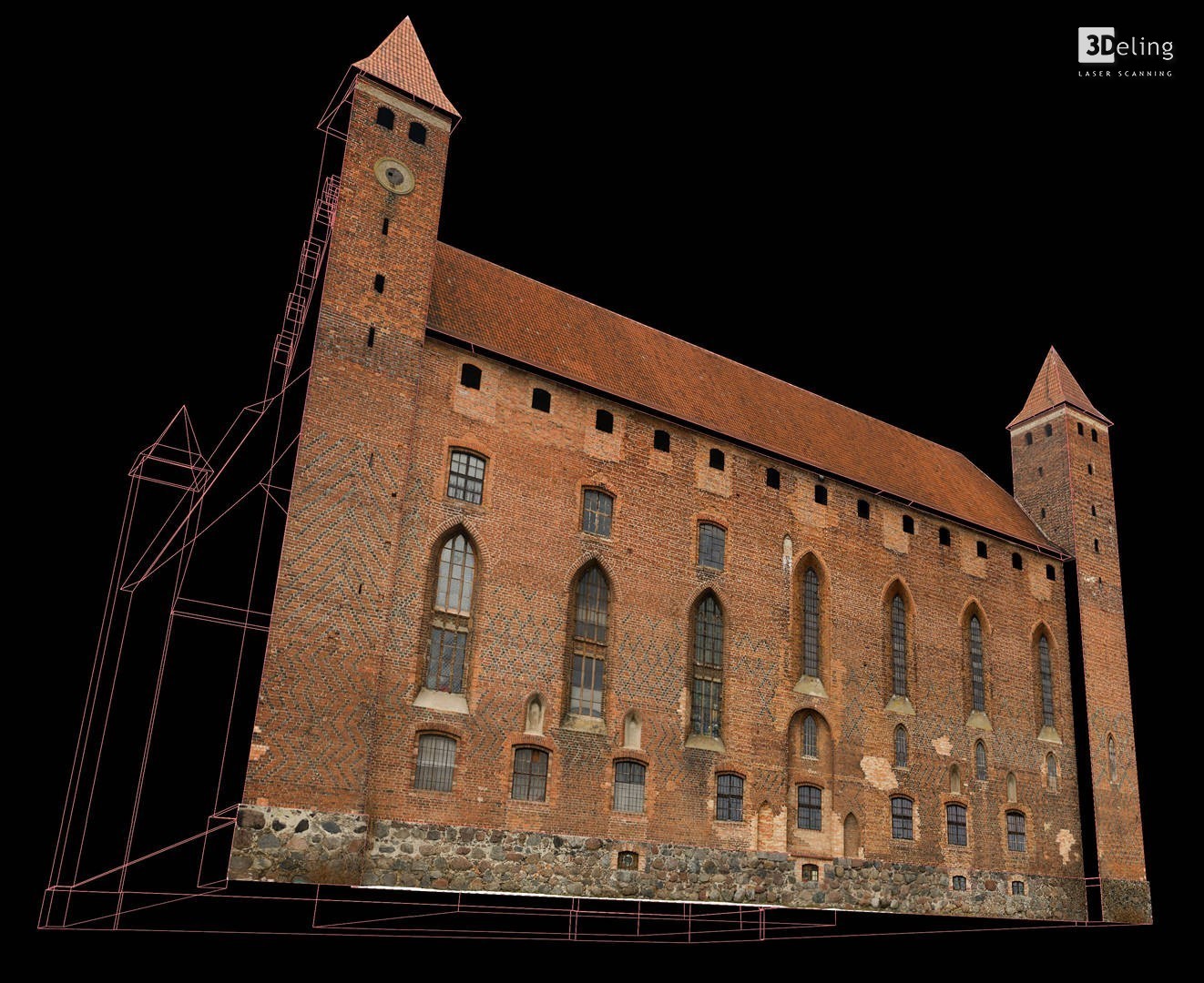 Im frühen Jahr 2011 erhielt 3Deling den Auftrag, die mittelalterliche Burg in Gniew, Polen, mittels Laser zu scannen. Die Gebäude wurden umfassend vom Keller bis zum Dachboden gescannt. Insgesamt wurden über 800 einzelne Scans in ein gemeinsames Koordinatensystem registriert. Die Punktwolke wurde dann genutzt, um einen umfassenden 2D-Datensatz für die Burg zu erstellen, einschließlich Grundrissen, Schnitten und Höhenzeichnungen.