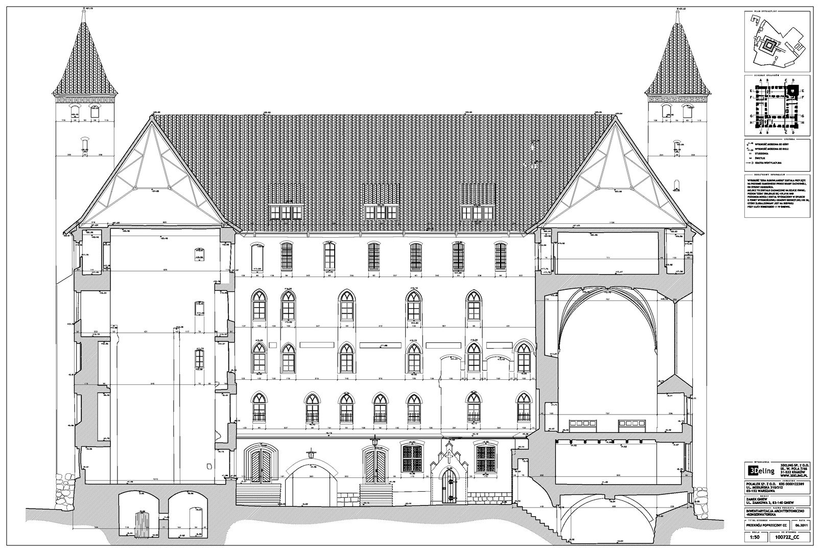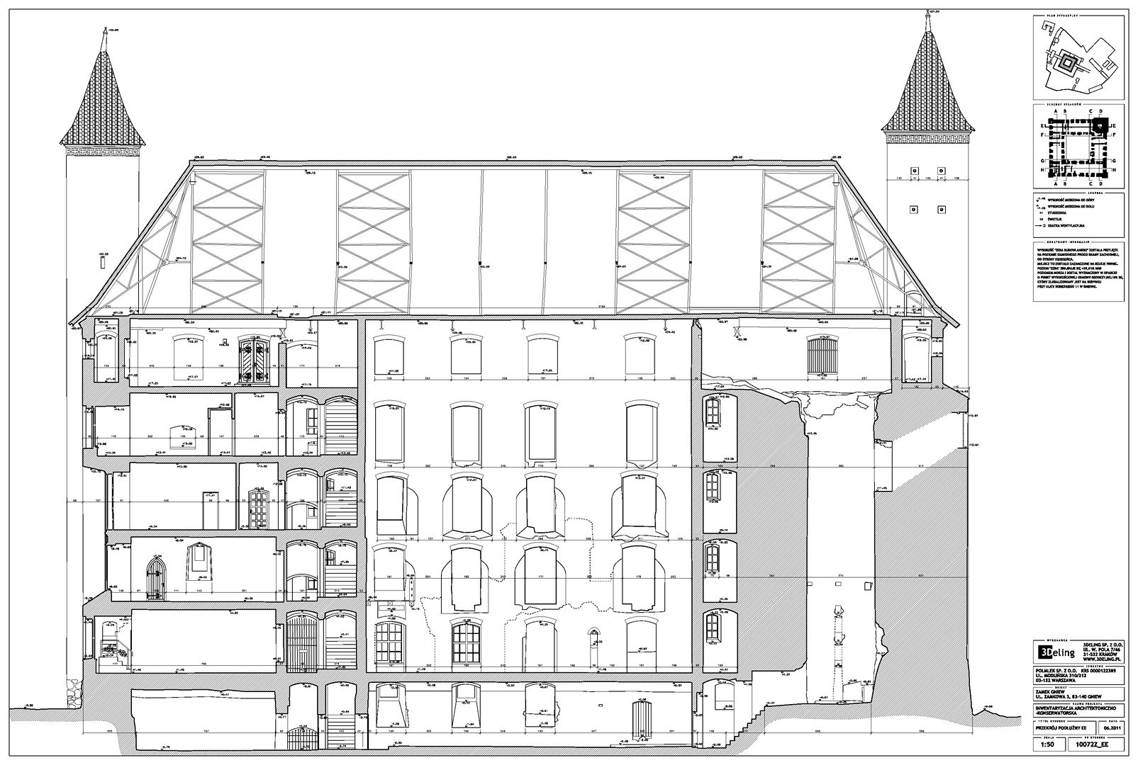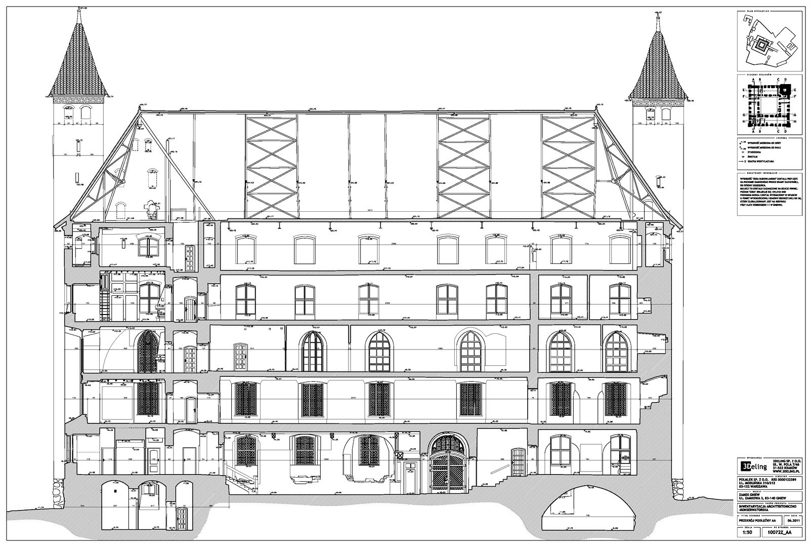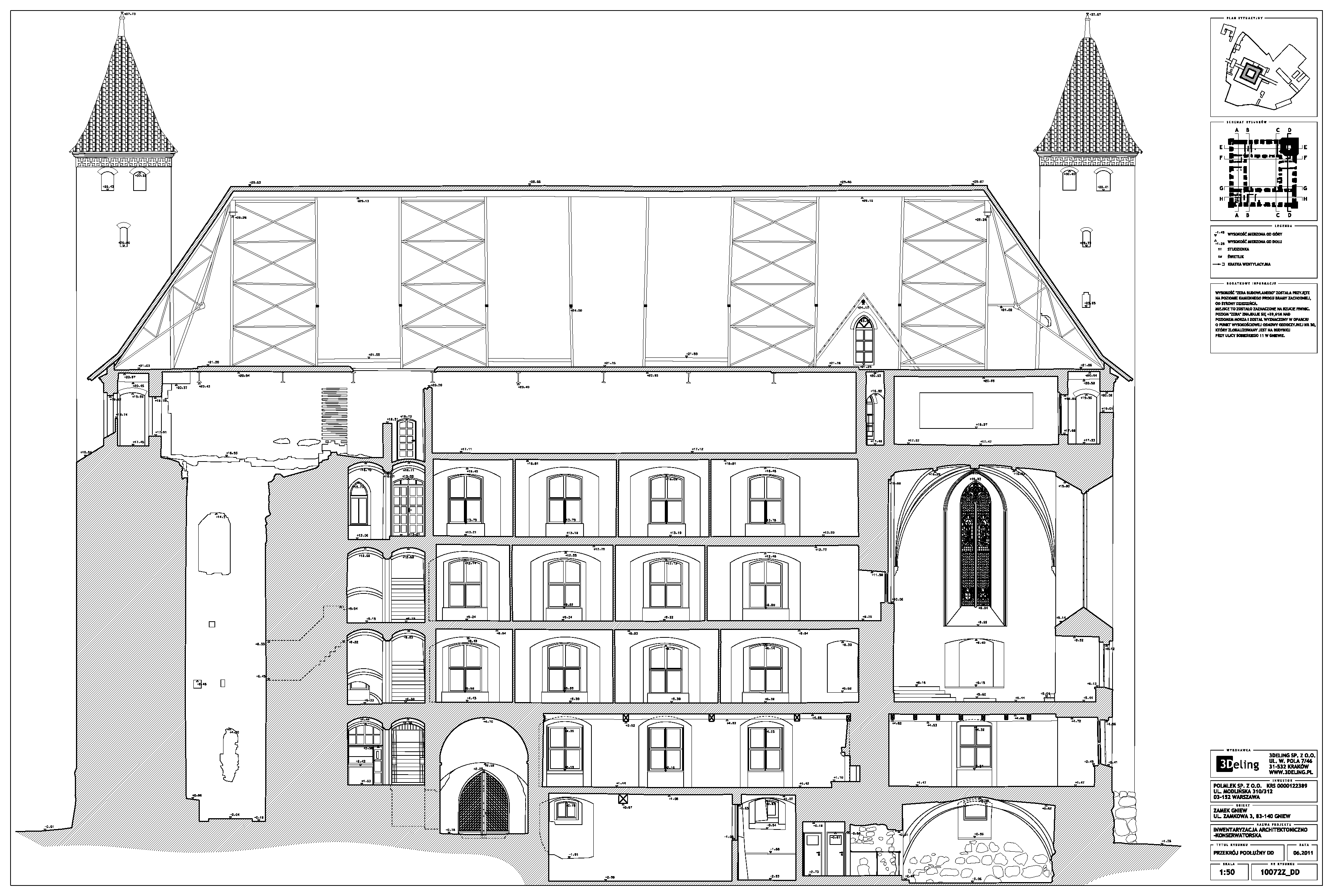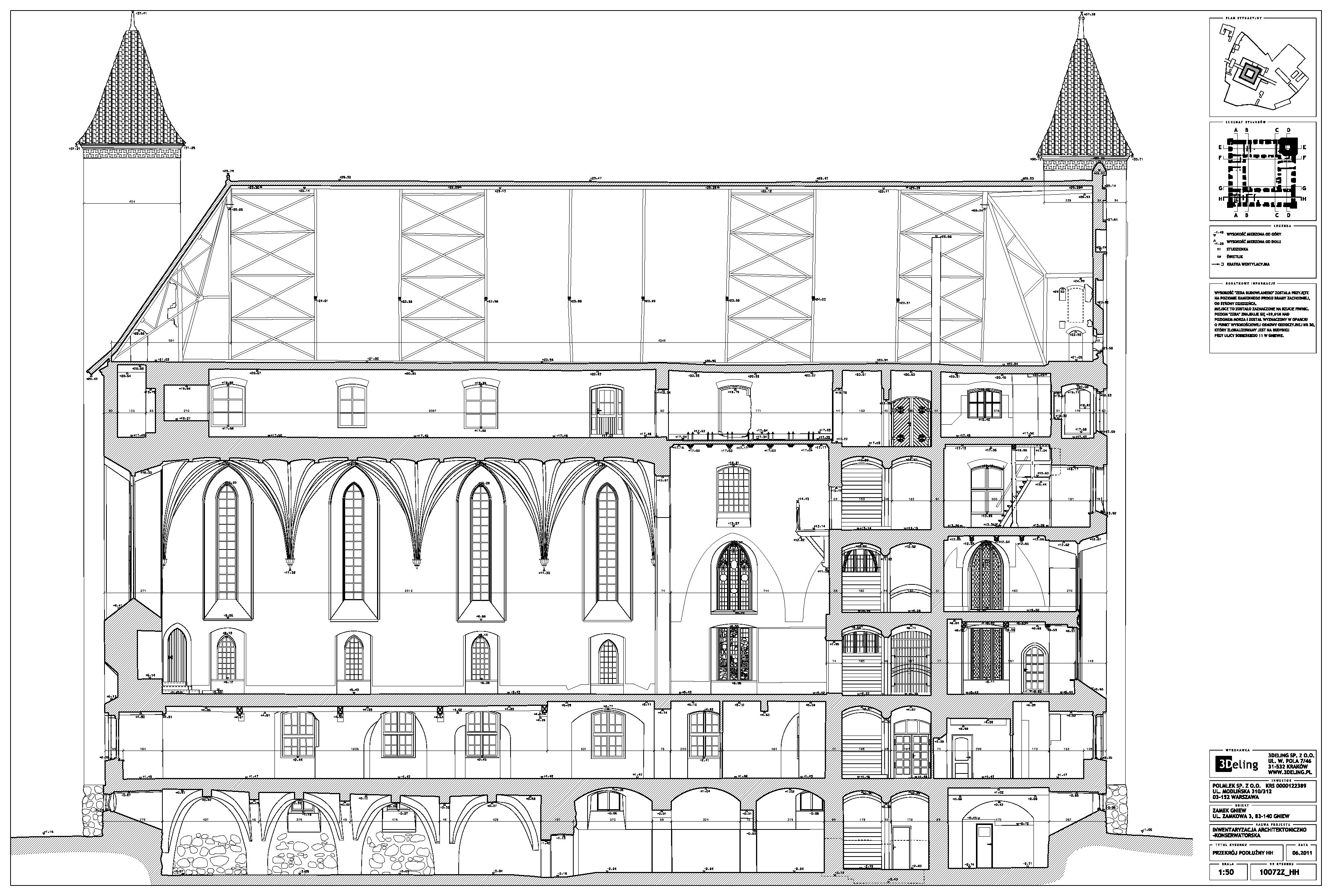 Im frühen Jahr 2011 erhielt 3Deling den Auftrag, die mittelalterliche Burg in Gniew, Polen, mittels Laser zu scannen. Die Gebäude wurden umfassend vom Keller bis zum Dachboden gescannt. Insgesamt wurden über 800 einzelne Scans in ein gemeinsames Koordinatensystem registriert. Die Punktwolke wurde dann genutzt, um einen umfassenden 2D-Datensatz für die Burg zu erstellen, einschließlich Grundrissen, Schnitten und Höhenzeichnungen.