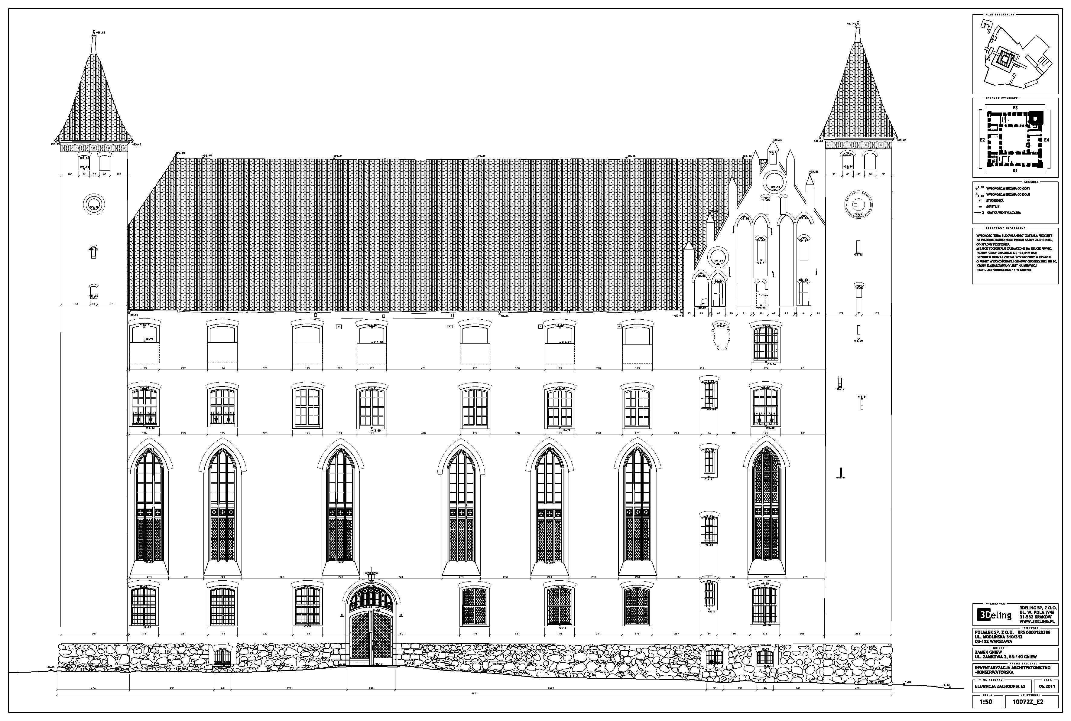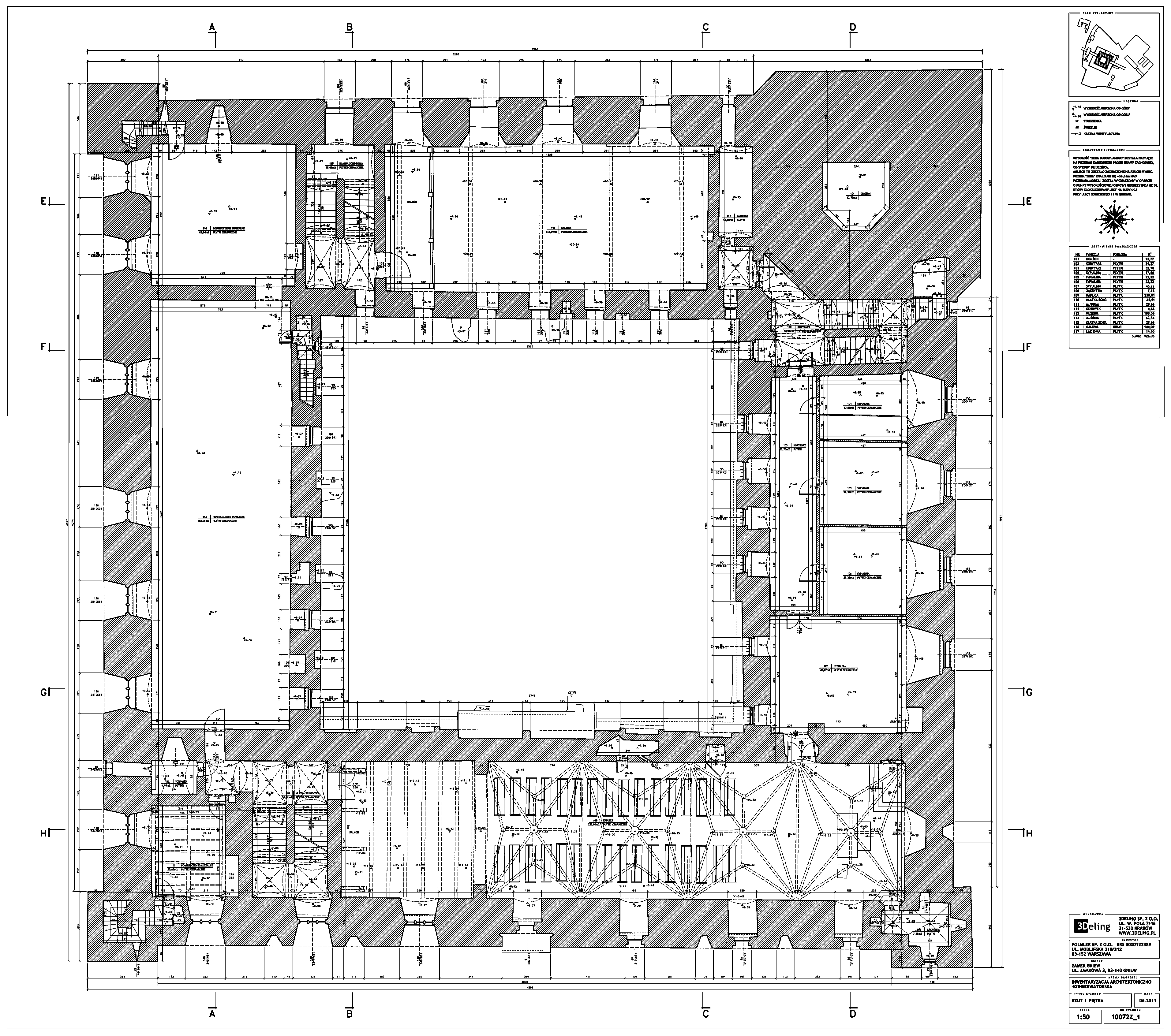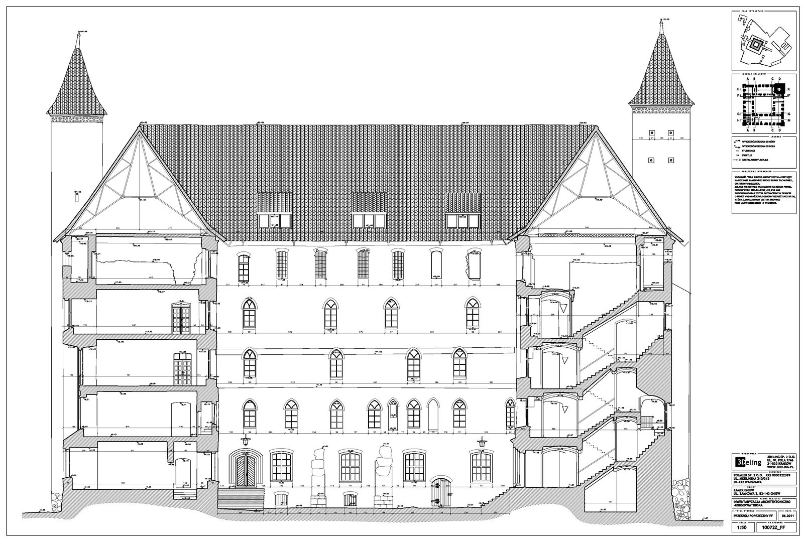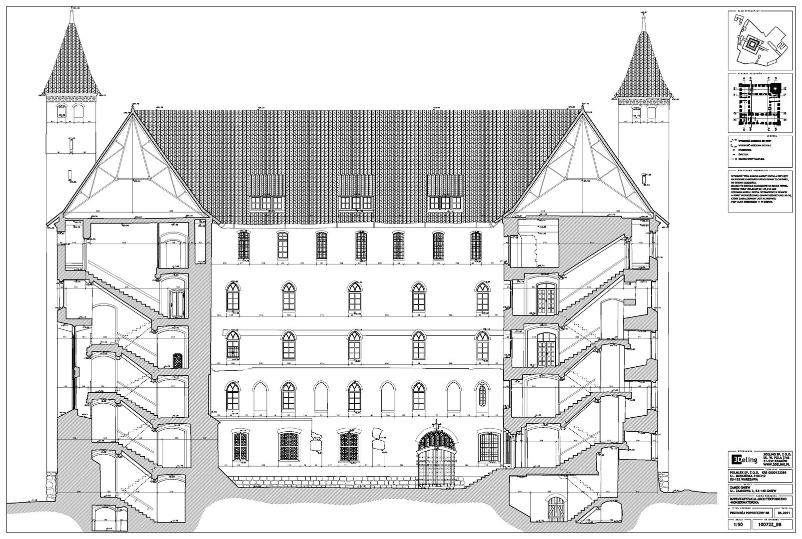 Im frühen Jahr 2011 erhielt 3Deling den Auftrag, die mittelalterliche Burg in Gniew, Polen, mittels Laser zu scannen. Die Gebäude wurden umfassend vom Keller bis zum Dachboden gescannt. Insgesamt wurden über 800 einzelne Scans in ein gemeinsames Koordinatensystem registriert. Die Punktwolke wurde dann genutzt, um einen umfassenden 2D-Datensatz für die Burg zu erstellen, einschließlich Grundrissen, Schnitten und Höhenzeichnungen.