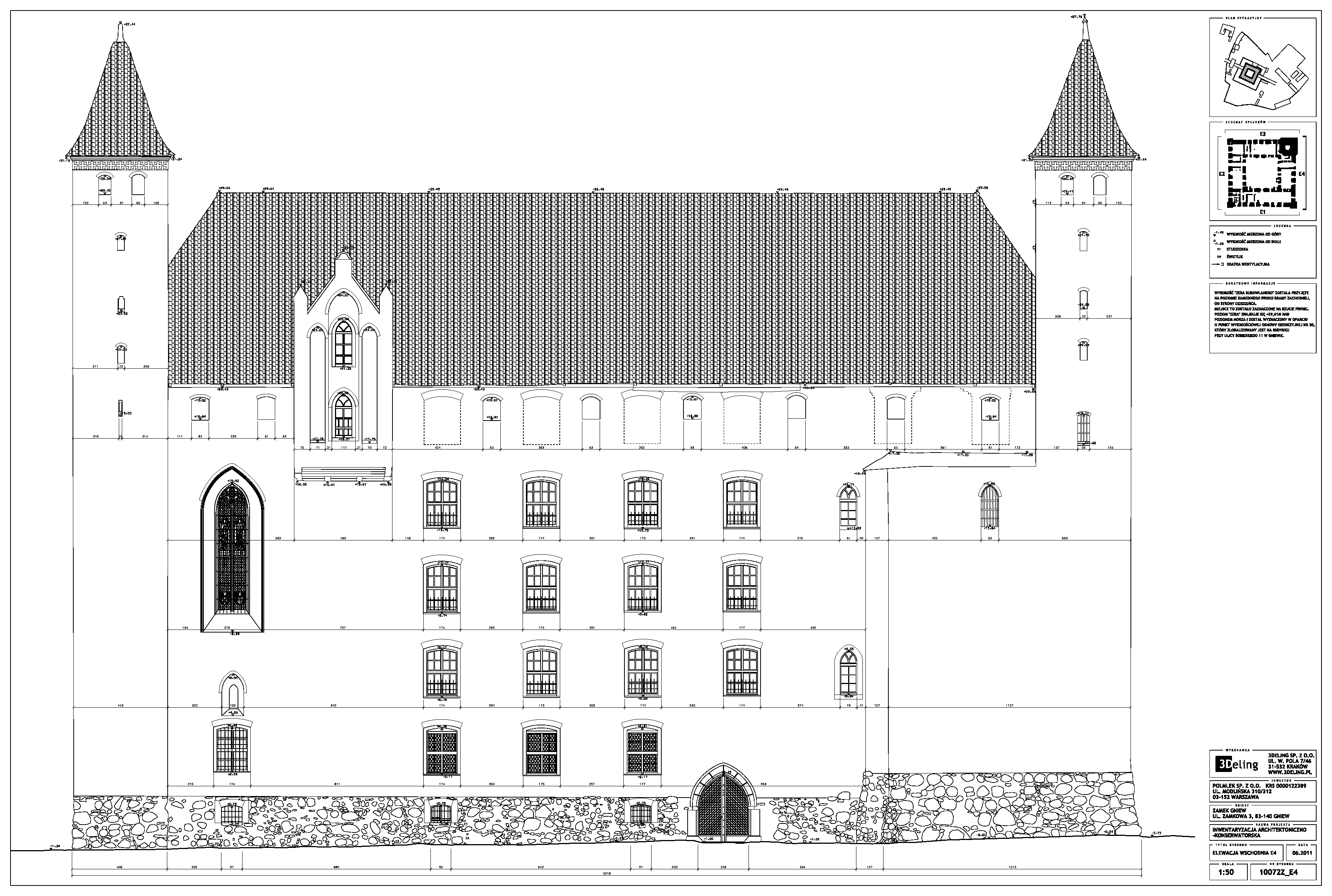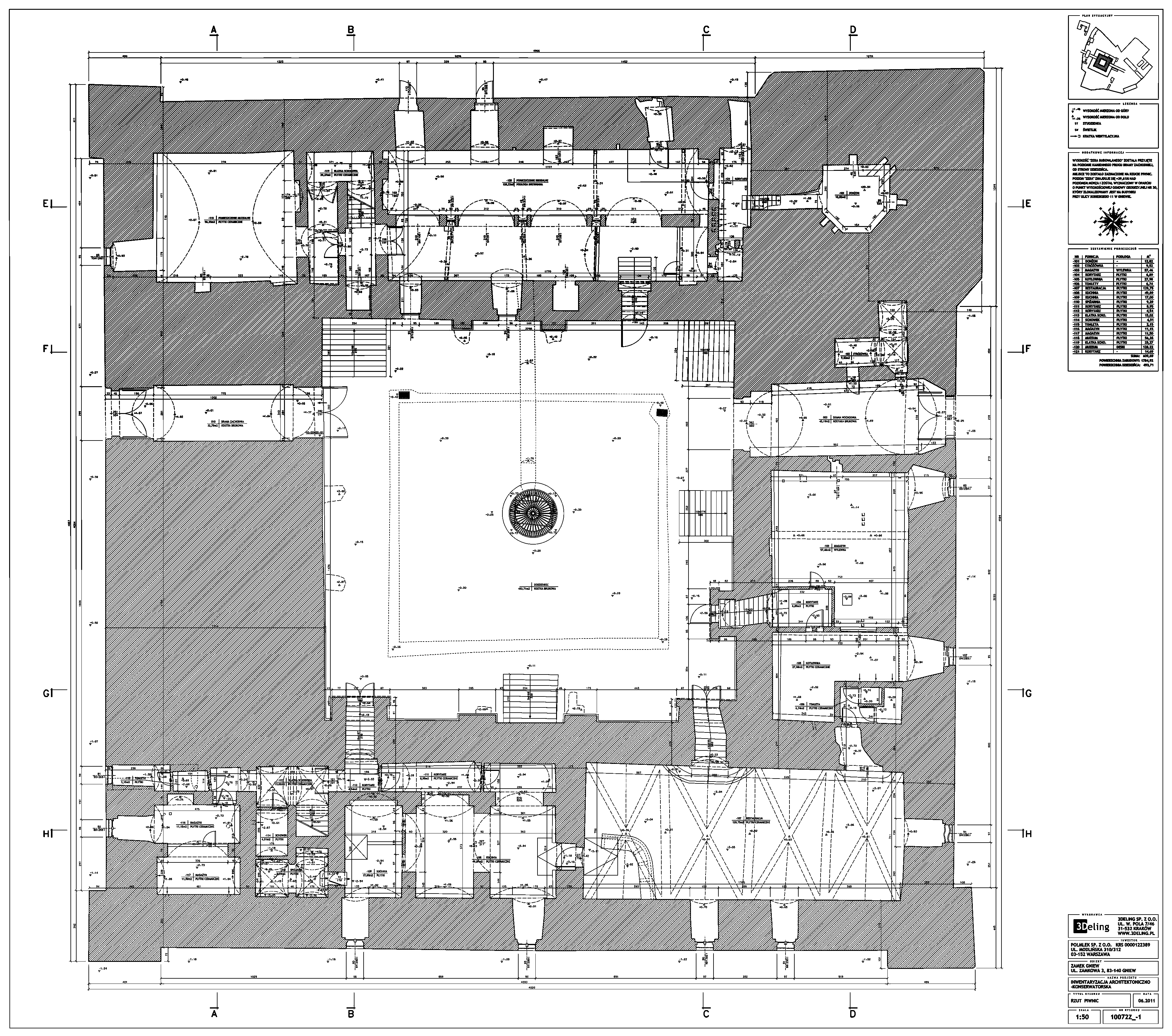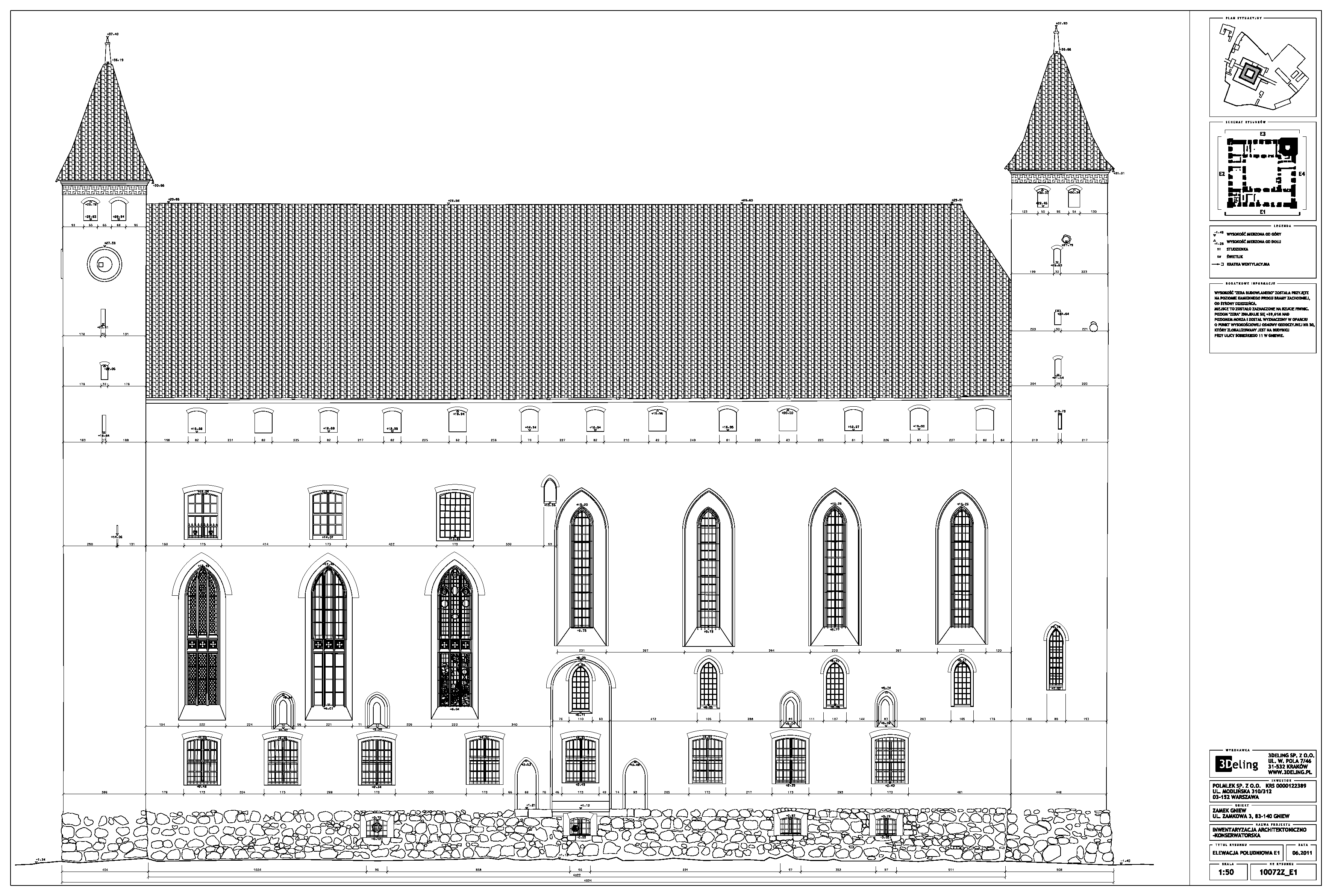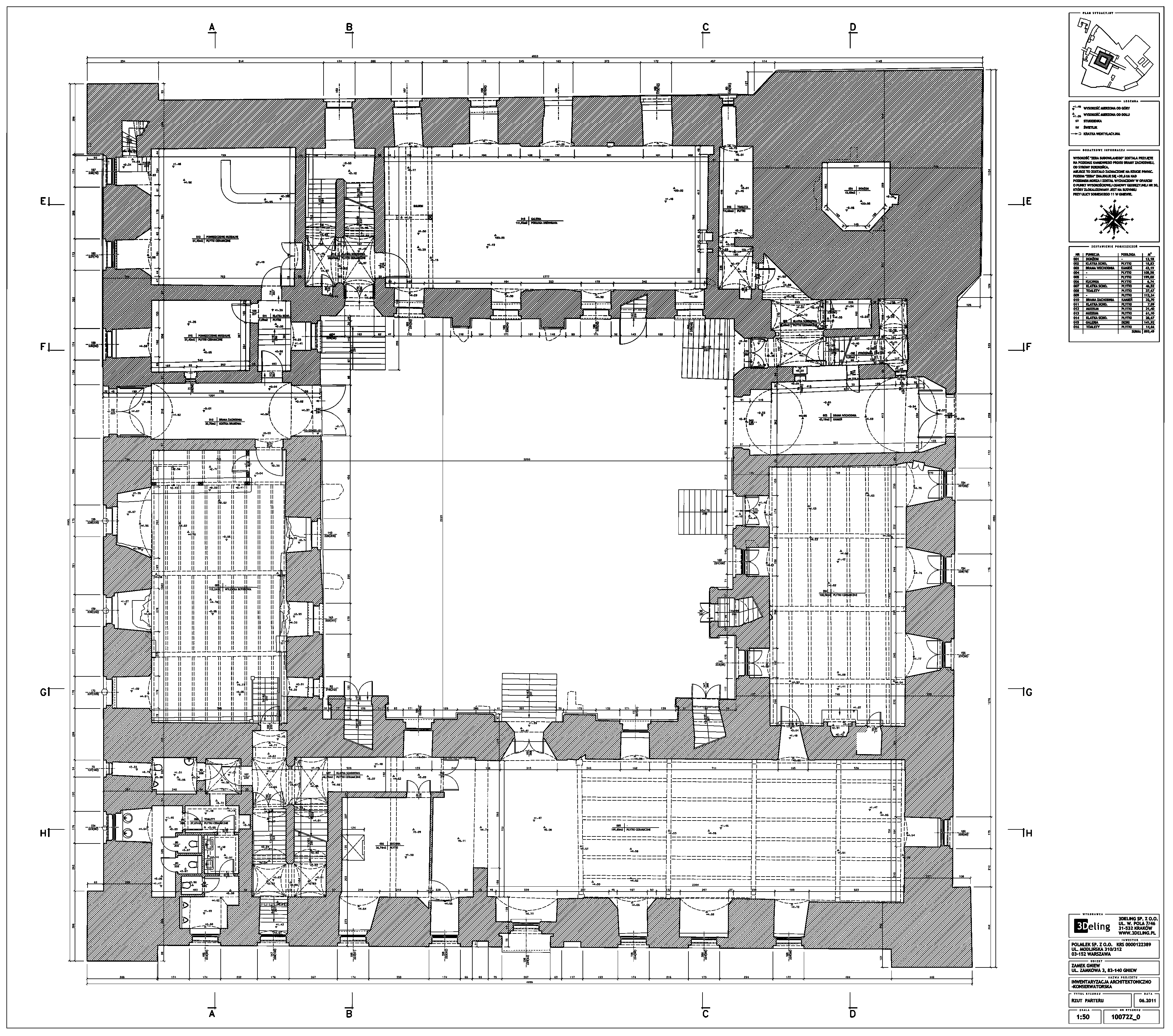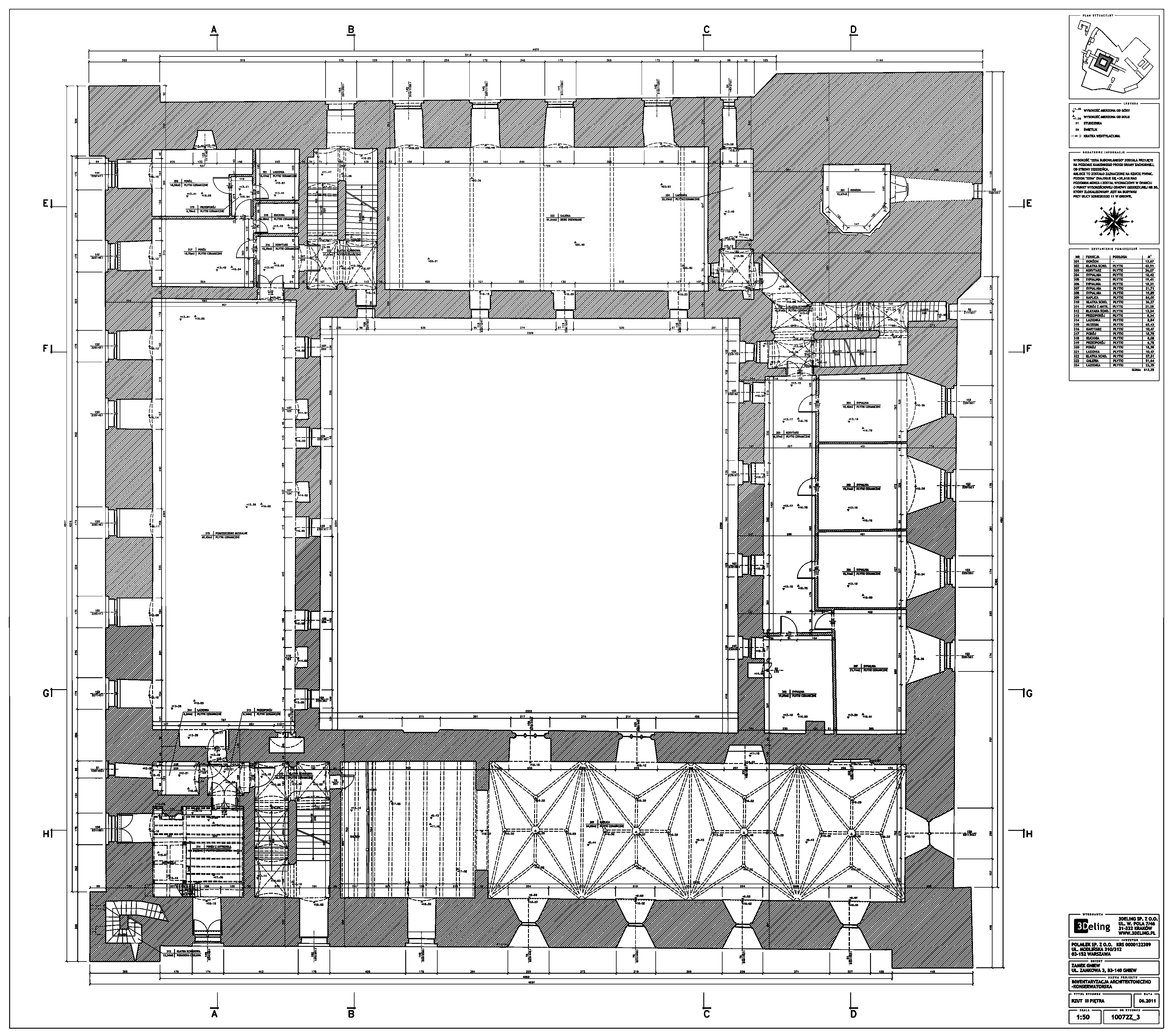 Im frühen Jahr 2011 erhielt 3Deling den Auftrag, die mittelalterliche Burg in Gniew, Polen, mittels Laser zu scannen. Die Gebäude wurden umfassend vom Keller bis zum Dachboden gescannt. Insgesamt wurden über 800 einzelne Scans in ein gemeinsames Koordinatensystem registriert. Die Punktwolke wurde dann genutzt, um einen umfassenden 2D-Datensatz für die Burg zu erstellen, einschließlich Grundrissen, Schnitten und Höhenzeichnungen.