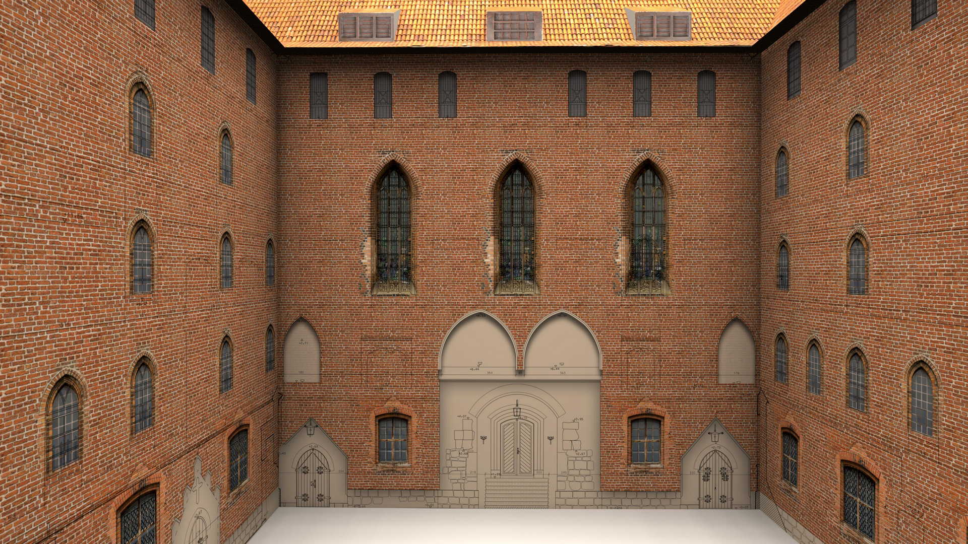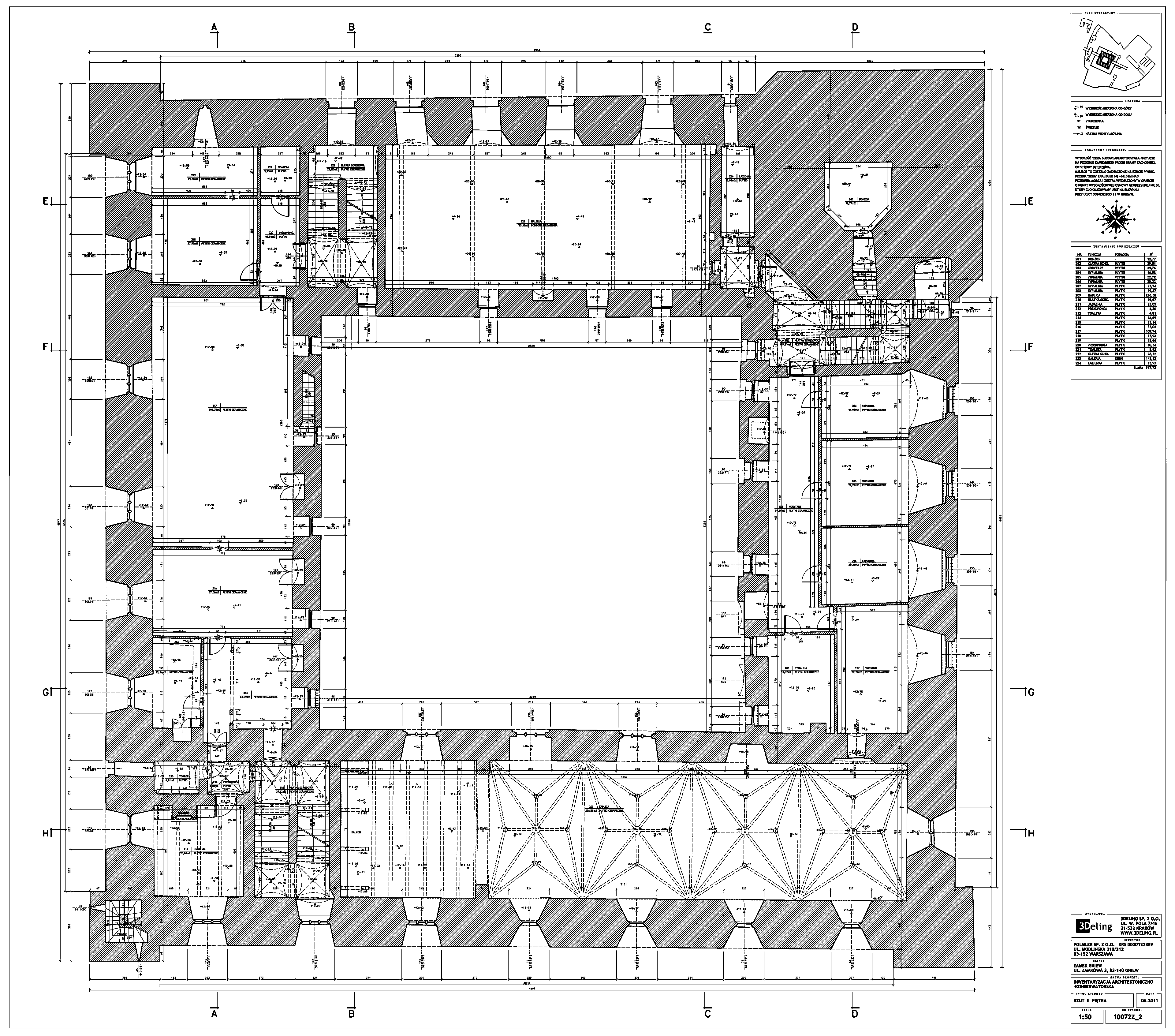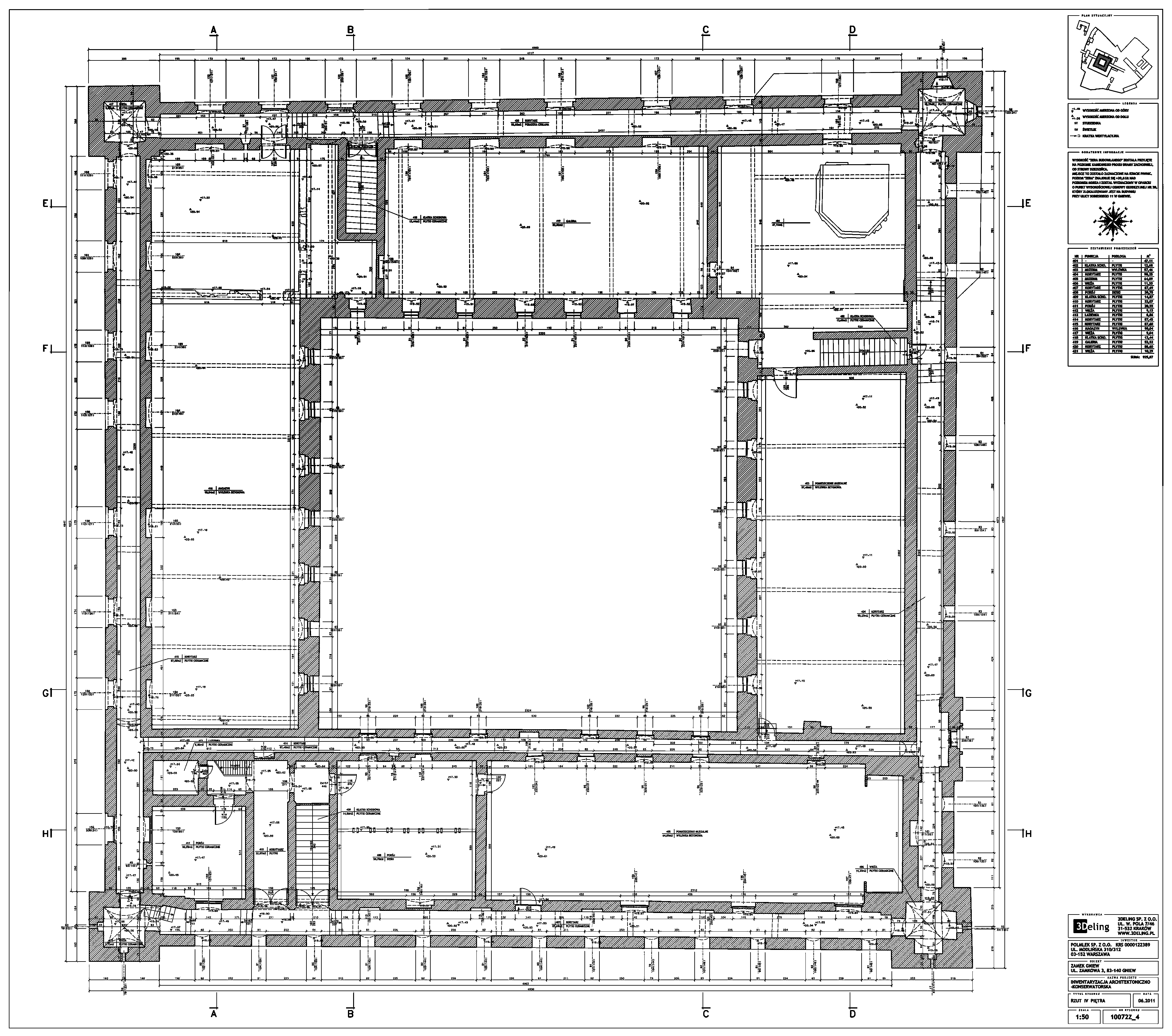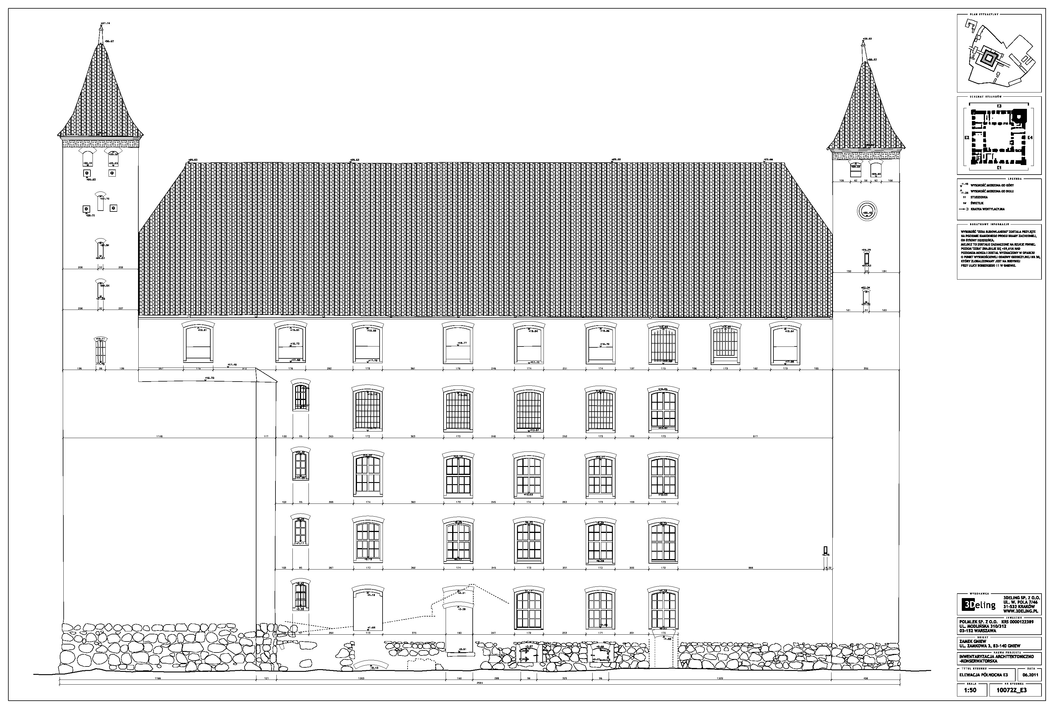 Im frühen Jahr 2011 erhielt 3Deling den Auftrag, die mittelalterliche Burg in Gniew, Polen, mittels Laser zu scannen. Die Gebäude wurden umfassend vom Keller bis zum Dachboden gescannt. Insgesamt wurden über 800 einzelne Scans in ein gemeinsames Koordinatensystem registriert. Die Punktwolke wurde dann genutzt, um einen umfassenden 2D-Datensatz für die Burg zu erstellen, einschließlich Grundrissen, Schnitten und Höhenzeichnungen.